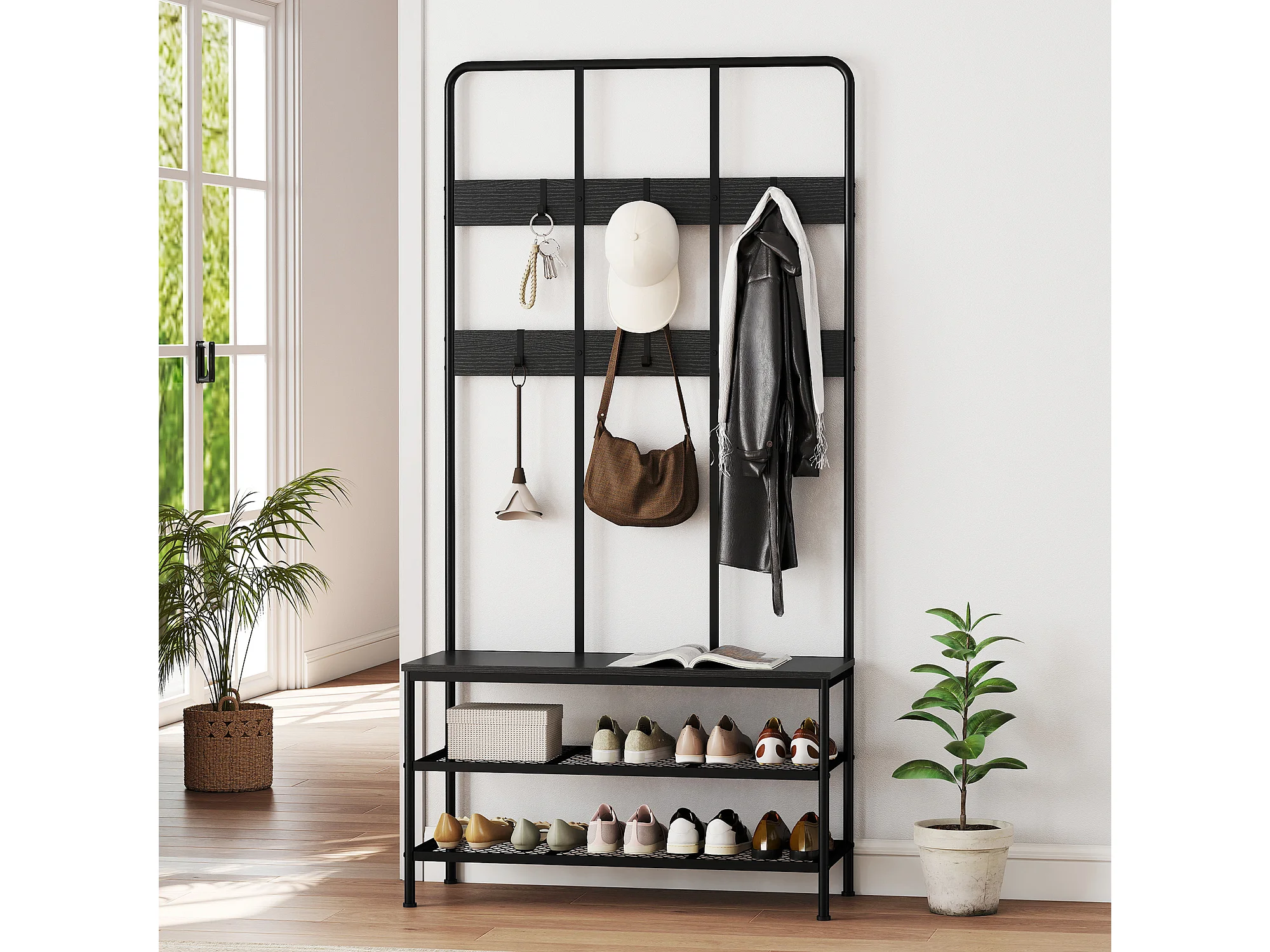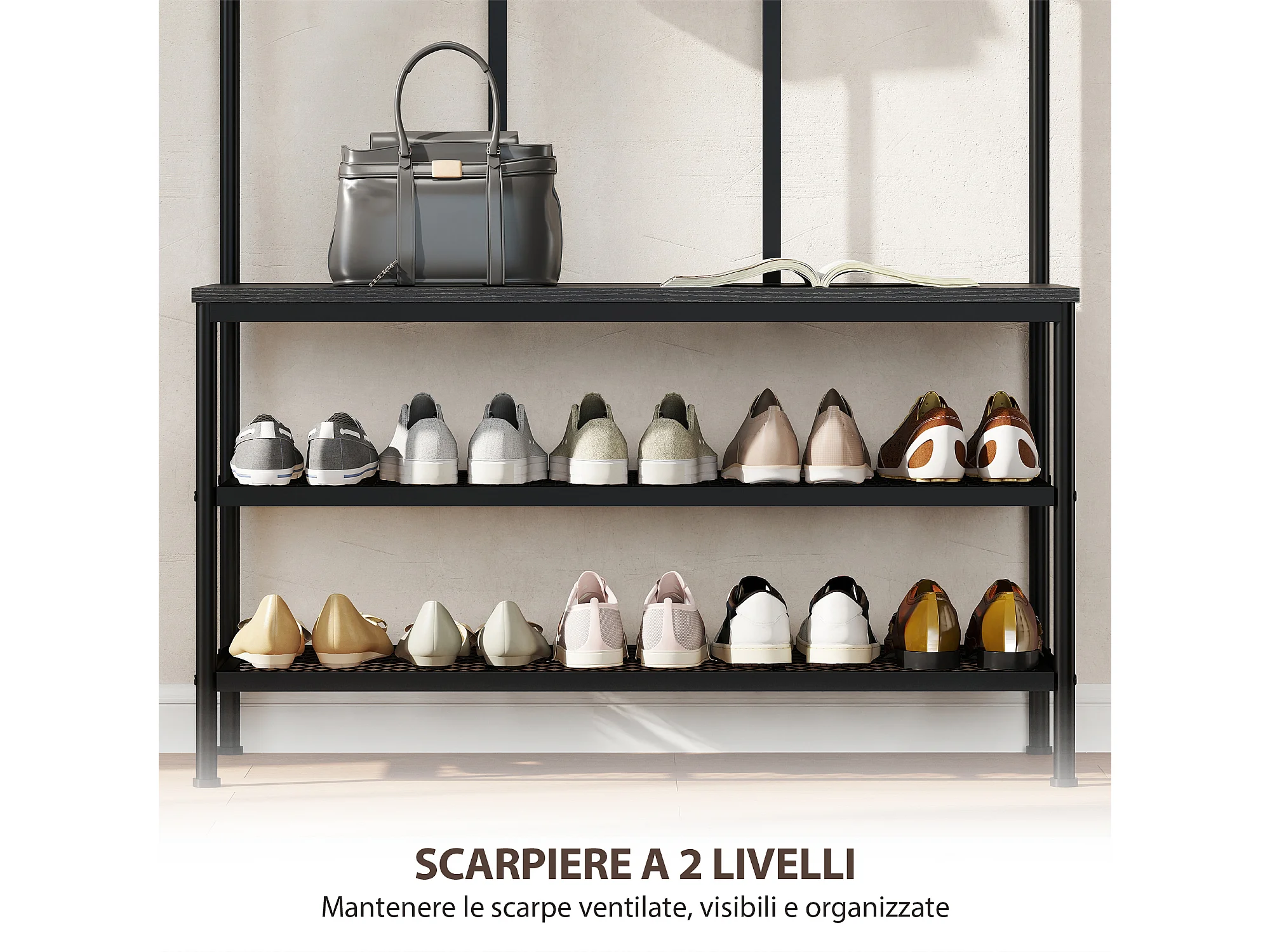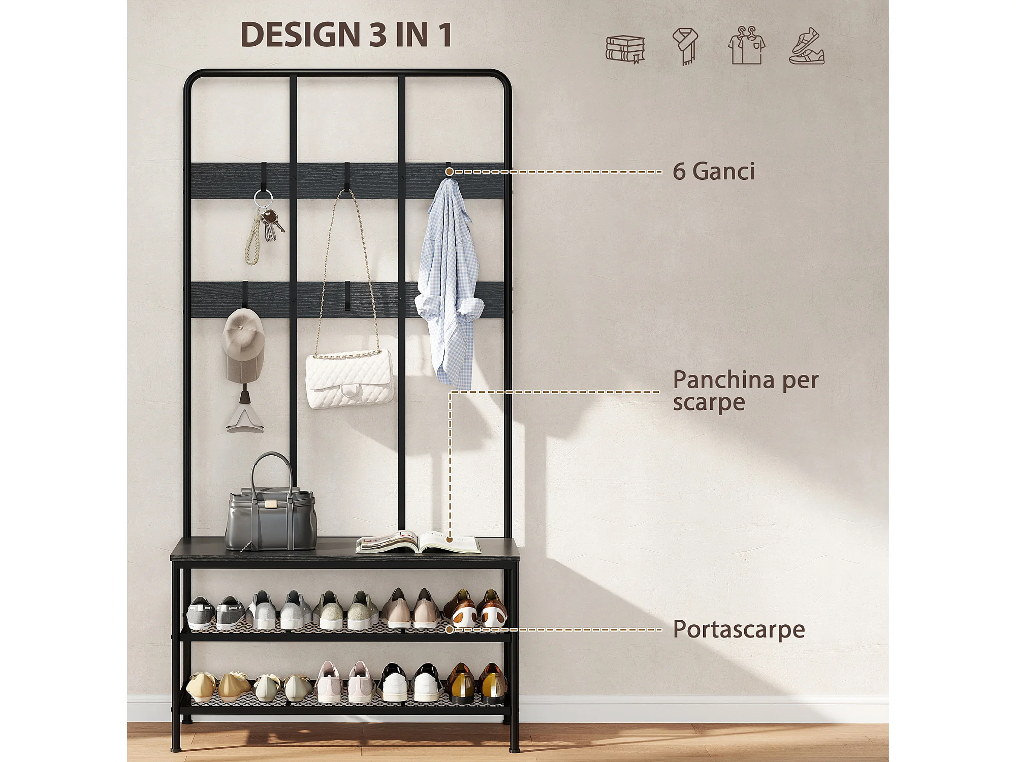 Appendiabiti da ingresso 3 in 1 con scarpiera attaccapanni stile industriale con panca