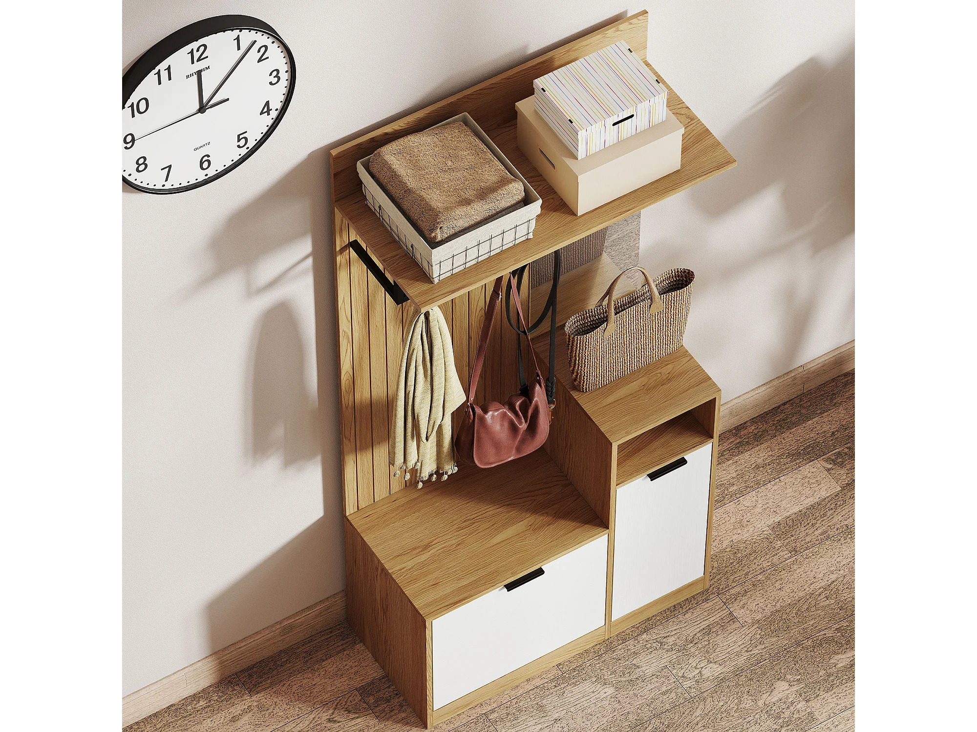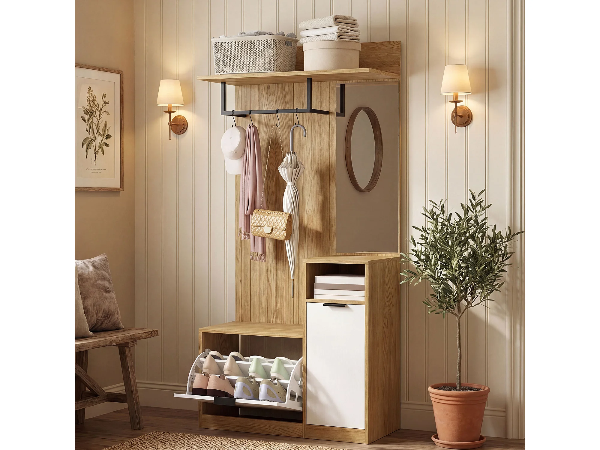 Appendiabiti da ingresso con panca e scarpiera in mdf rovere e bianco