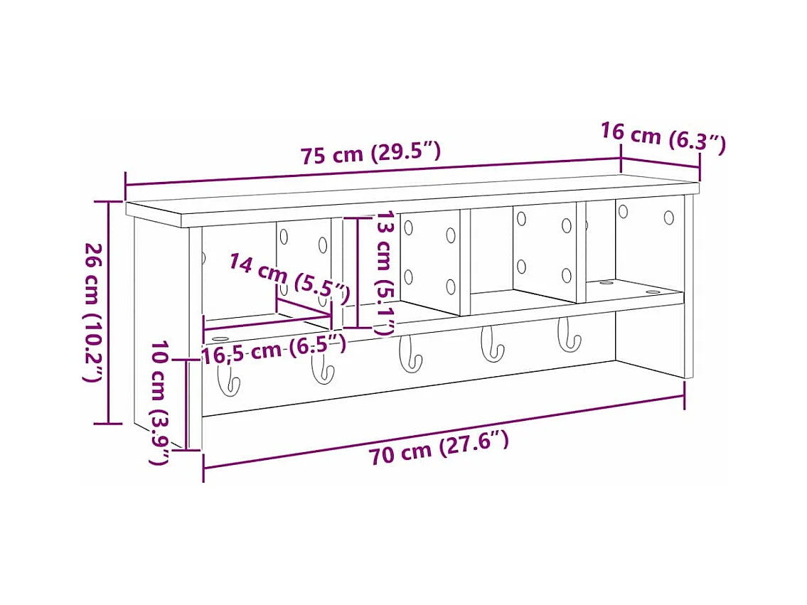 Appendiabiti da parete con ripiano in rovere Sonoma 75 x 16 x 26 cm