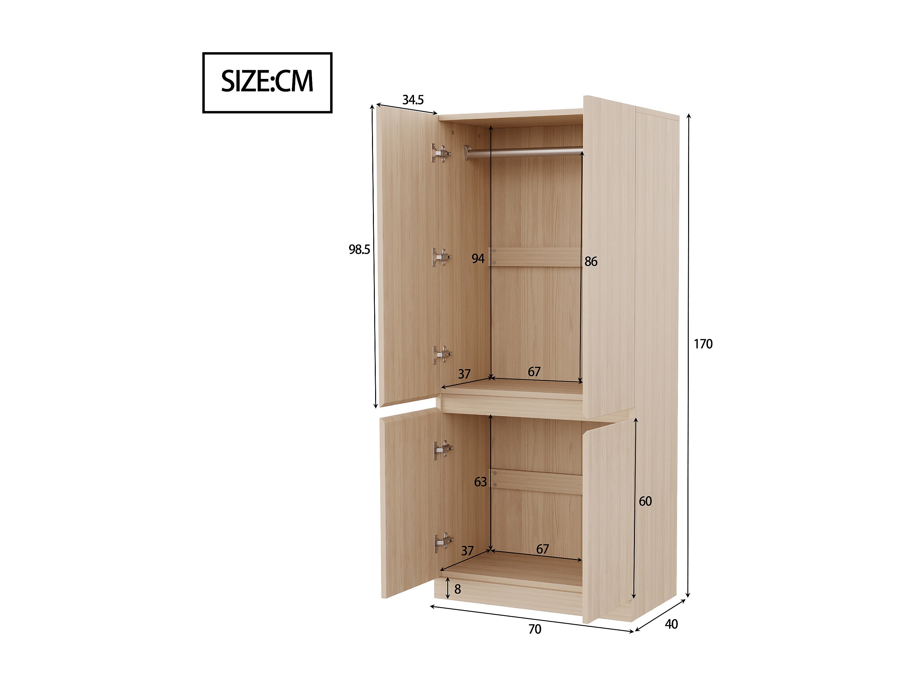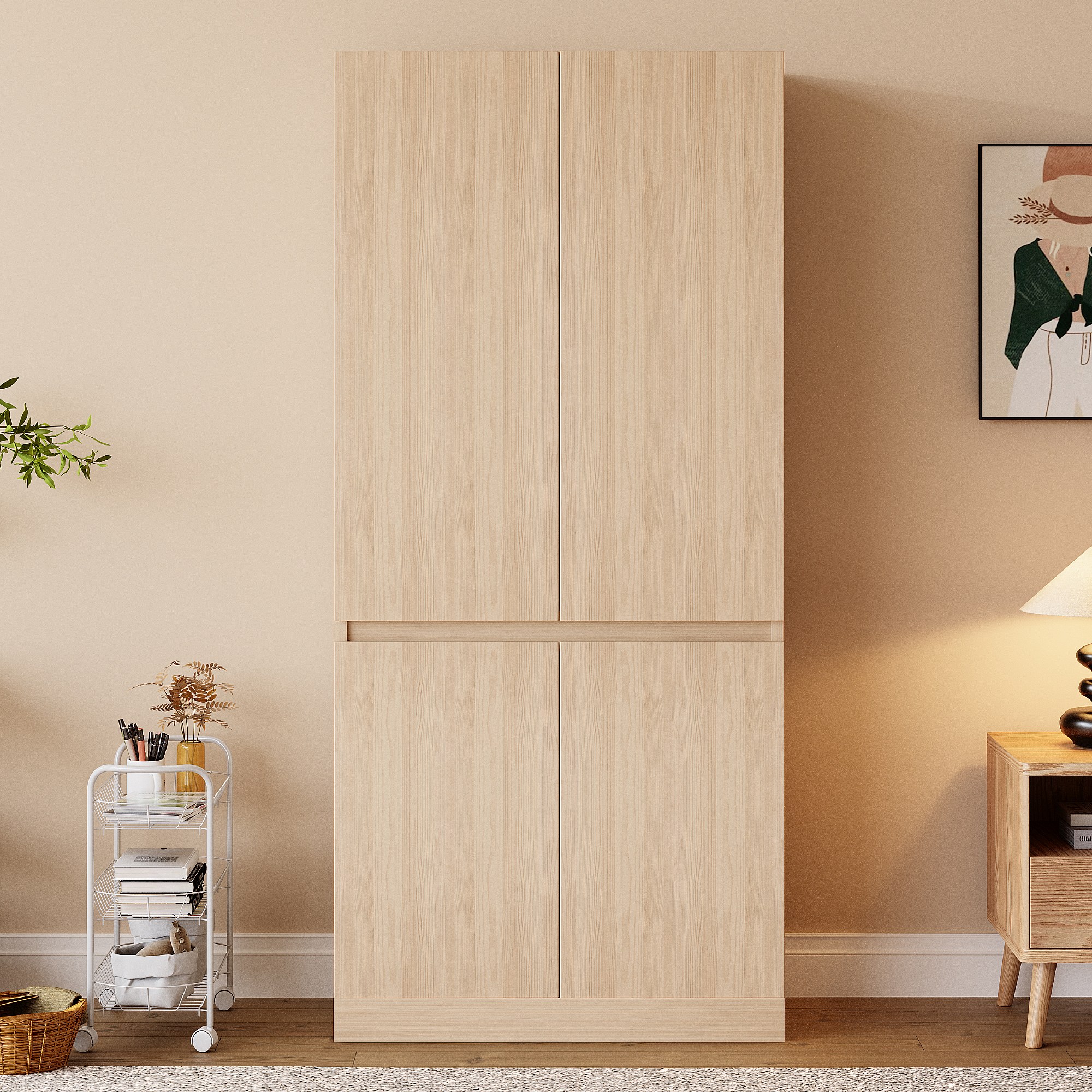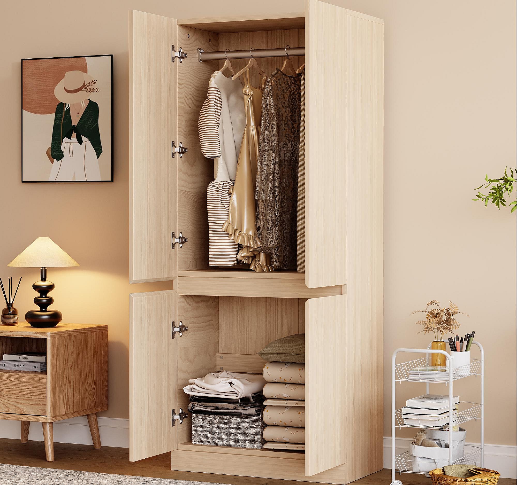 Armadio 70x40x170 cm - 4 ante - con asta per appendere abiti - Naturale