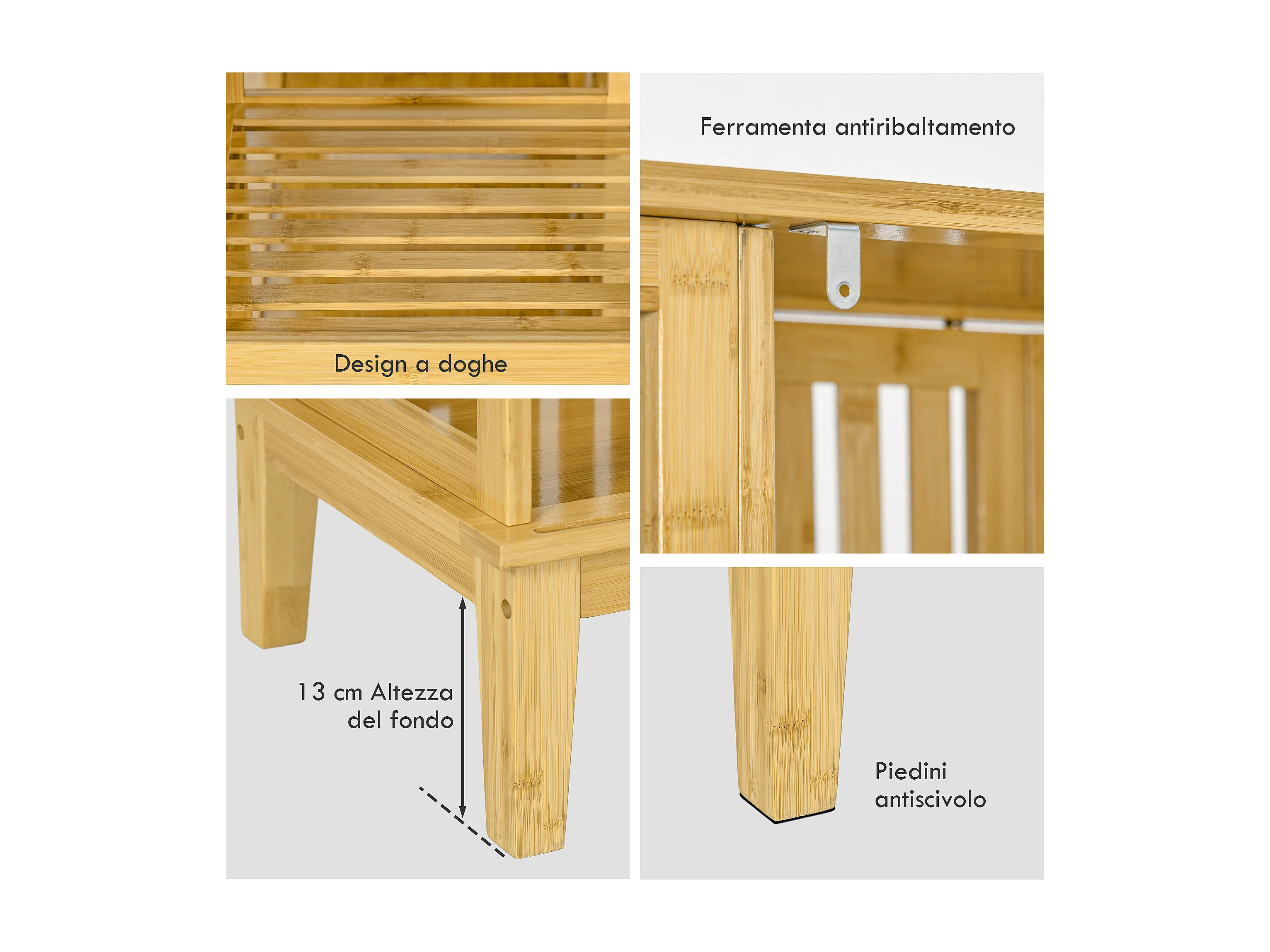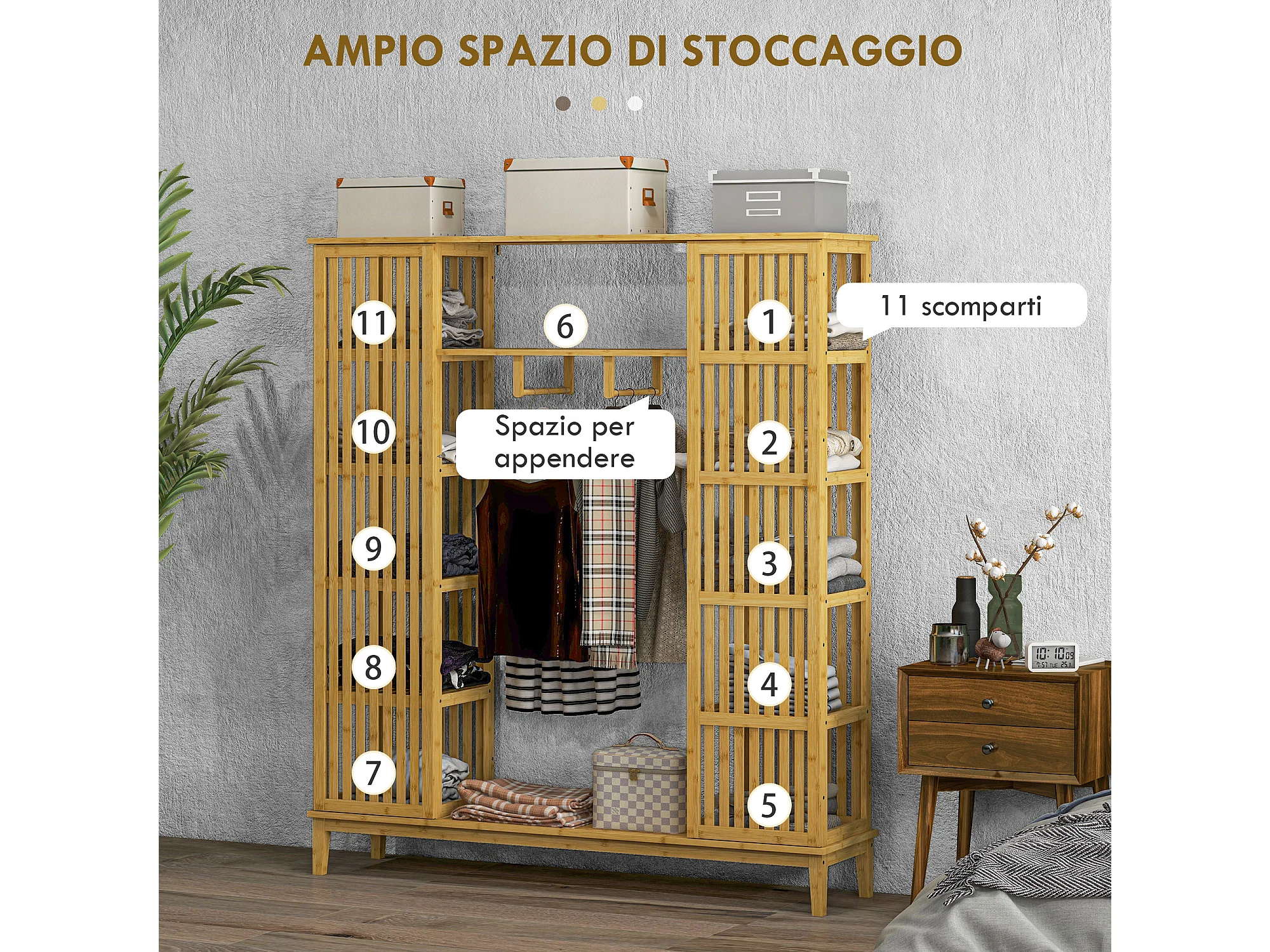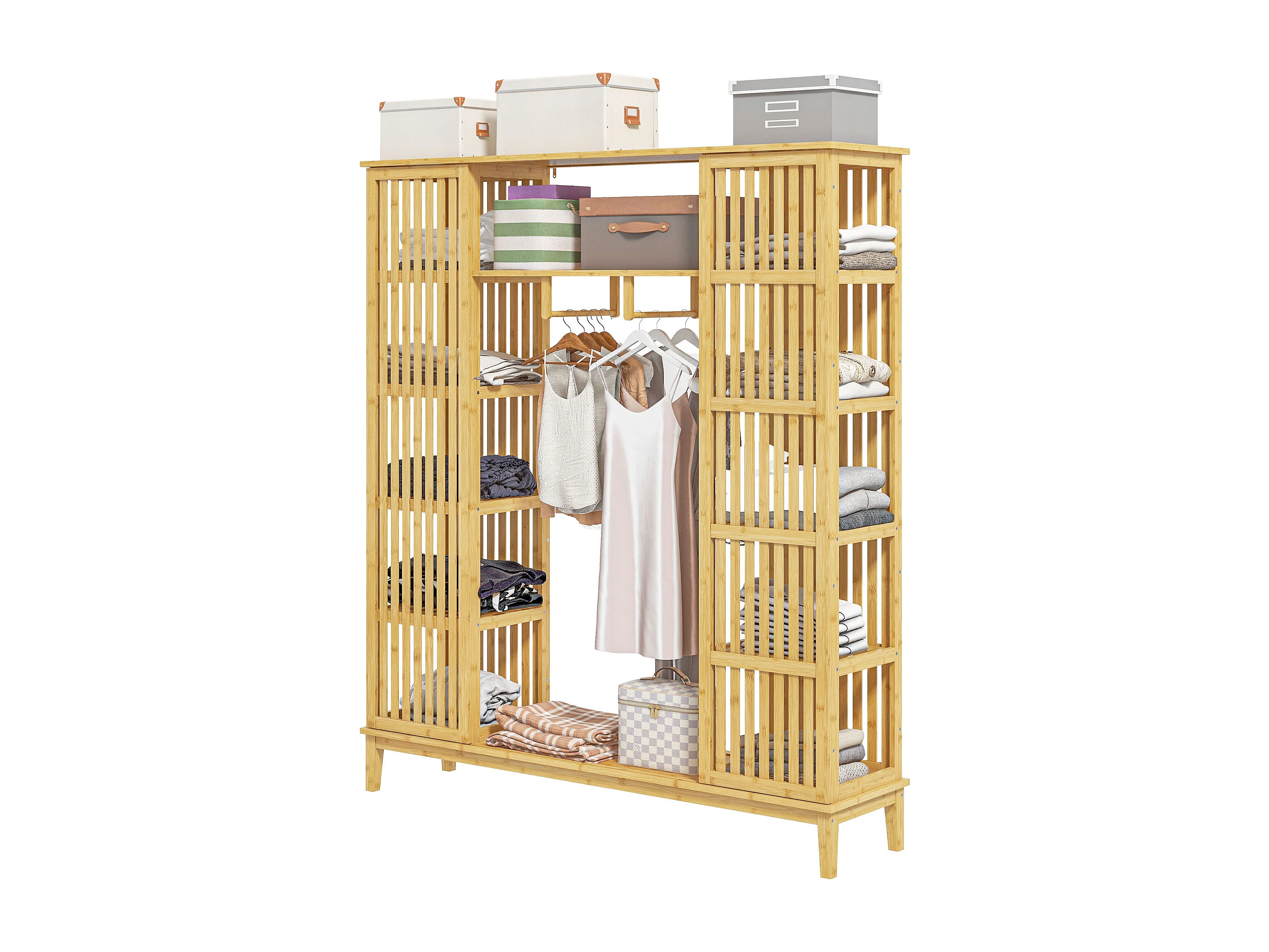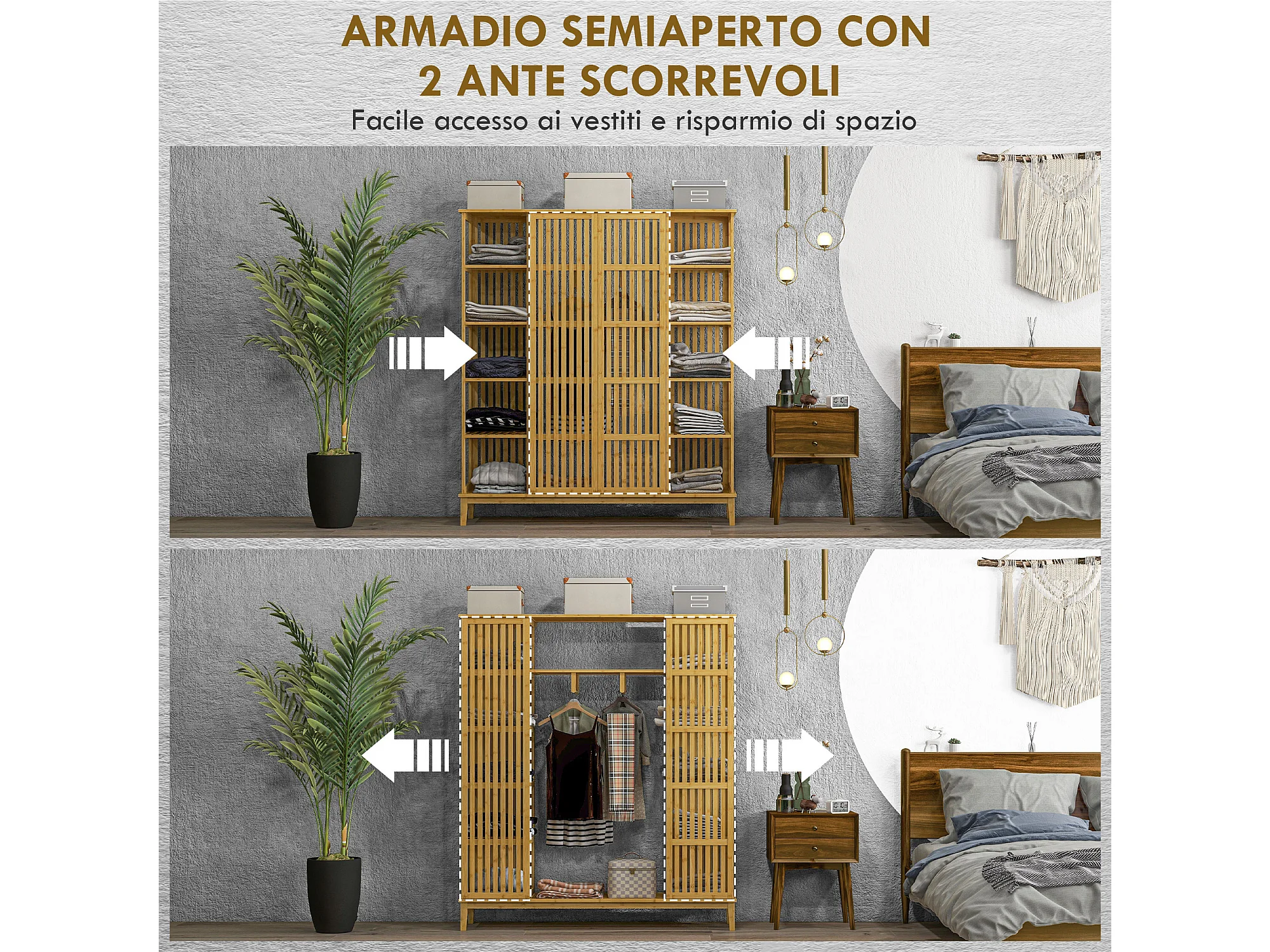 Armadio aperto con 2 ante scorrevoli e ripiani aperti in bambù
