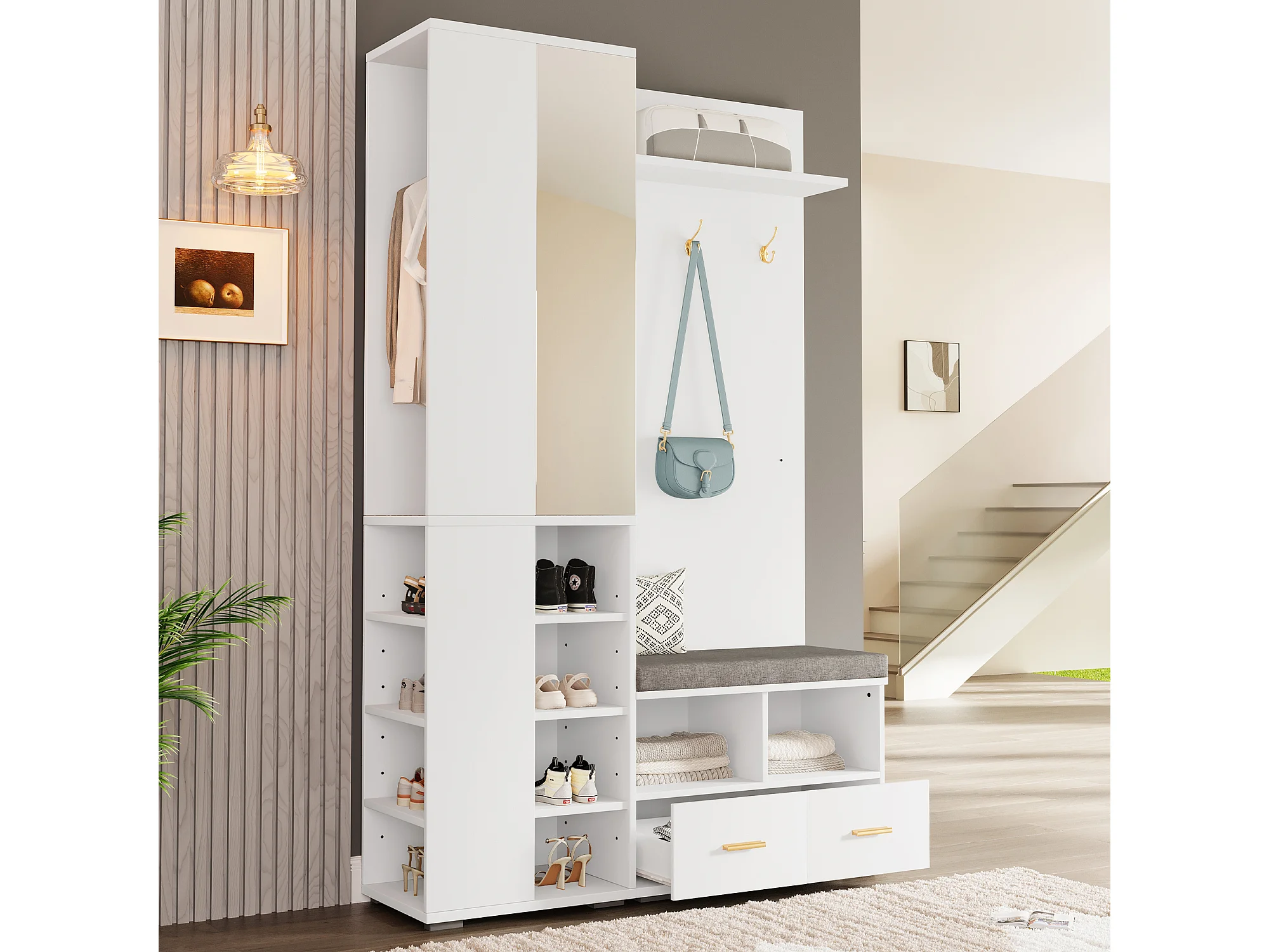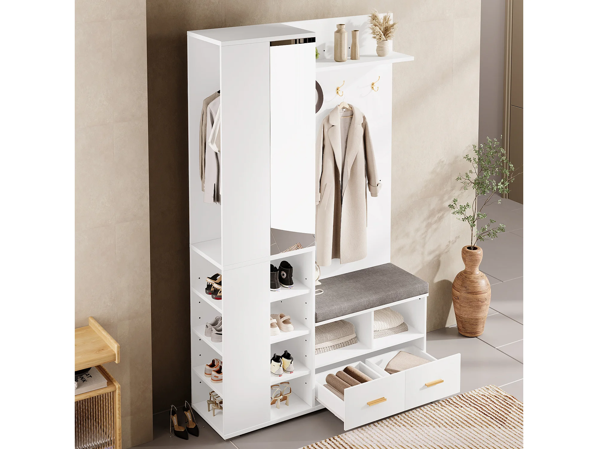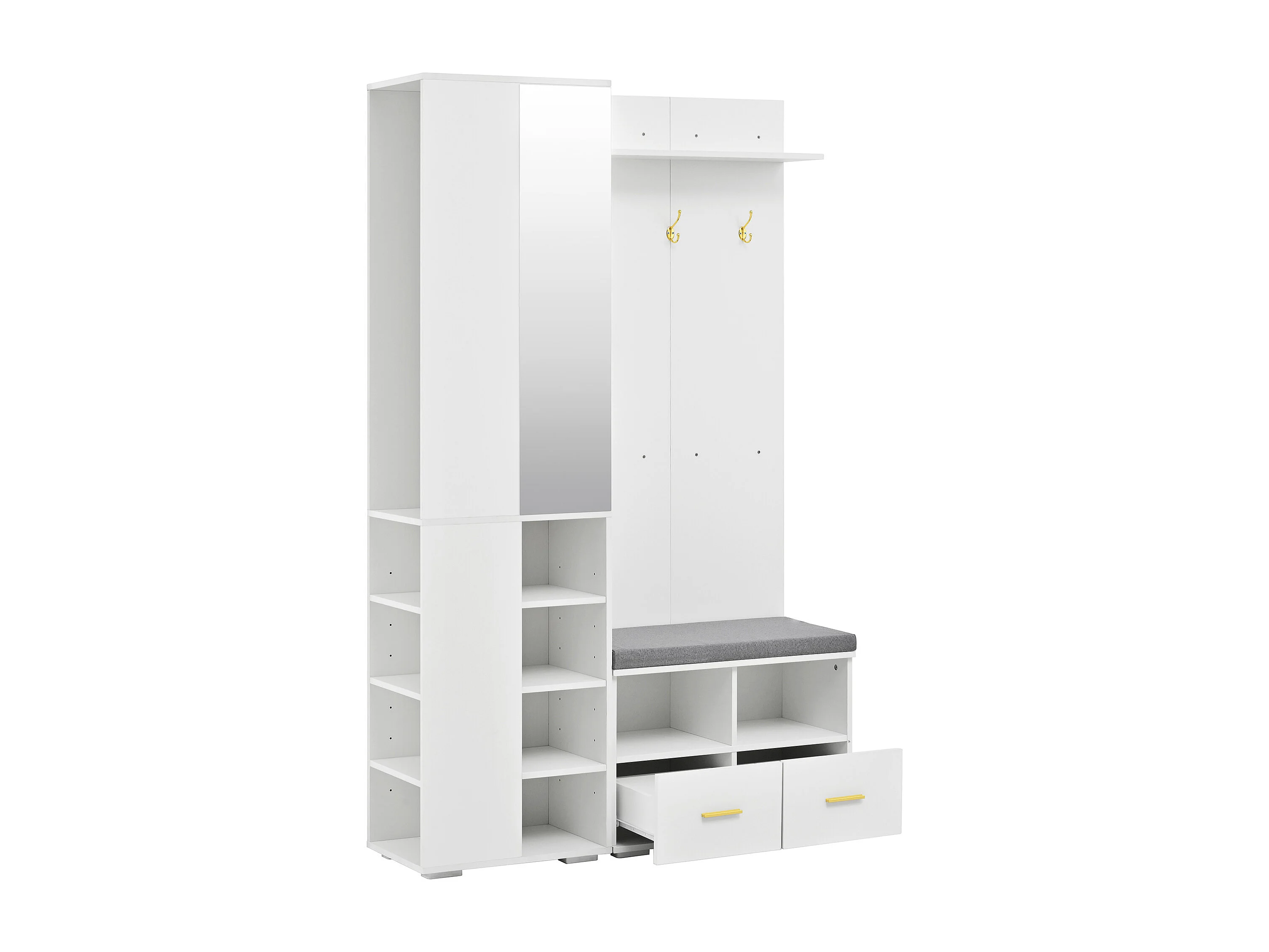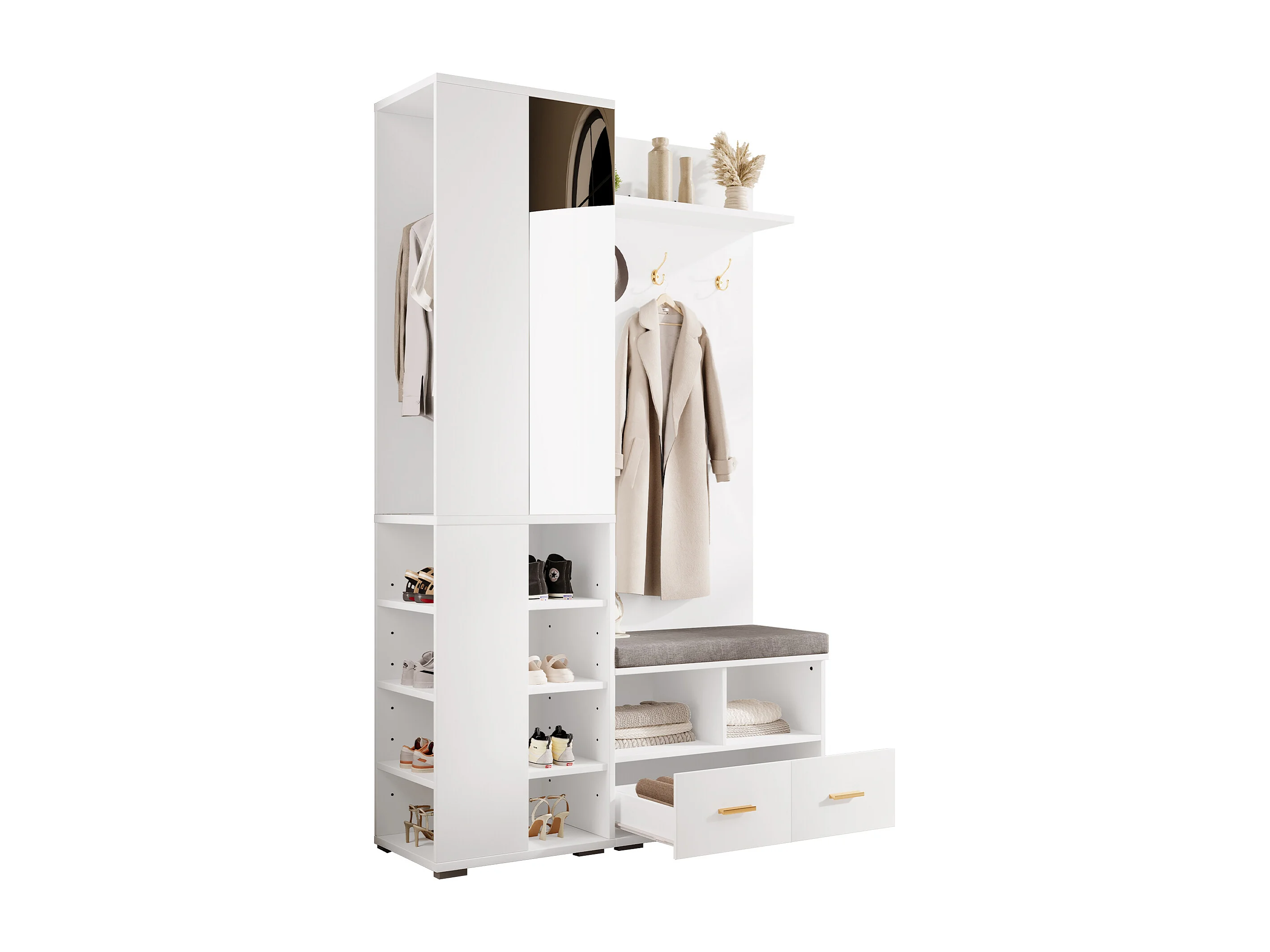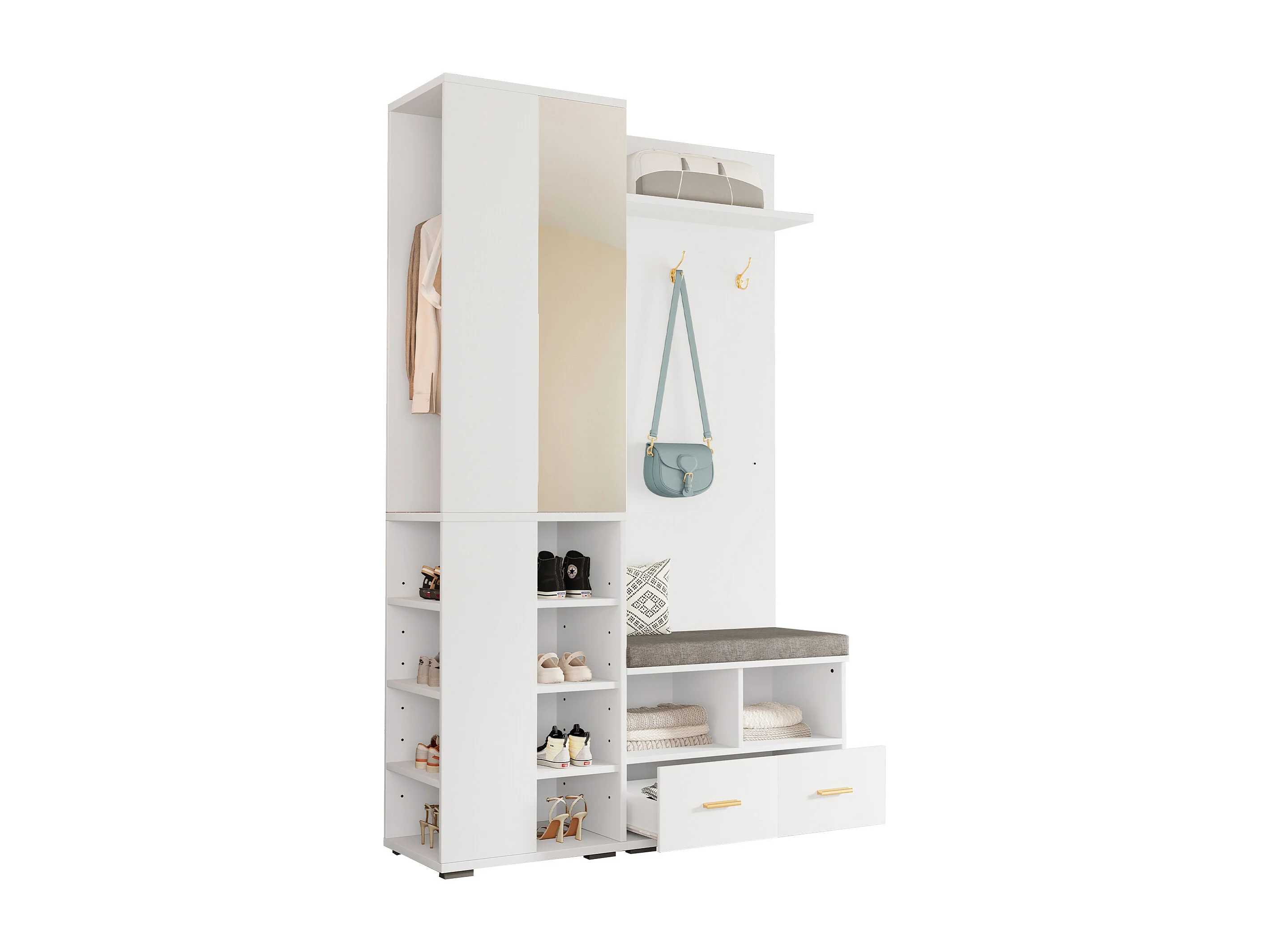 Armadio bianco con specchio, asta appendiabiti, panca e 2 cassetti 120x35x190 cm