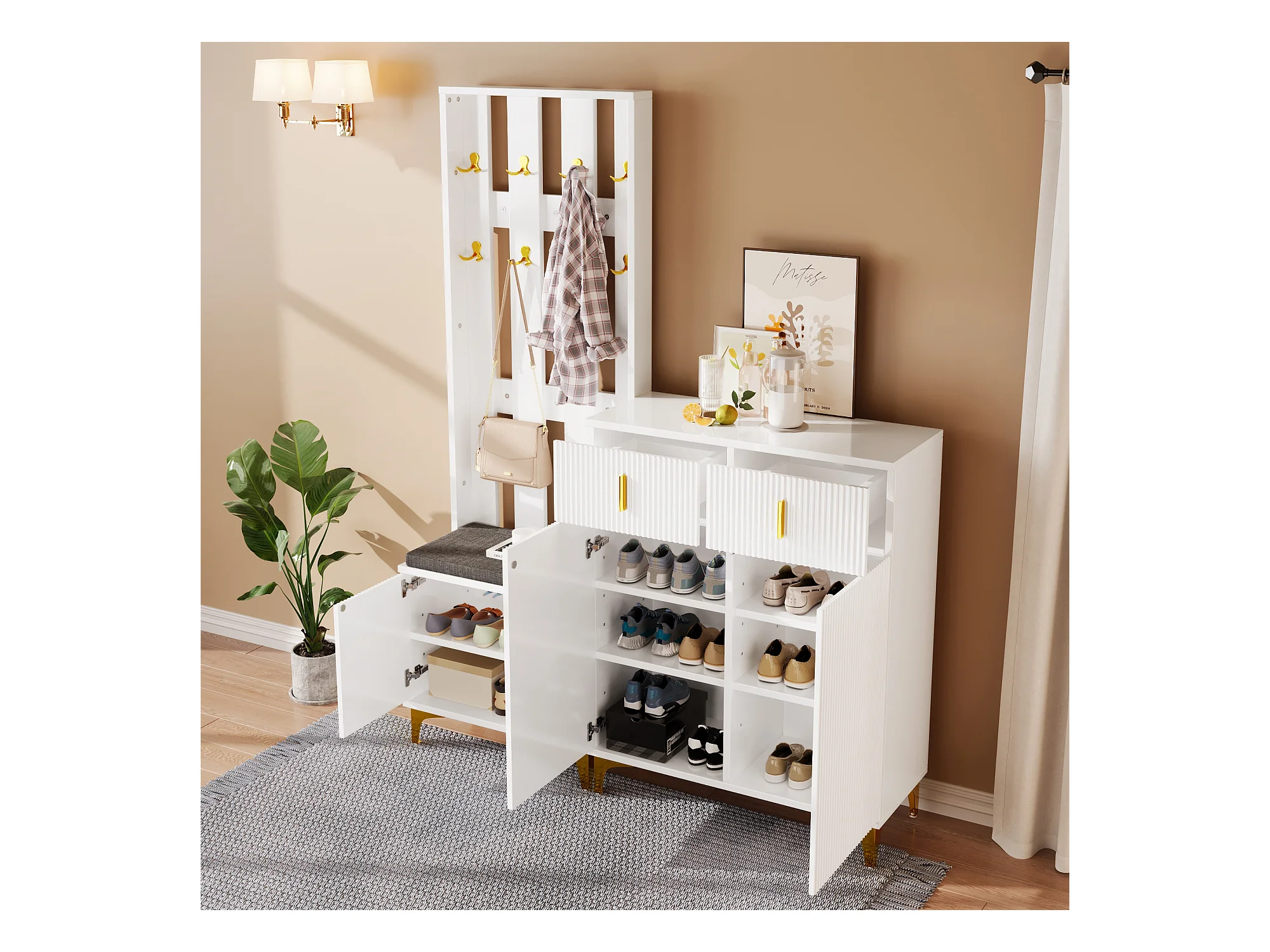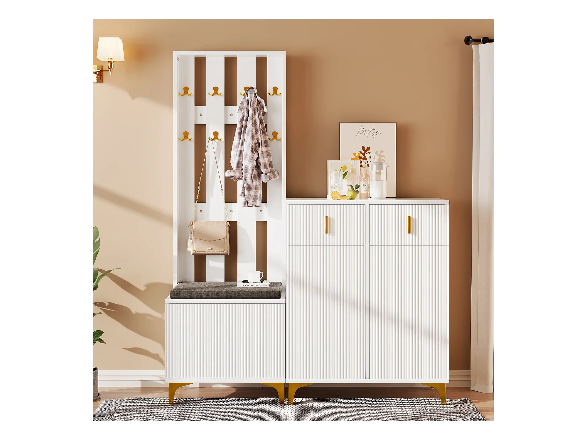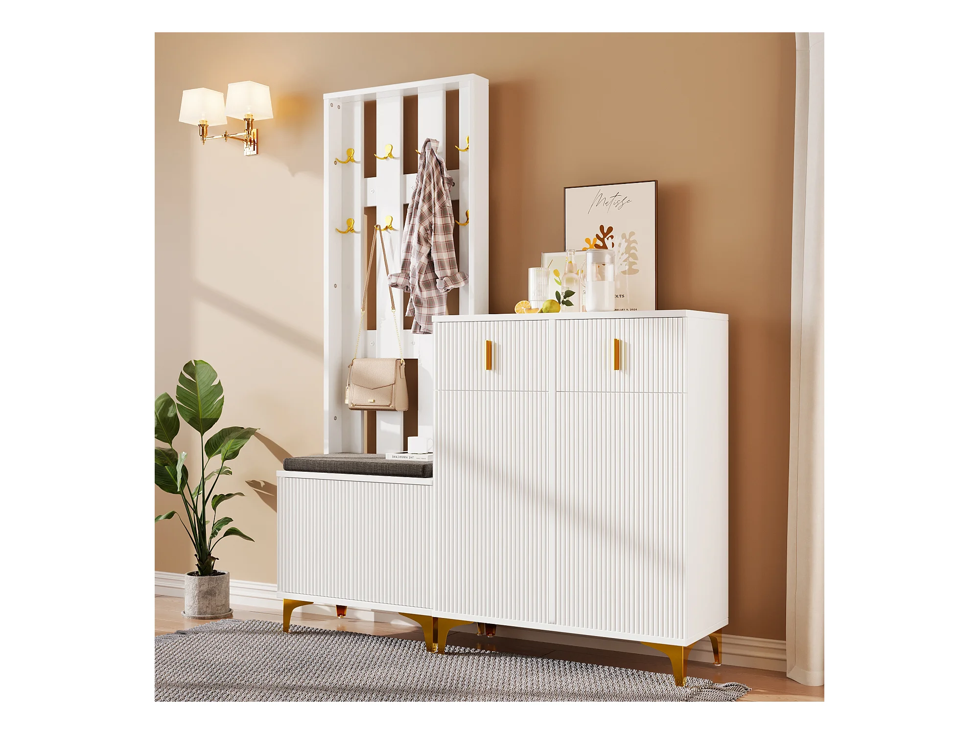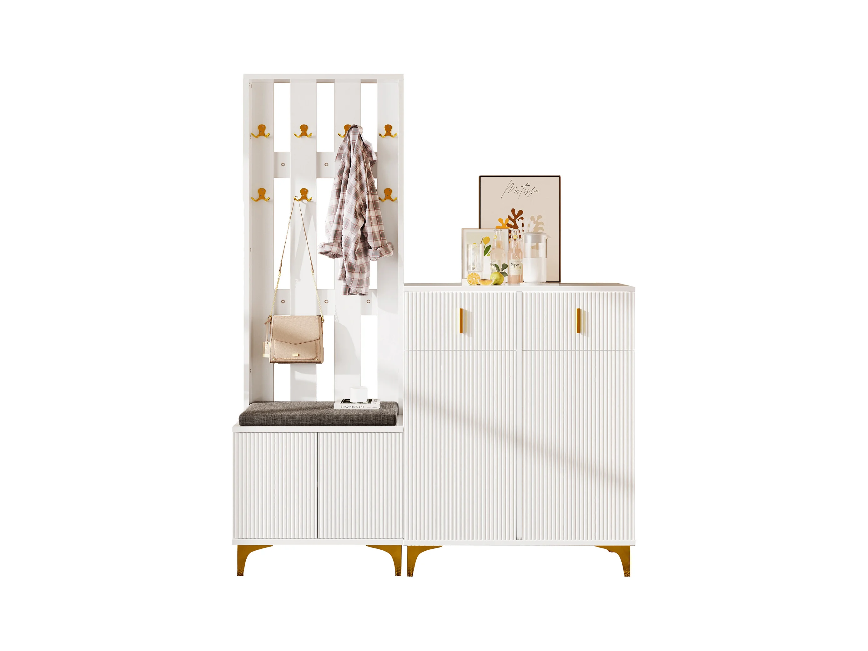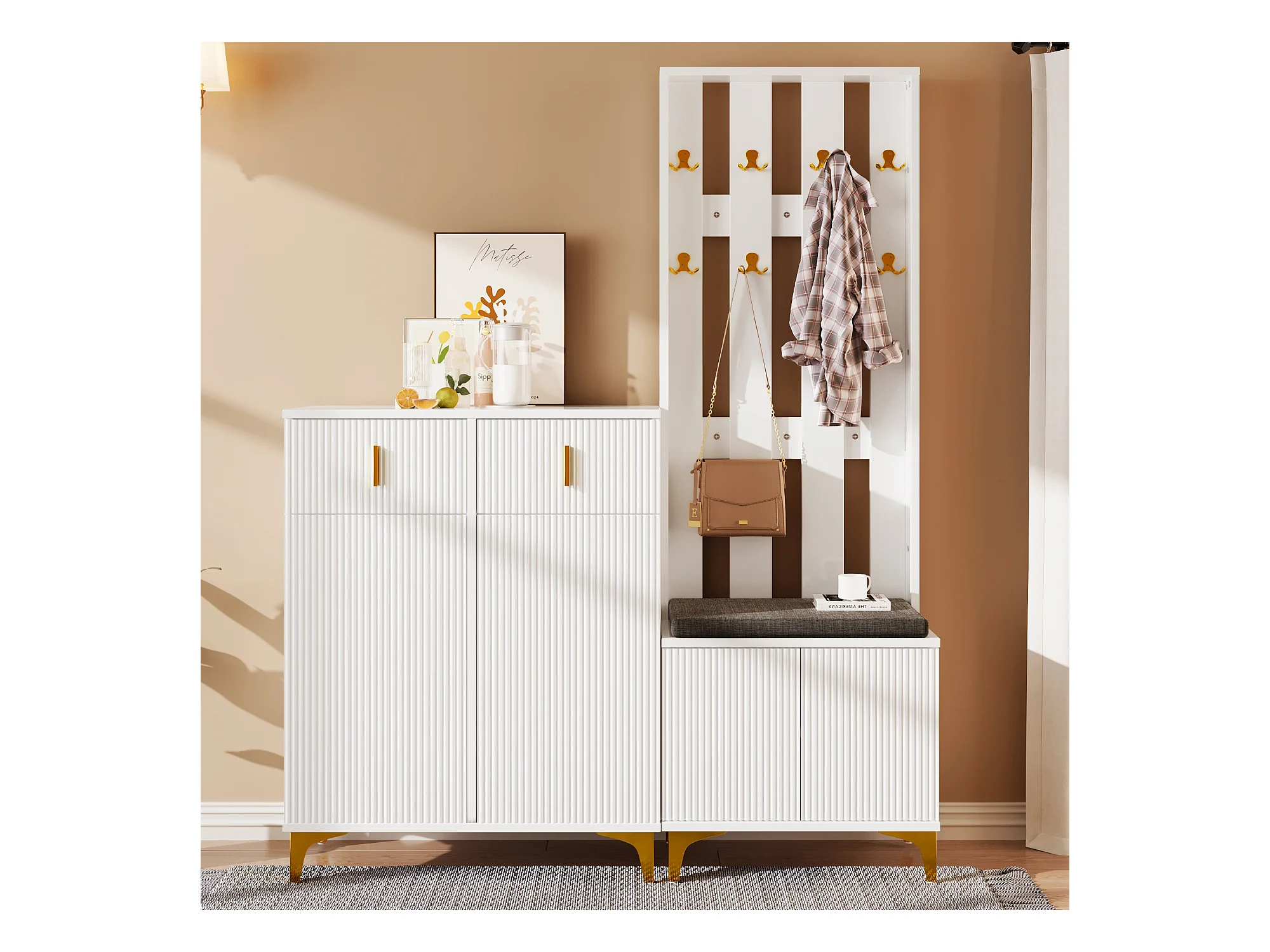 Armadio combinato con panca portascarpe e cuscino, design moderno, truciolato, bianco, ganci dorati (60,5x180,5x35,2 cm)