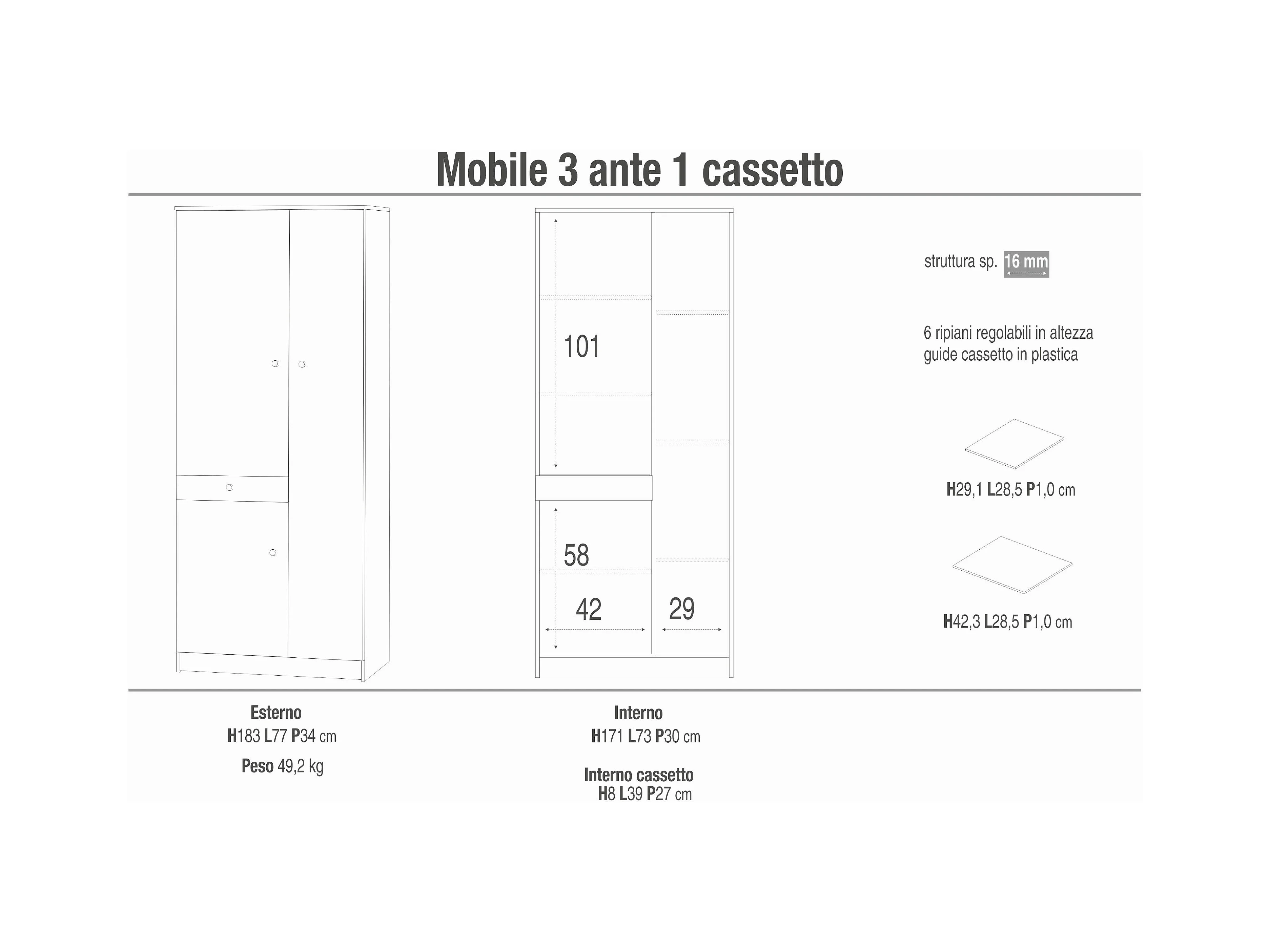 MilaniHome.it - armadio compatto con tre ante e un cassetto di design essenziale cm 77 l x 34 p x 183 hdi coloreBeige