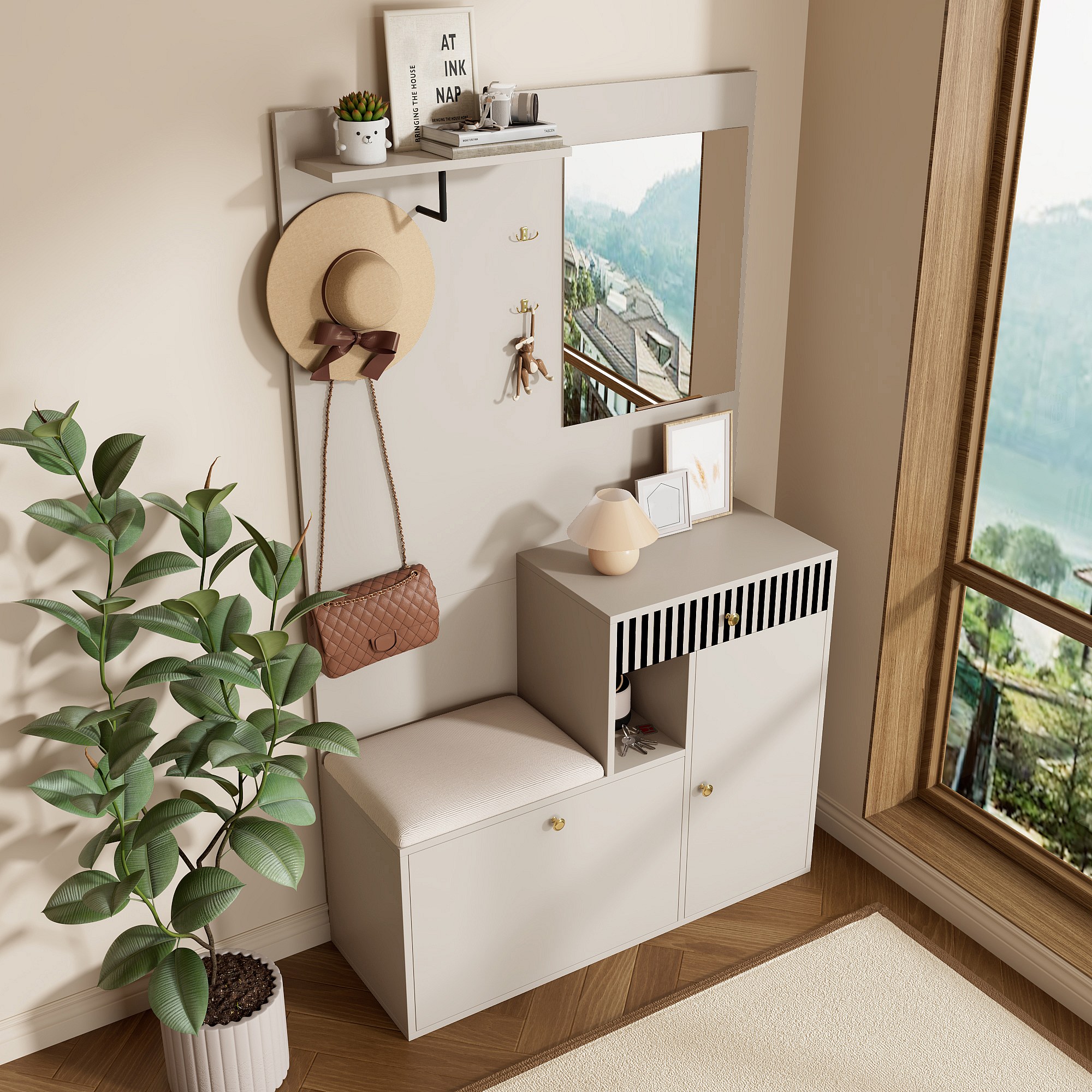 Appendiabiti in legno con specchio - Guardaroba con scarpiera e ganci - 2 cassetti e 1 anta - vano portaoggetti aperto
