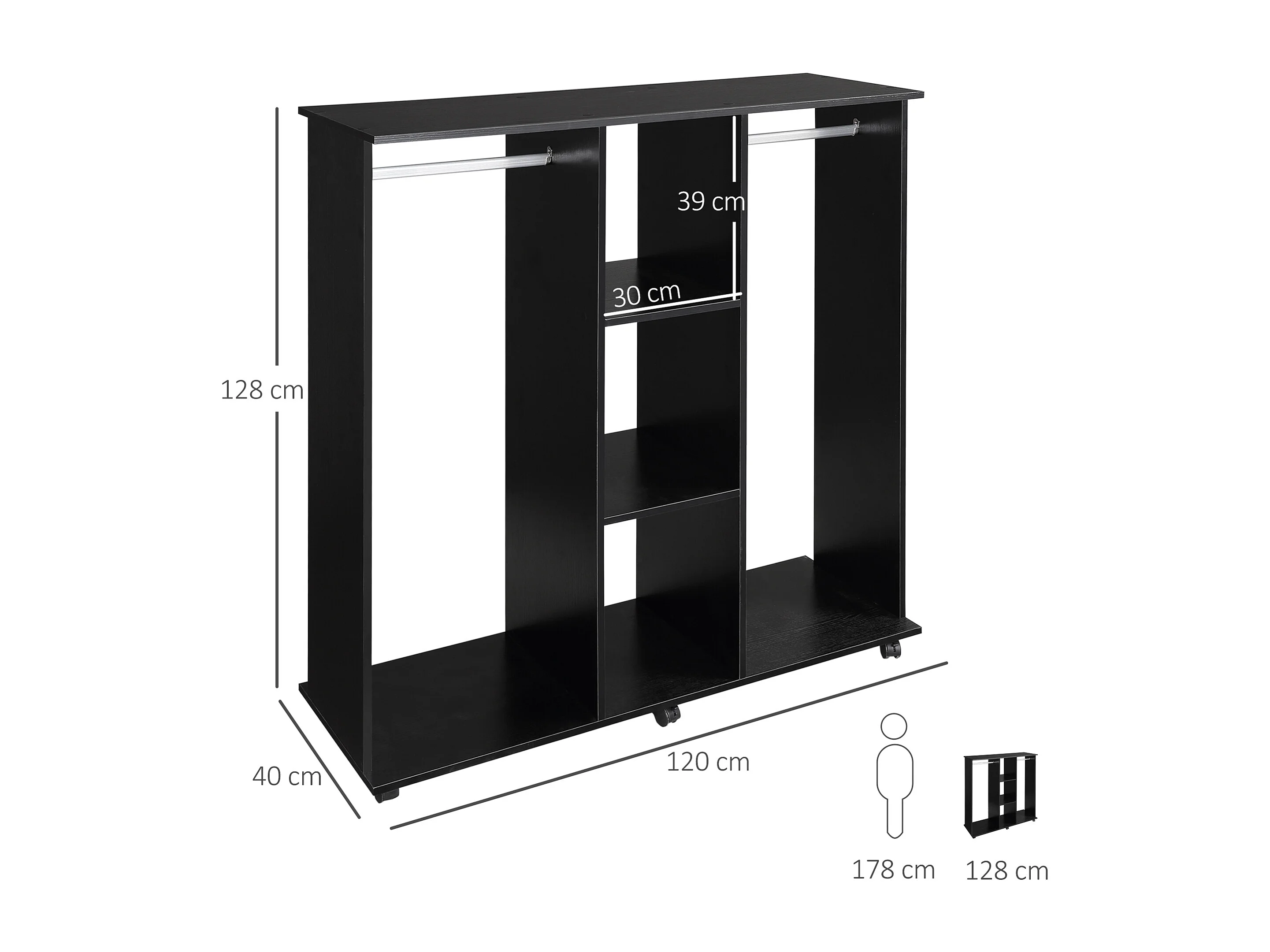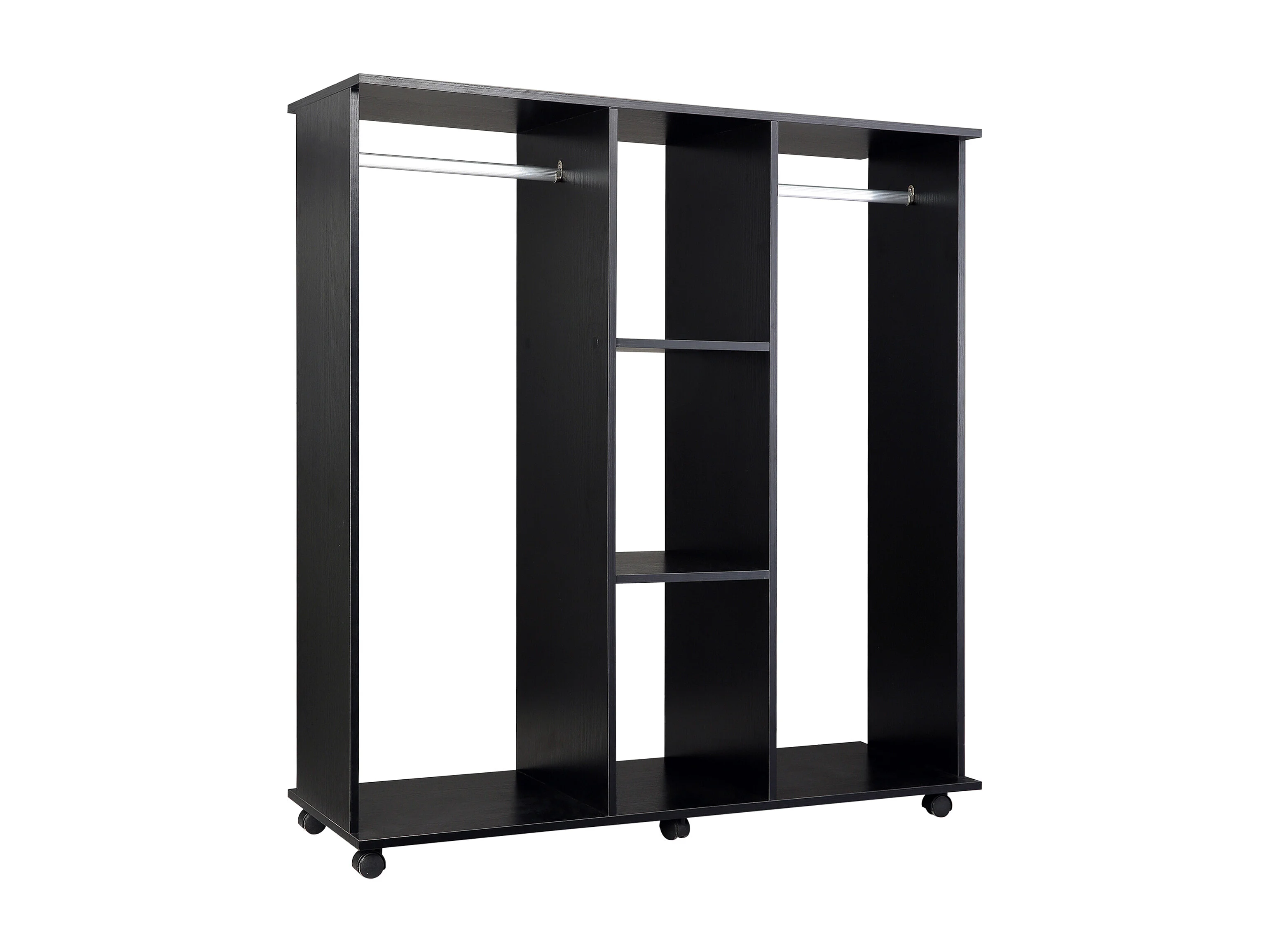 Armadio con 2 appendiabiti ripiani e ruote in legno e alluminio nero