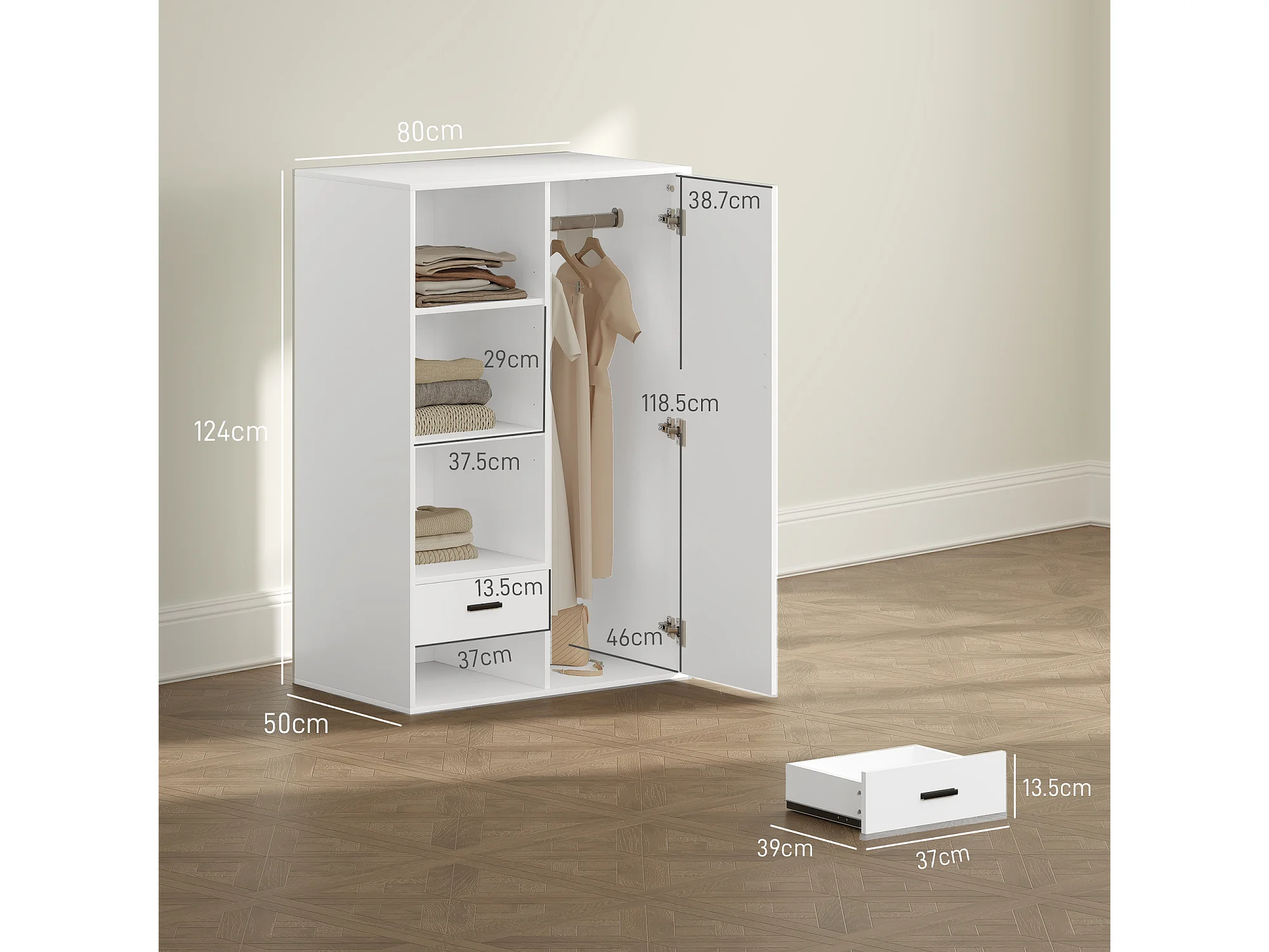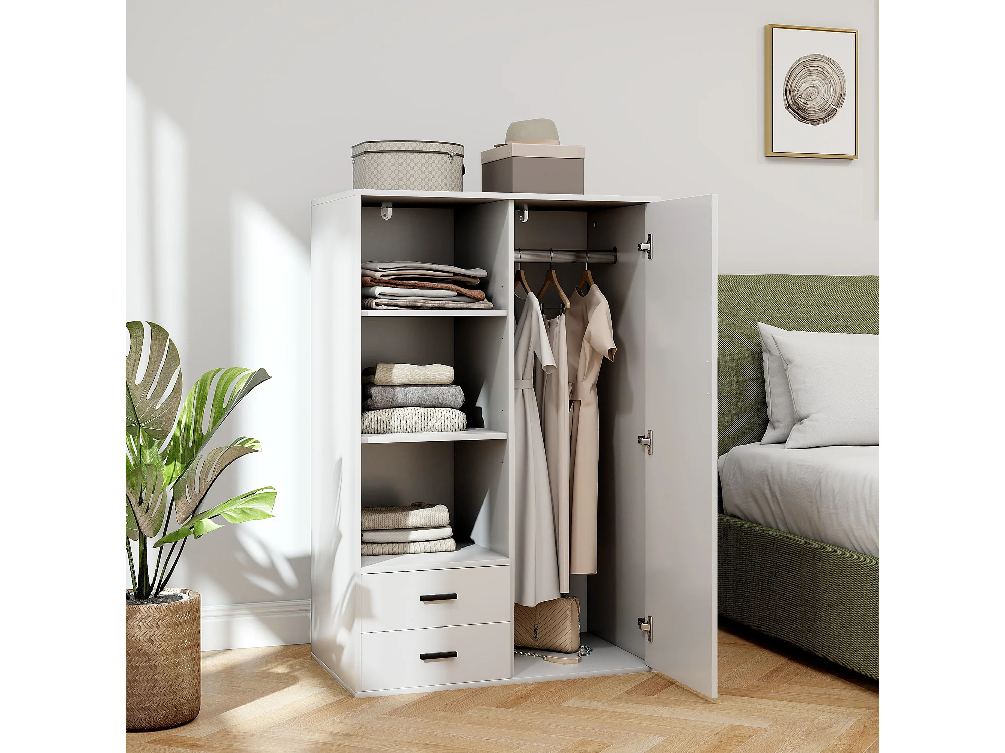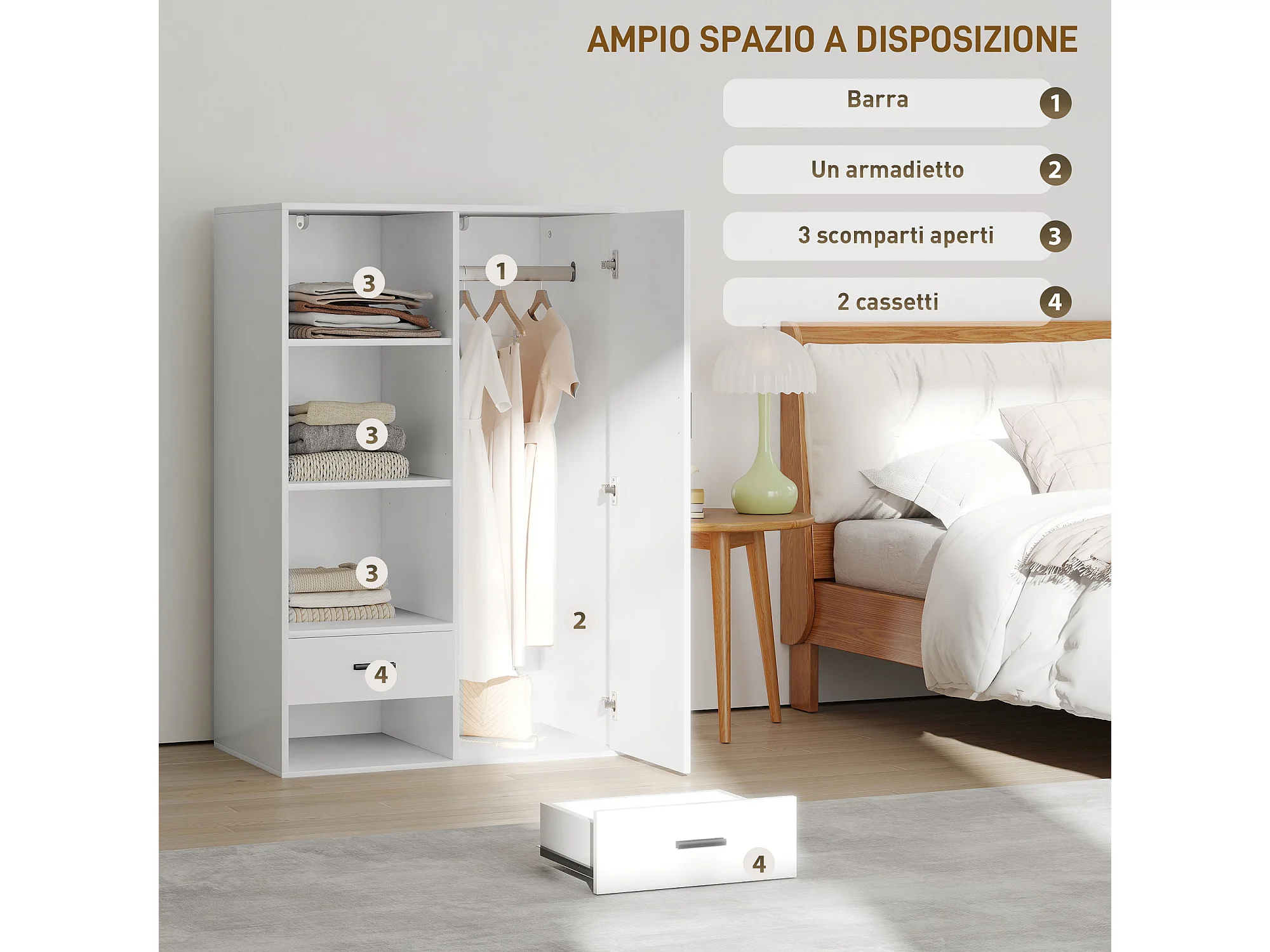 Armadio con 2 cassetti ripiani aperti e appendiabiti bianco