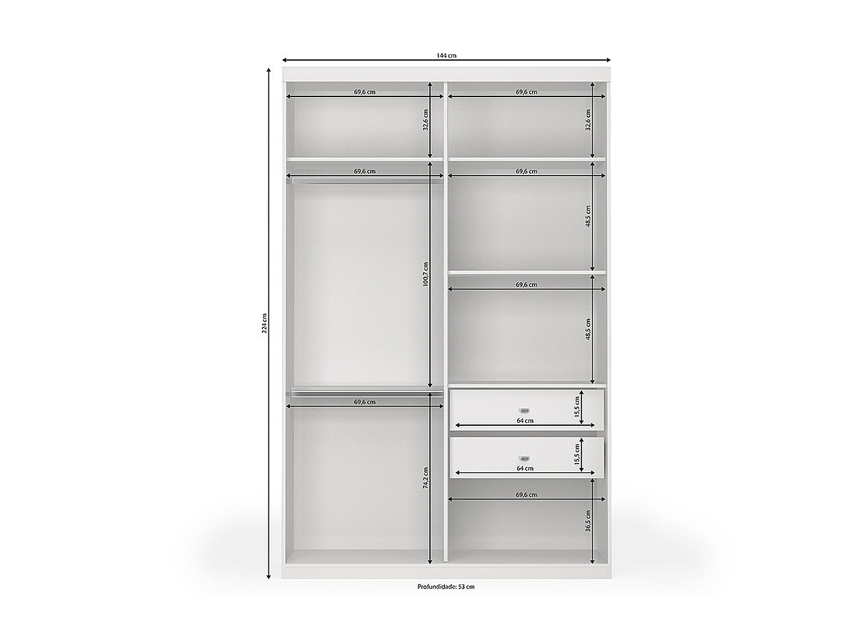 - Interno: 1 appendiabiti con ripiano, 1 portabiancheria (3 mensole), 2 cassetti