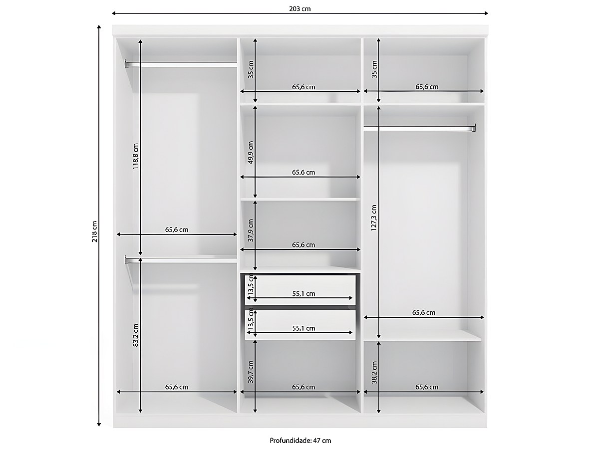 - Interno: 3 appendini, 1 portabiancheria (3 mensole), 2 cassetti