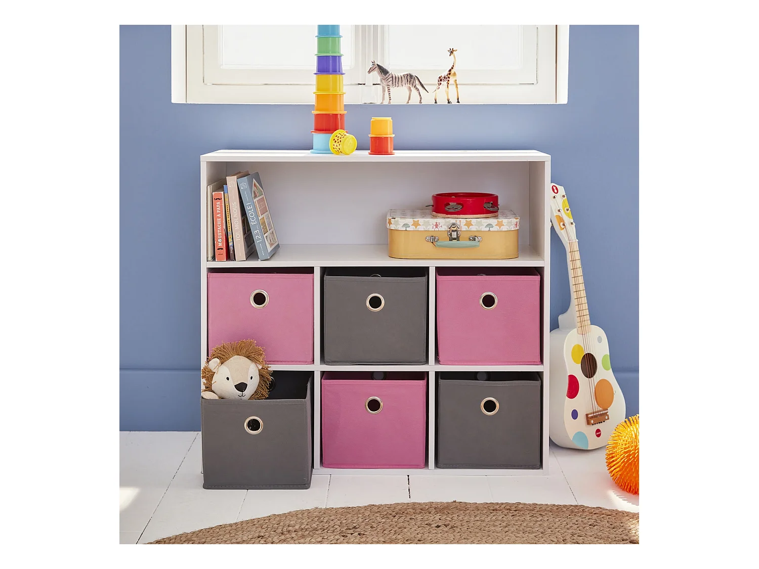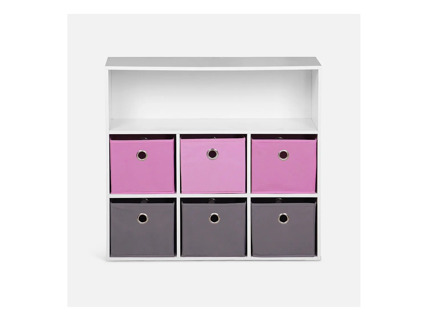 Scaffale portagiochi con 6 contenitori in tessuto rosa