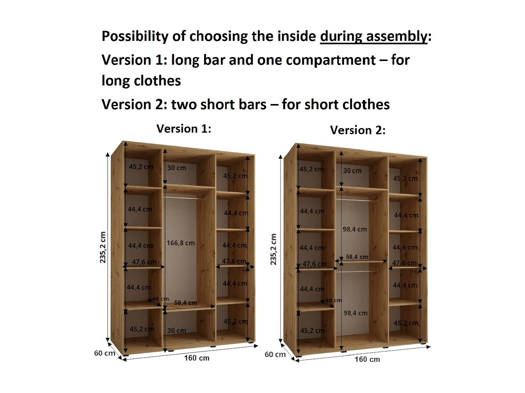 Dimensioni: altezza: 235,2 cm, larghezza: 160 cm, profondità: 45 cm. Maniglie in acciaio disponibili in tre colori: nero, oro e argento. Le spazzole per la polvere sono incluse nel kit. Scelta del tipo di interno al momento del montaggio: versione 1 - un vano lungo, una barra di sospensione, versione 2 - due vani corti, due barre di sospensione.