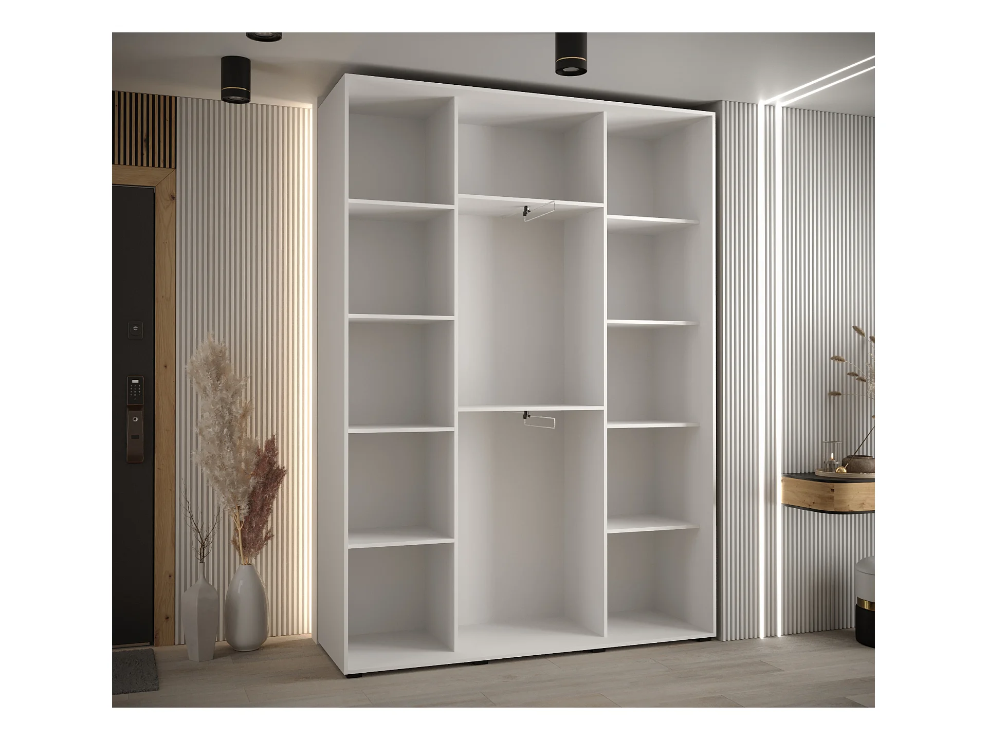 Dimensioni: altezza: 235,2 cm, larghezza: 180 cm, profondità: 45 cm. Maniglie in acciaio disponibili in tre colori: nero, oro e argento. Le spazzole per la polvere sono incluse nel kit. Scelta del tipo di interno al momento del montaggio: versione 1 - un vano lungo, una barra di sospensione, versione 2 - due vani corti, due barre di sospensione.