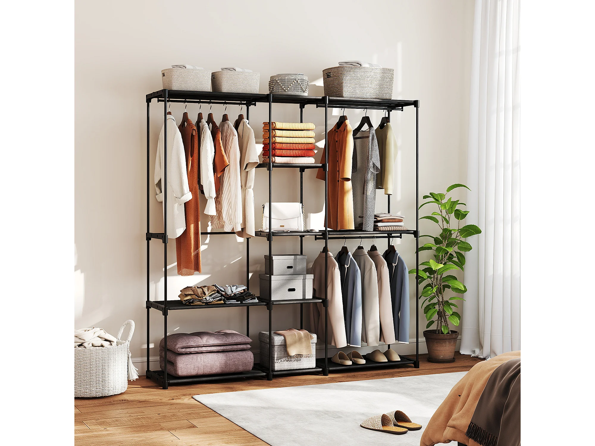 Armadio guardaroba portatile in tessuto nero con 2 aste e 6 ripiani