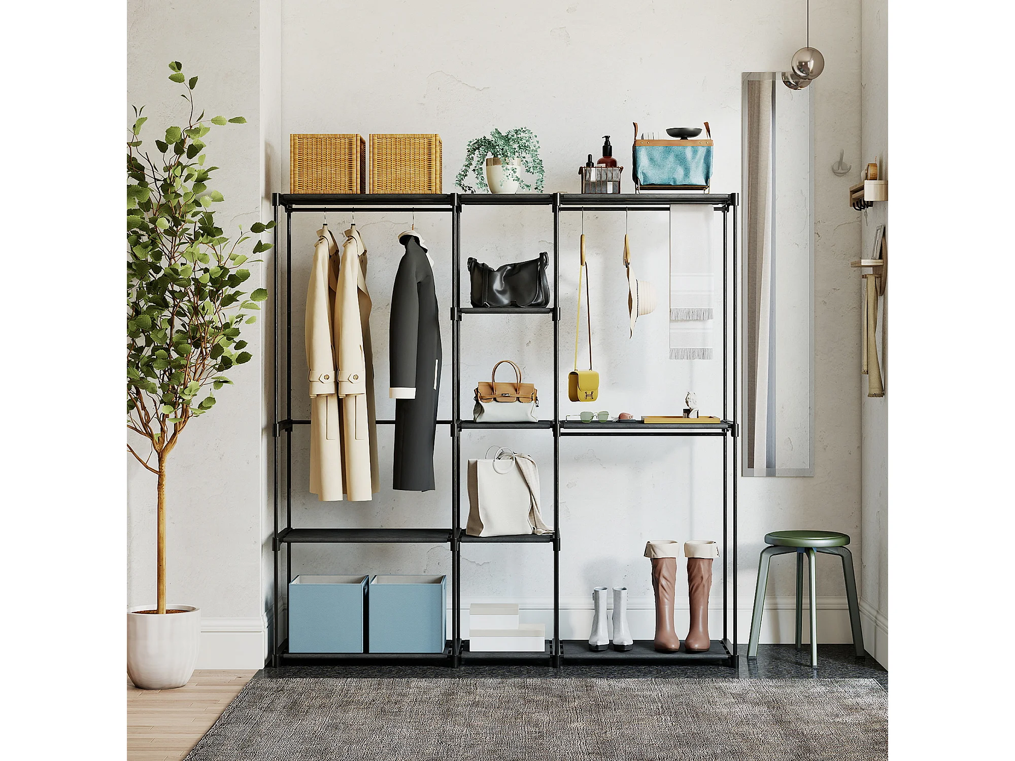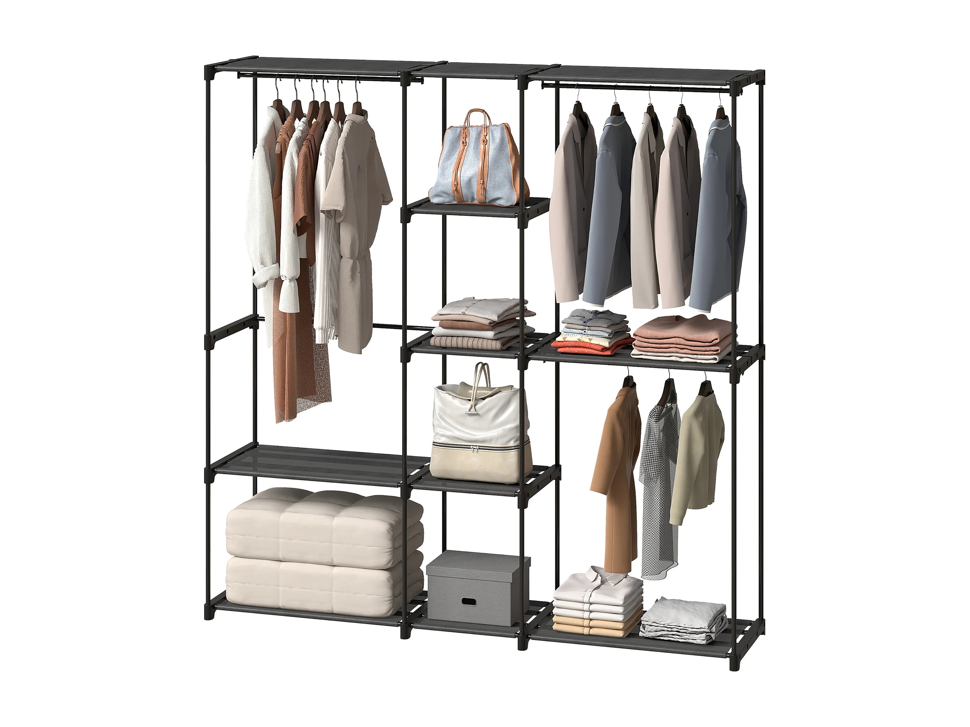 Armadio guardaroba con 8 ripiani e 3 aste in tessuto nero