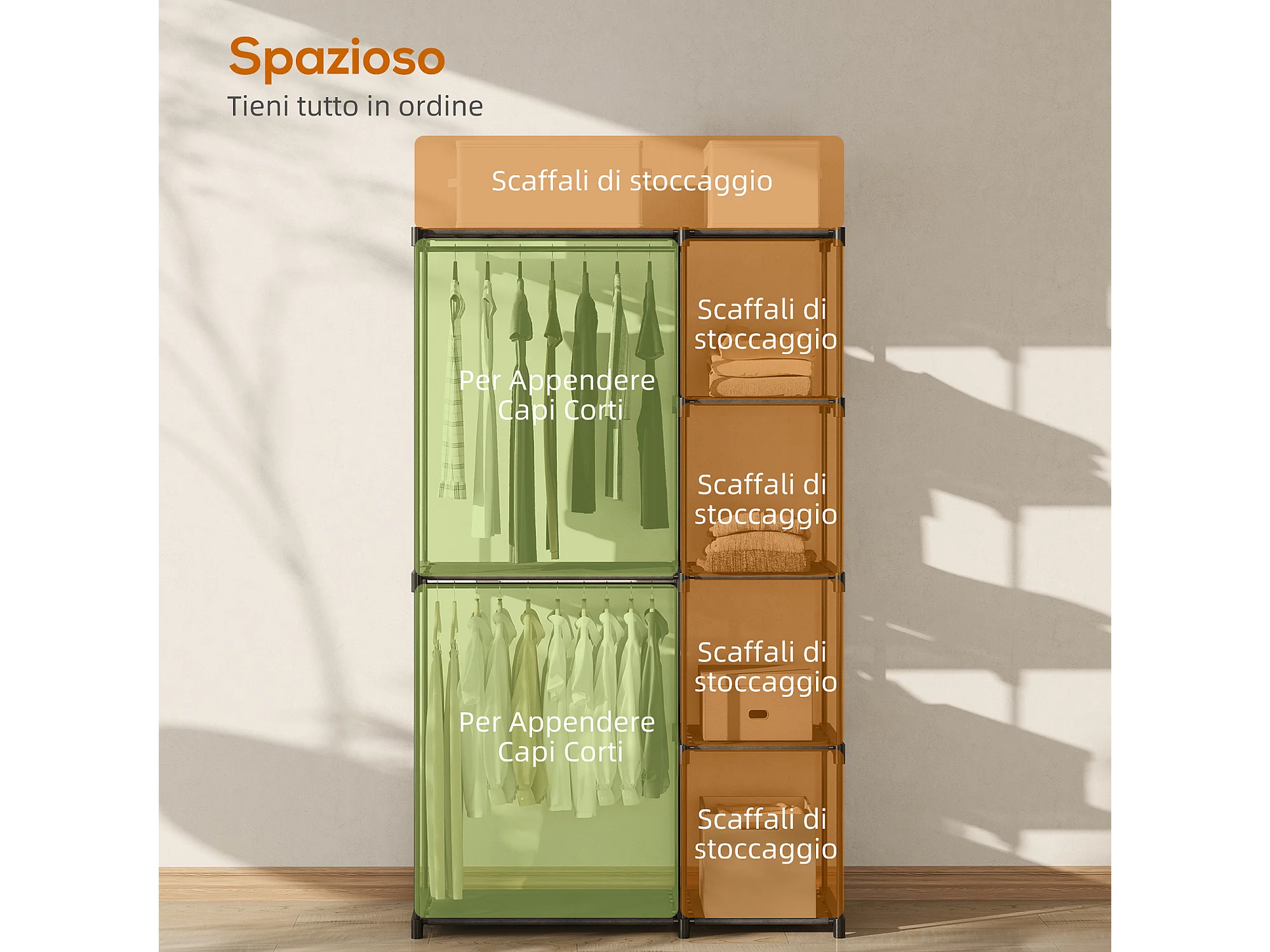 Armadio guardaroba con 8 ripiani e 3 aste in tessuto nero