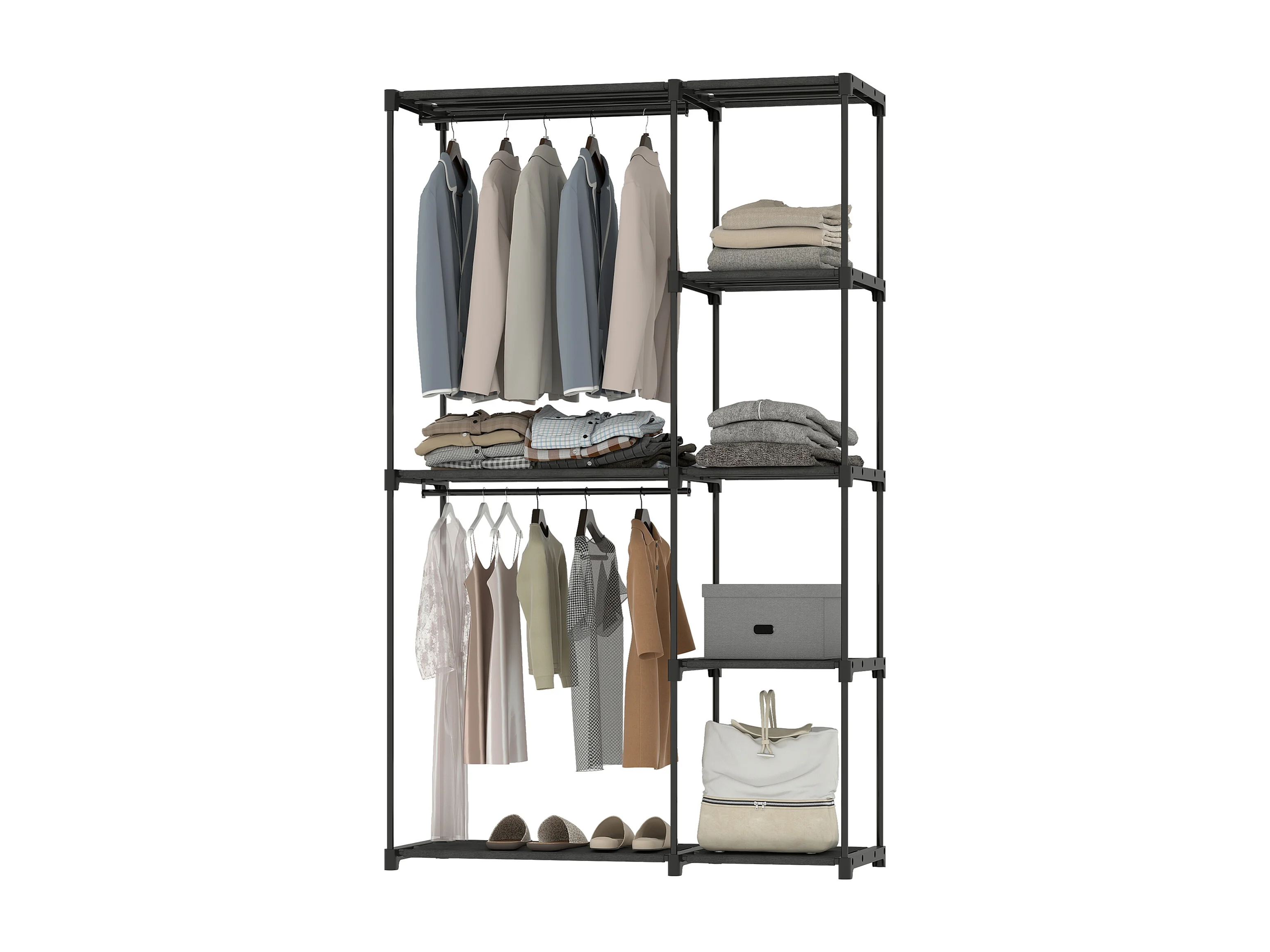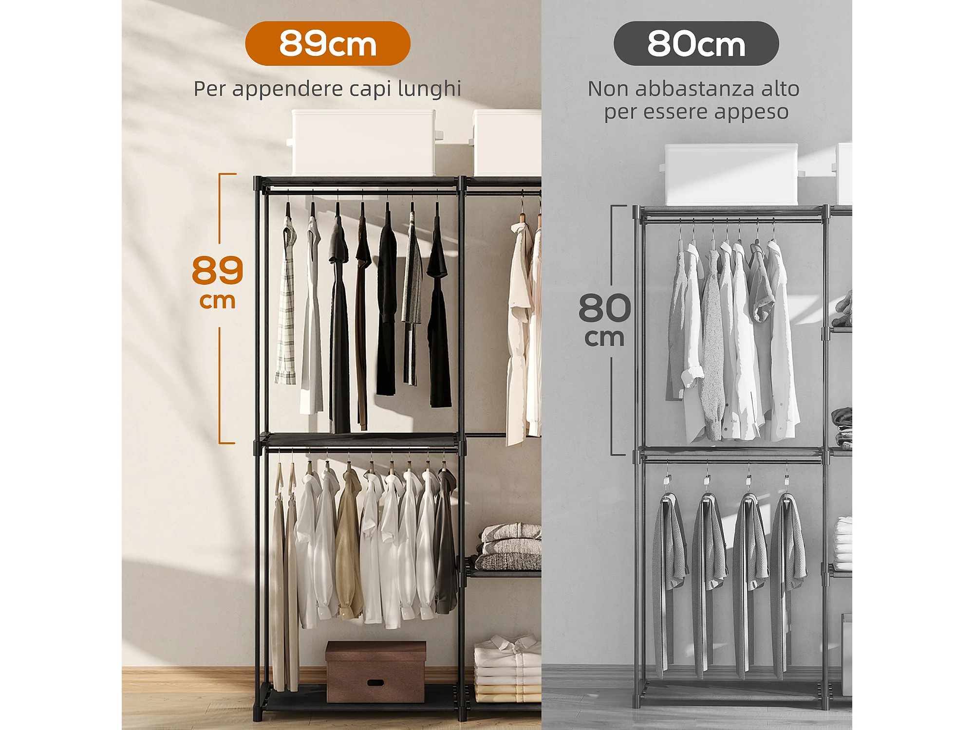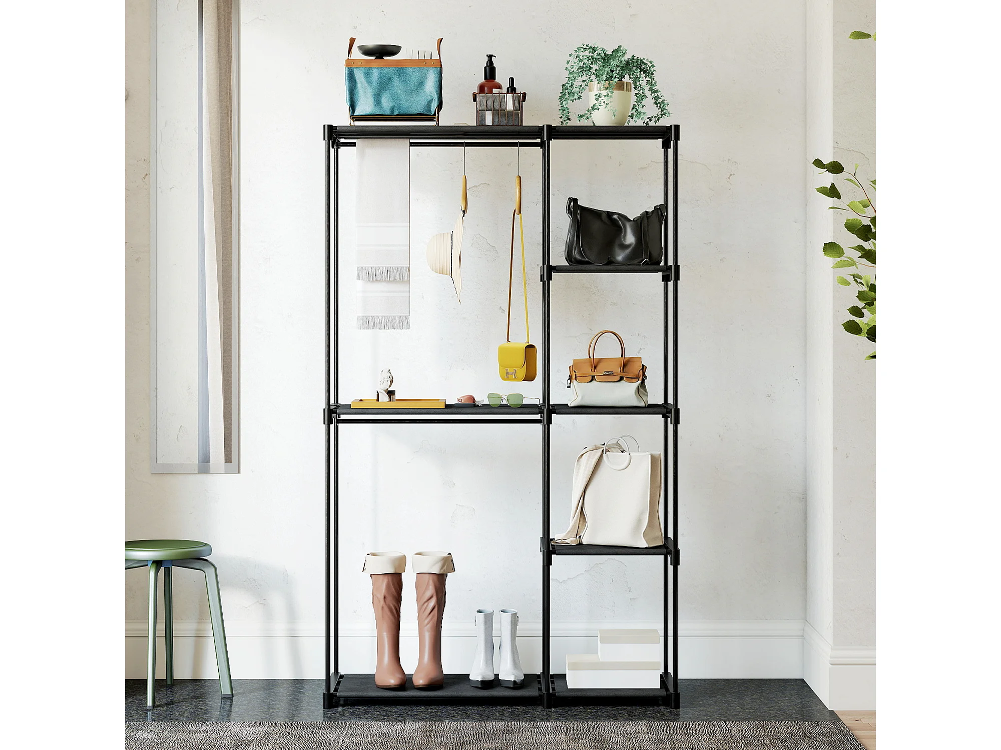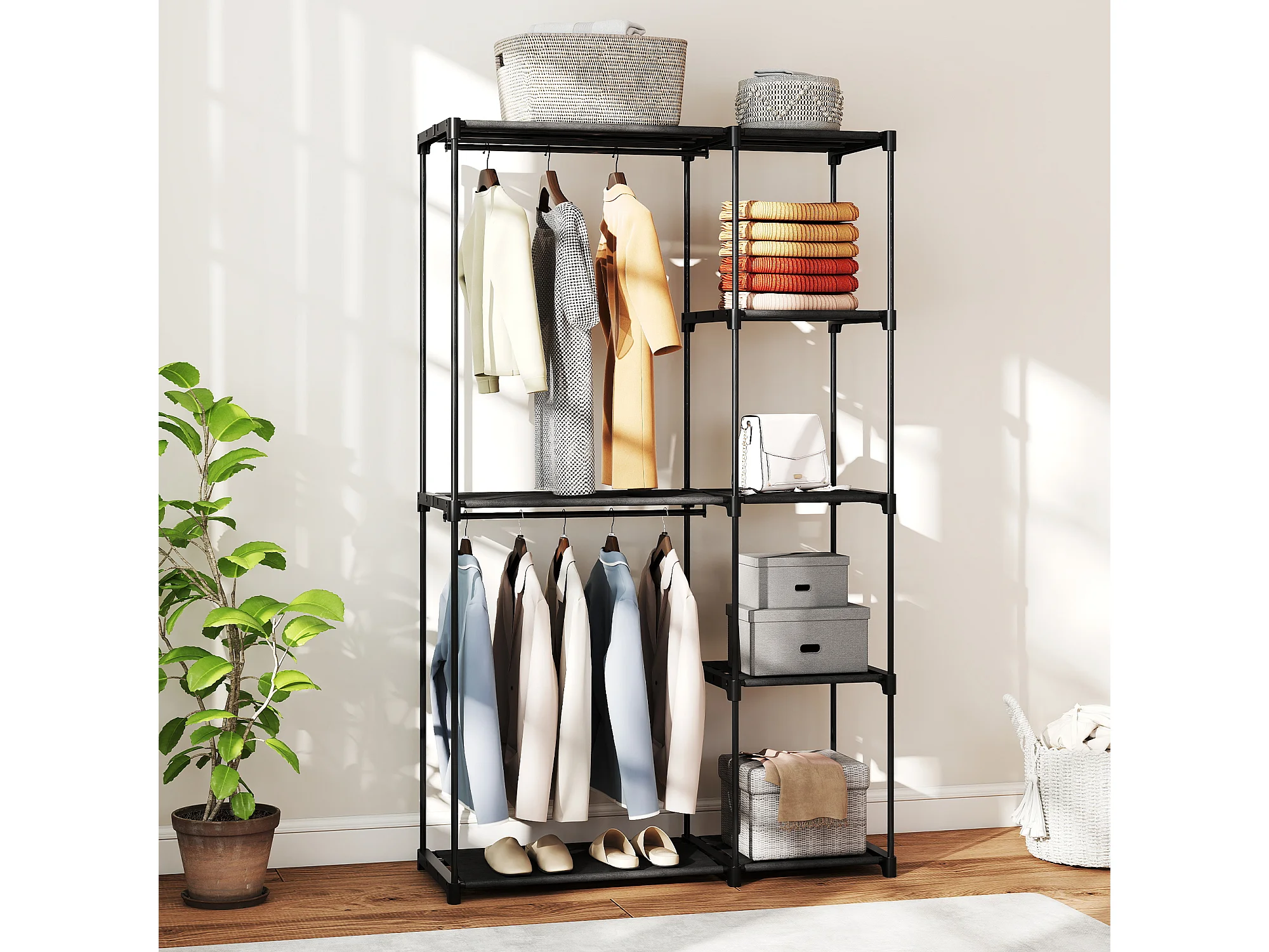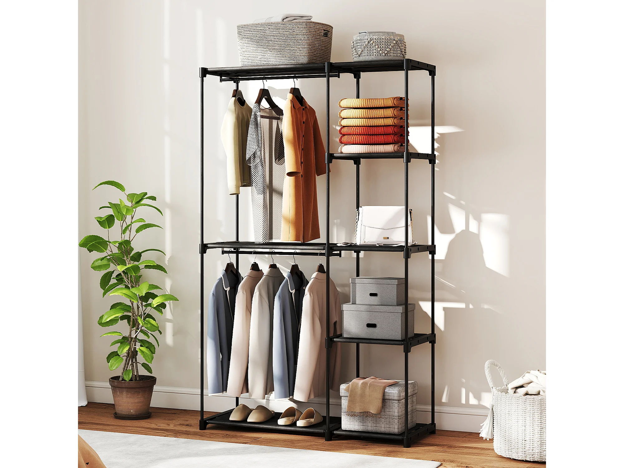 Armadio guardaroba portatile in tessuto nero con 2 aste e 6 ripiani