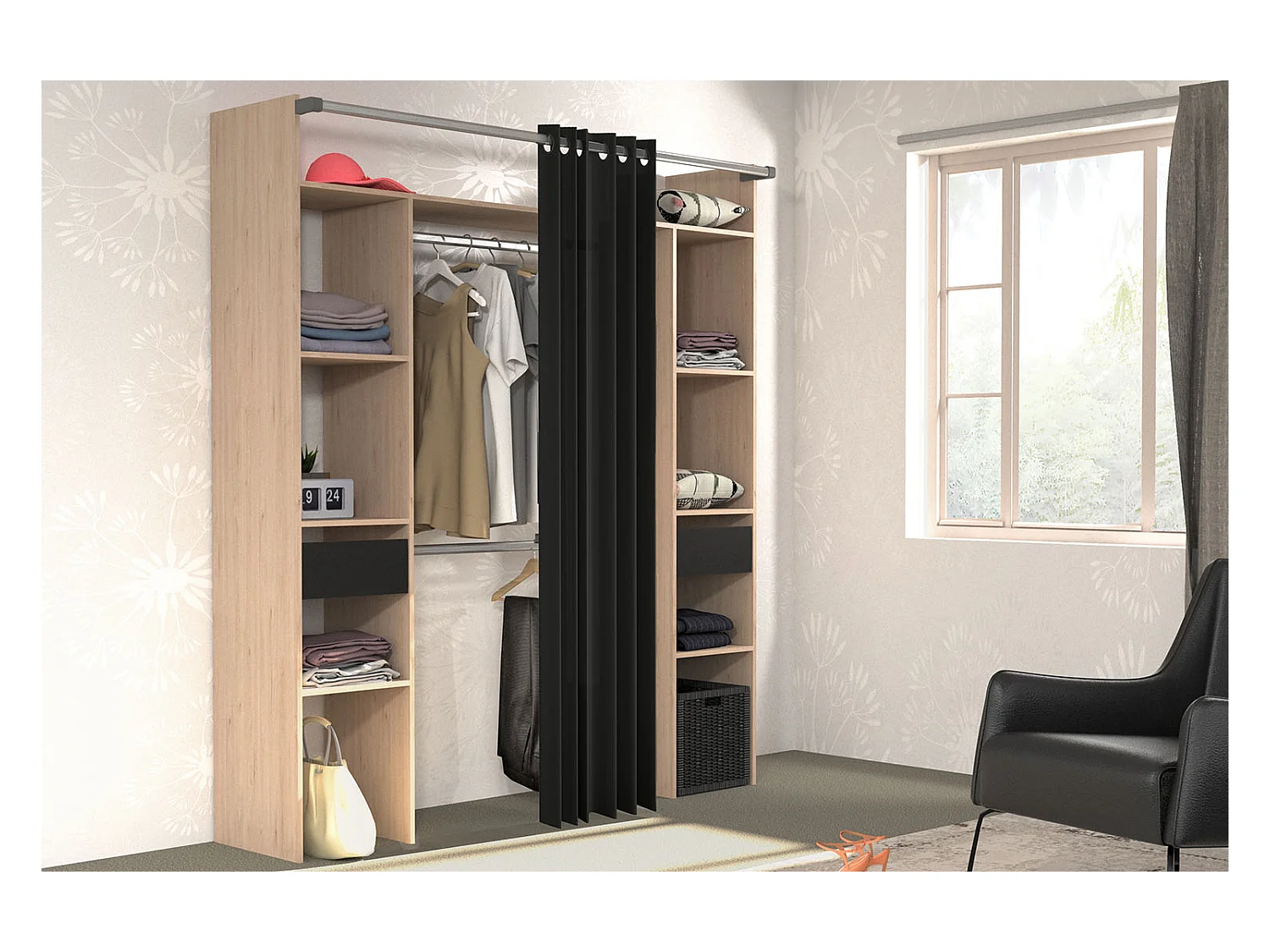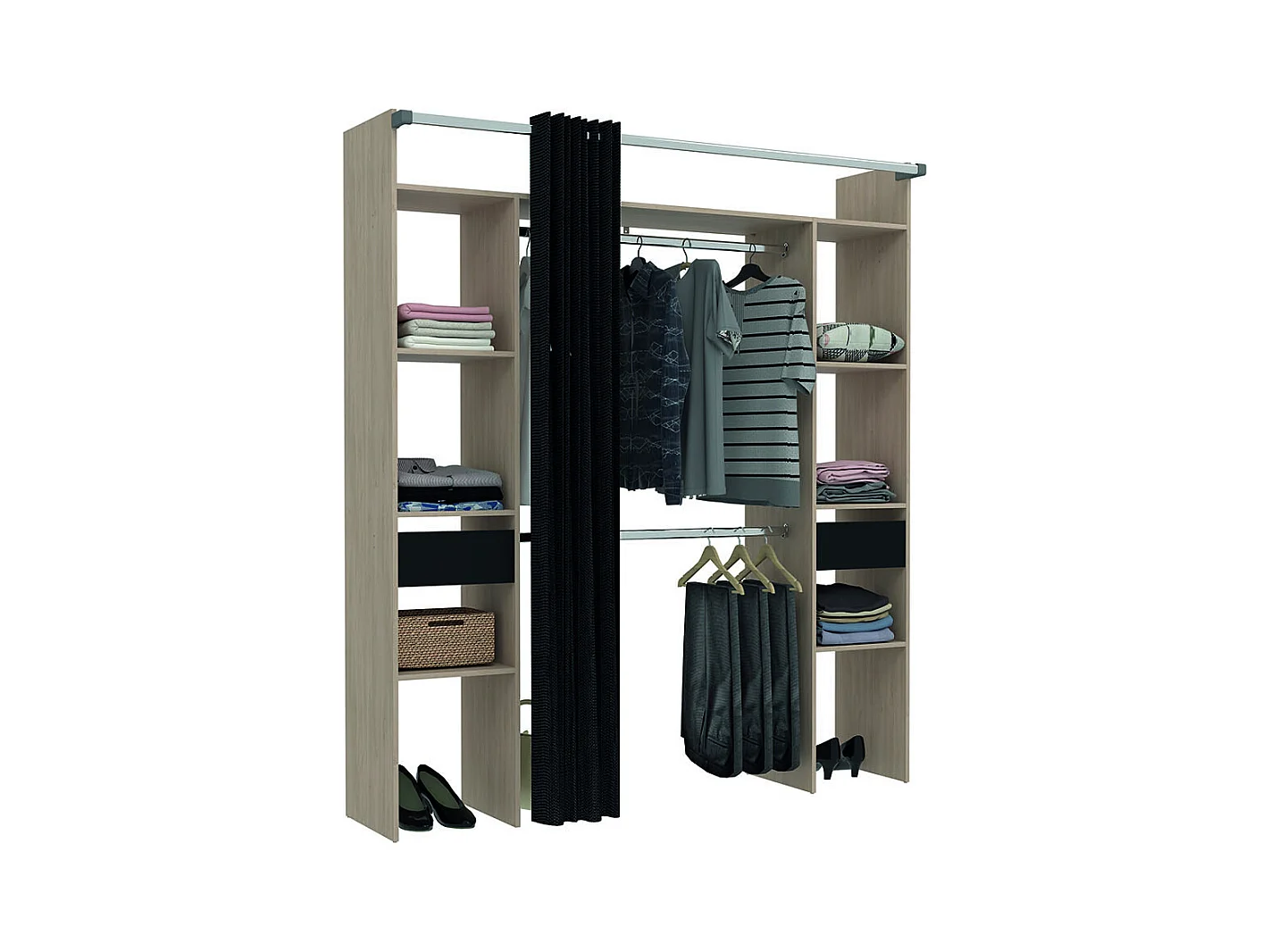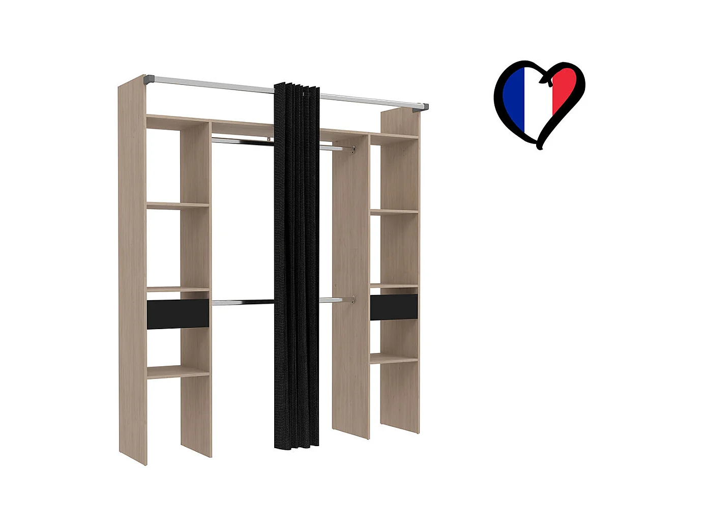 Armadio in legno, tenda nera, 2 armadi, 6 ripiani, 2 cassetti ELYSEE