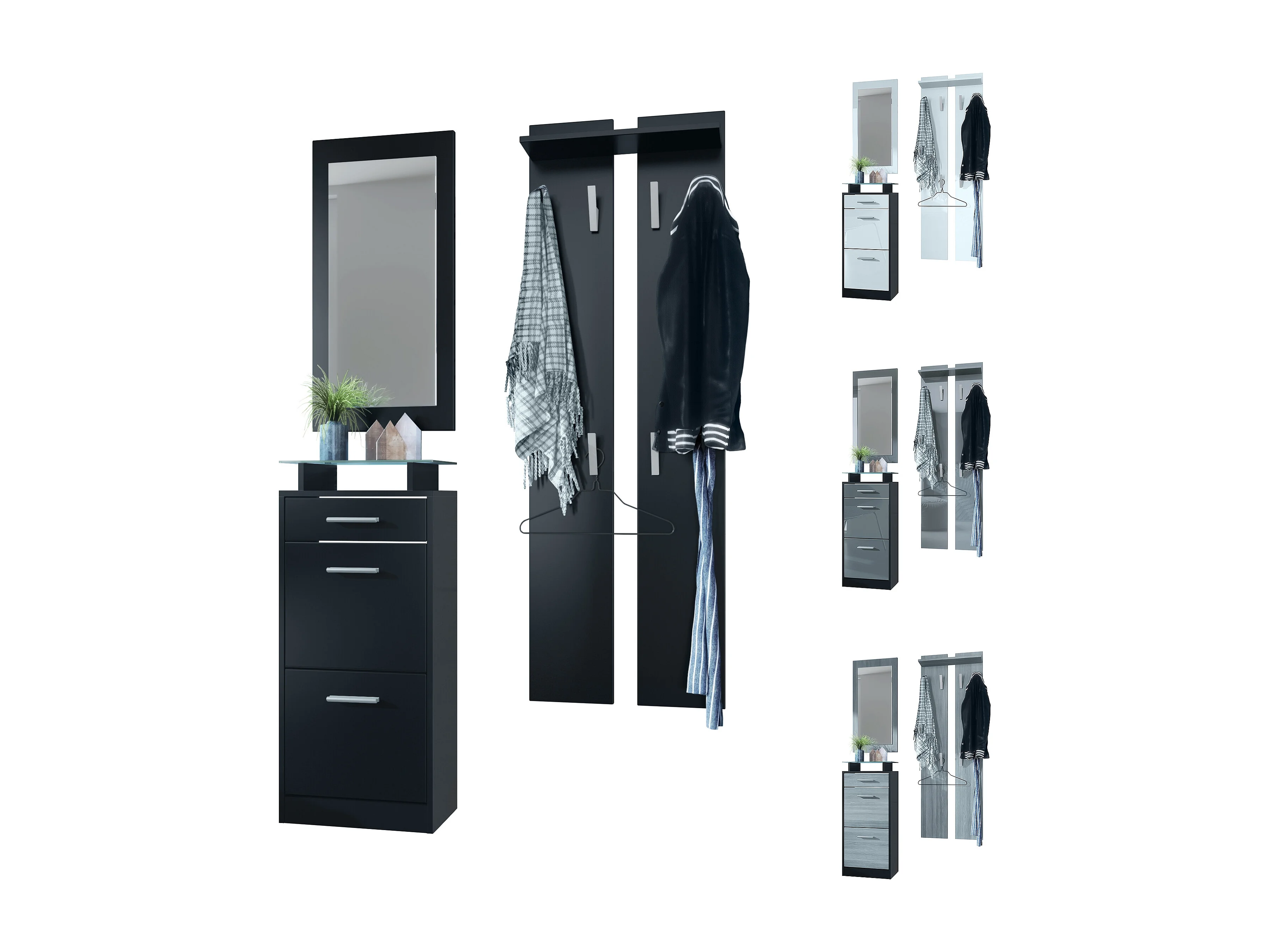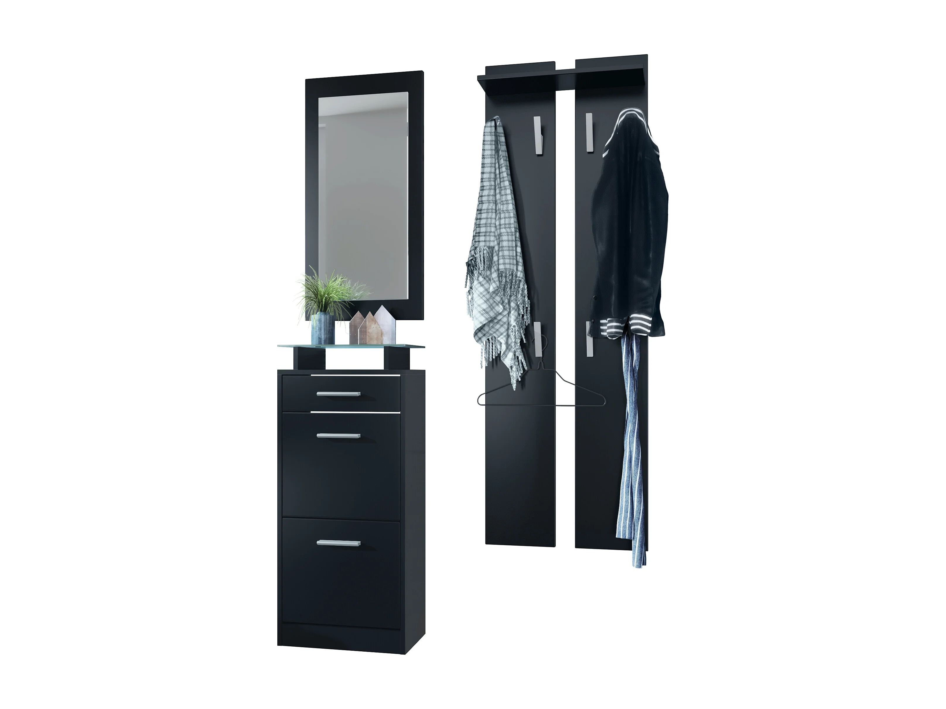 Loret Mini Set da corridoio, Set da corridoio con 1 scarpiera, 1 specchio a parete e 2 pannelli appendiabiti, nero opaco/nero opaco