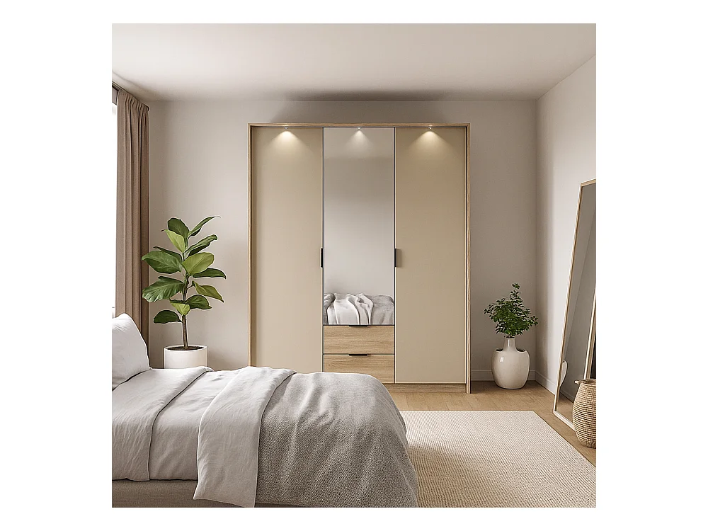 Armadio con 2 ante, specchio e appendiabiti scorrevoli - legno - naturale