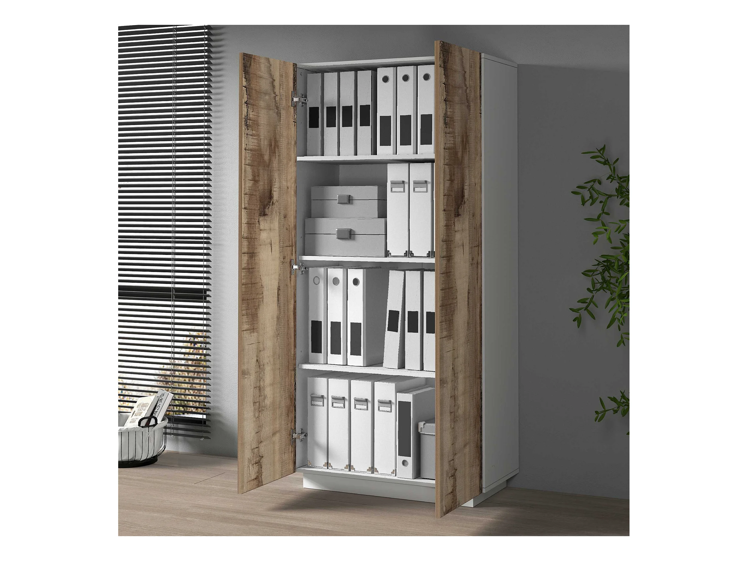 Logan V1, mobile per ufficio, schedario con 5 scomparti e 4 ante, bianco opaco/rovere naturale (82 x 185 x 37 cm)