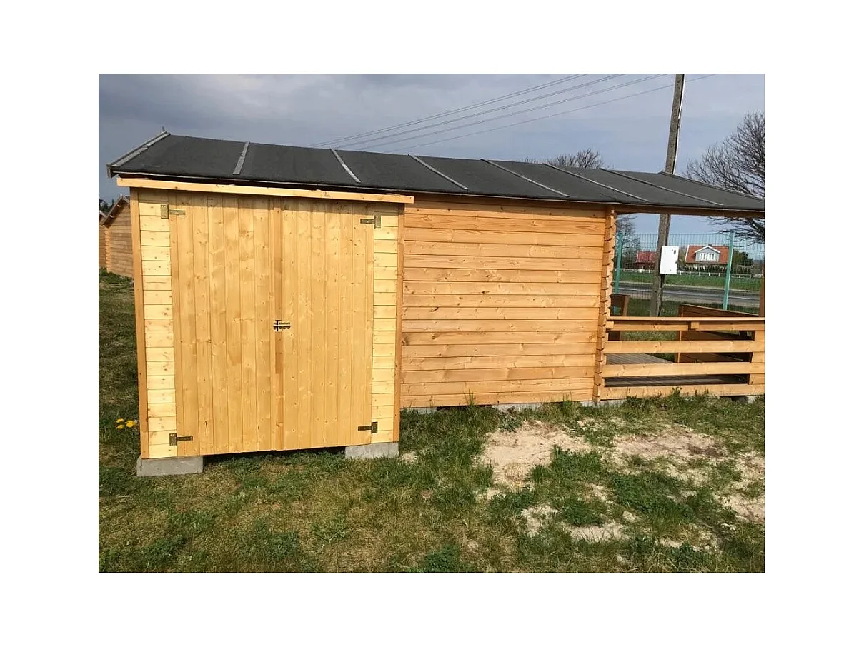 Casetta da giardino in legno con veranda e tettoia - 28.00m2 - 4.00x4.00m - 40mm - colore: naturale - DOM611+DOM618+DOM548+POD04 - ALTANKA