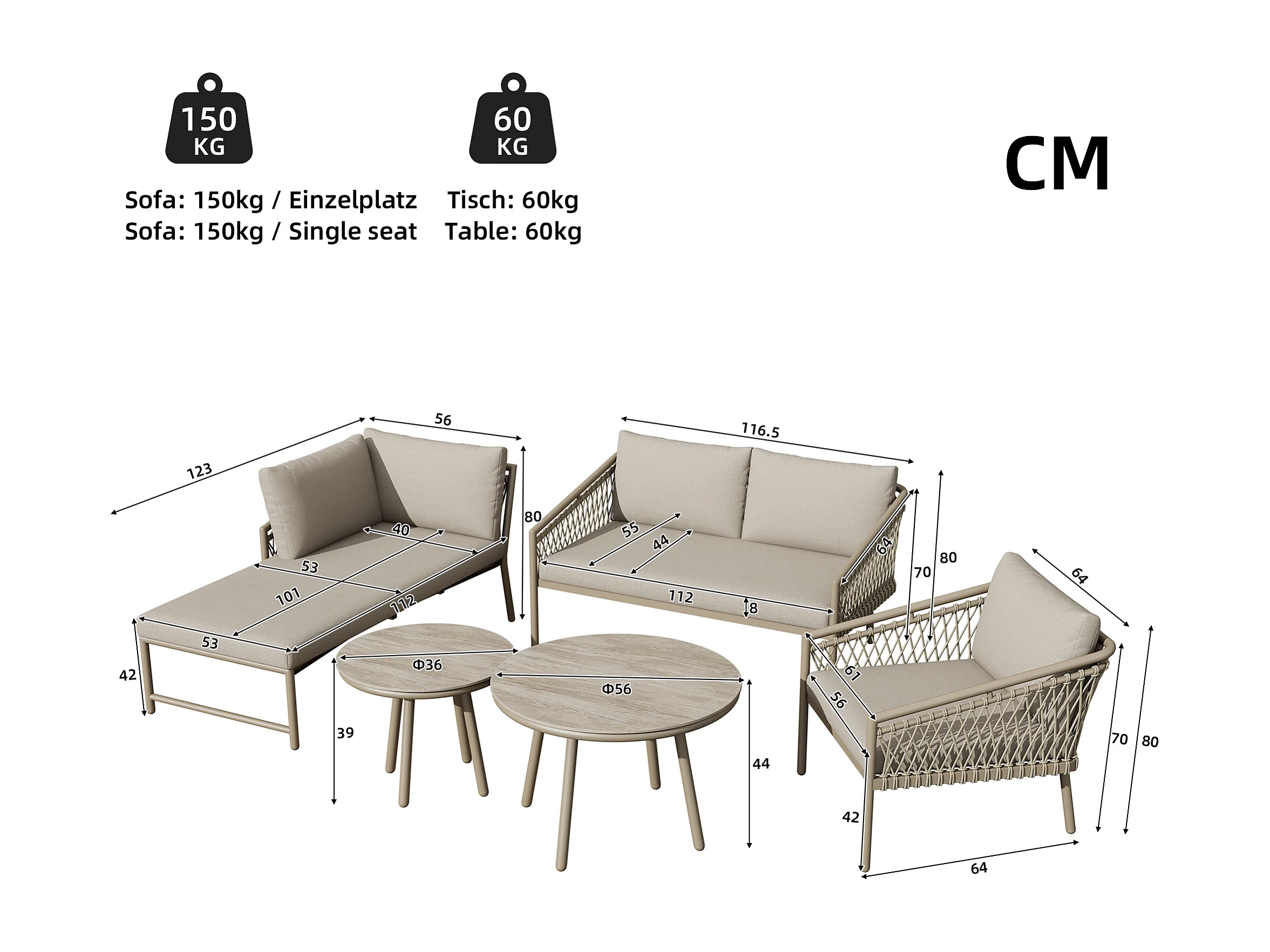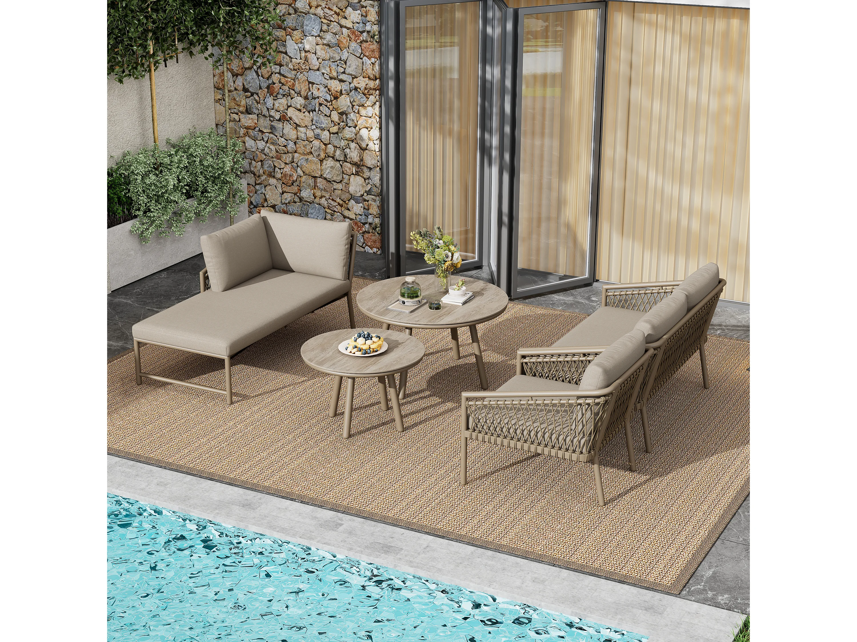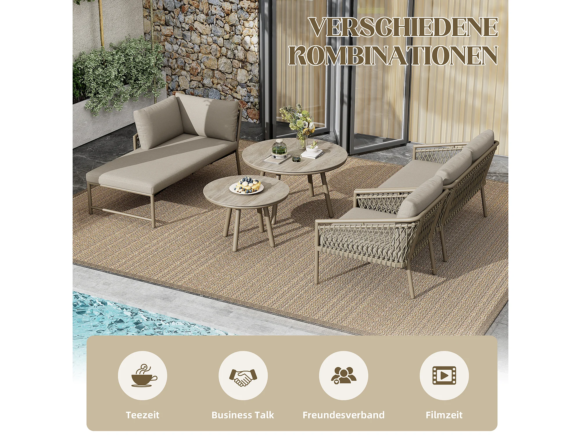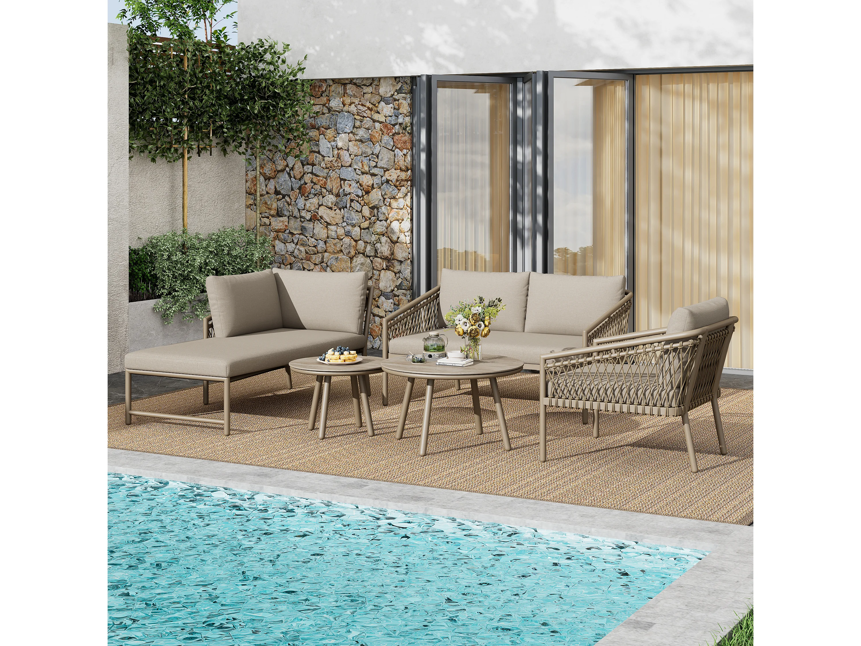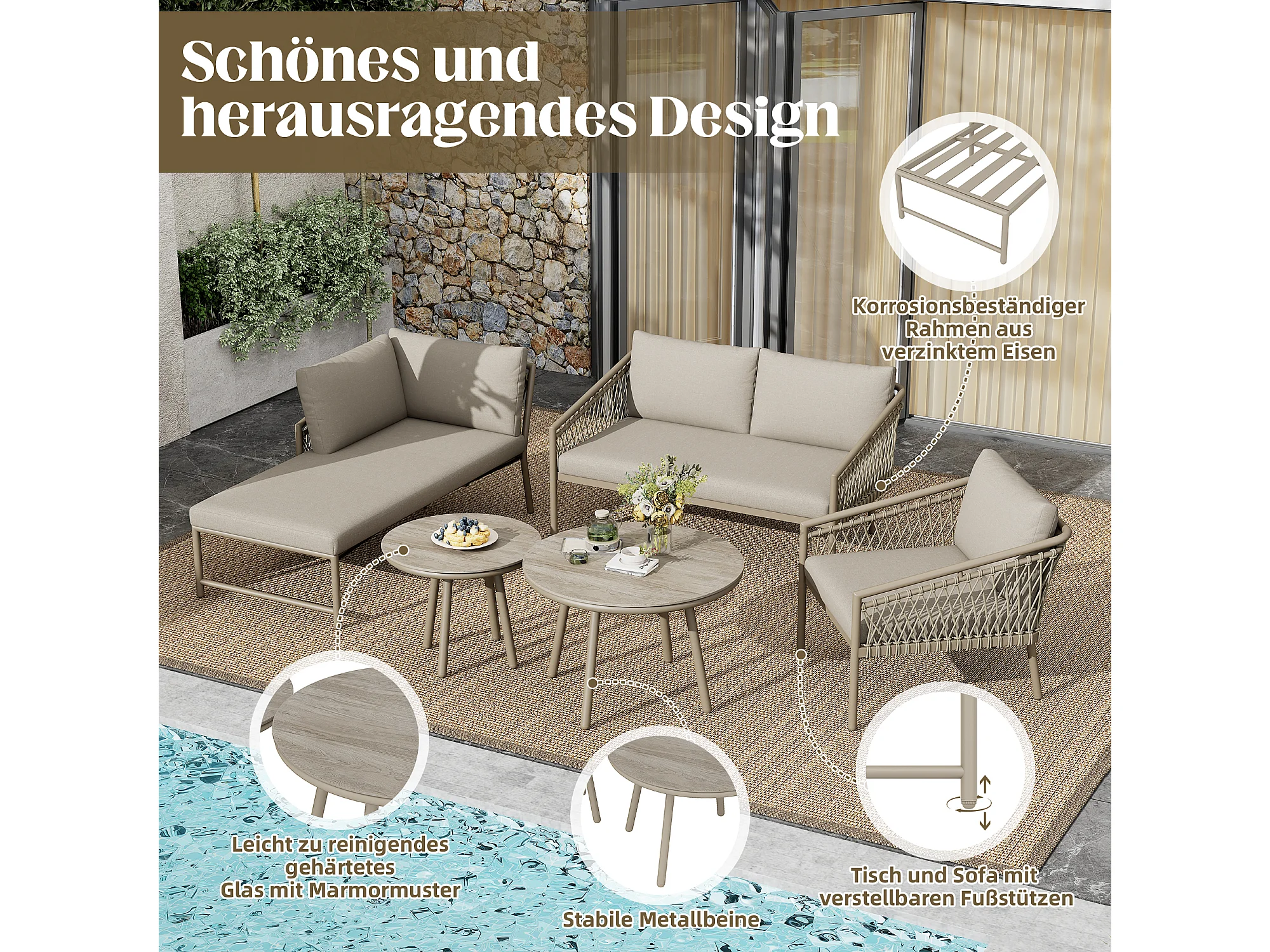 Arredo da giardino componibile in ferro e corda: 2 divani 2 posti + 1 poltrona + tavolini impilabili - cachi
