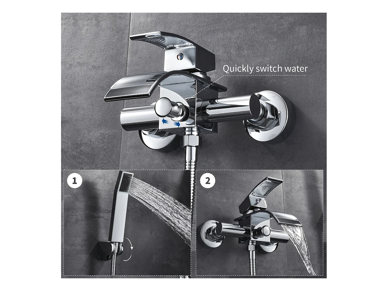 rubinetto per vasca con doccetta, rubinetto a cascata, rubinetto per doccia monocomando, montaggio a parete, ottone per bagno, cromato