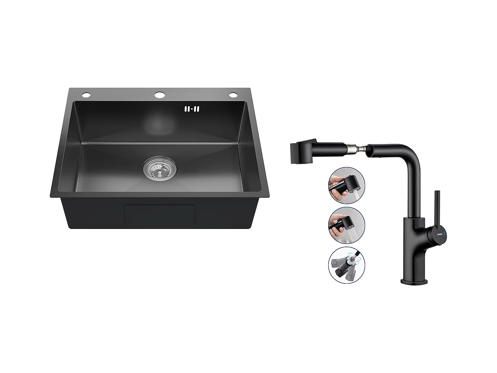 Auralum max Lavello da cucina da incasso,1 vasca,60*49*20CM,acciaio inossidabile 304,nero+rubinetto cucina con doccetta estraibile,2 modalità Jets