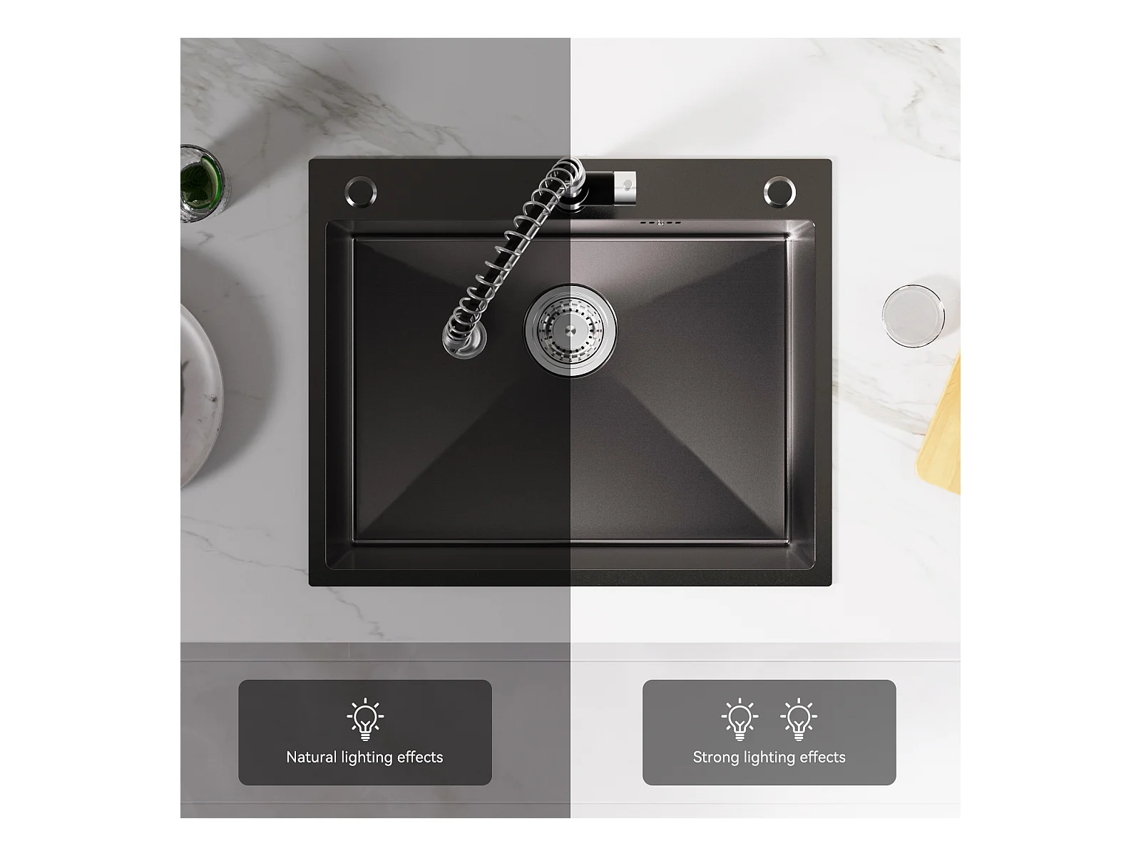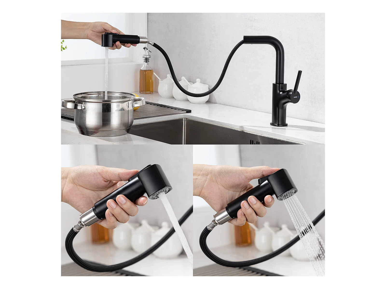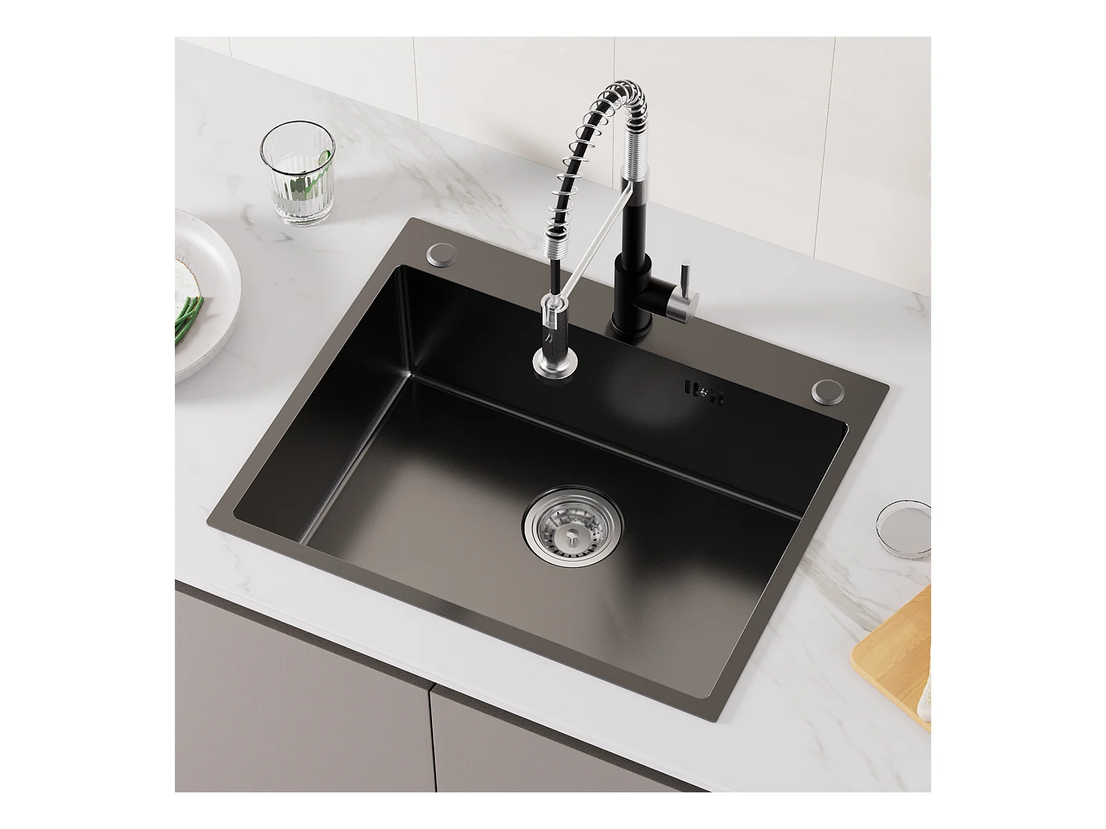 Lavello cucina da incasso,1 Vassoio,60*49*20CM,inox 304,Nero+Miscelatore Cucina Flexible,Rubinetto da cucina pieghevole,Rubinetto cucina 2 tipi getti