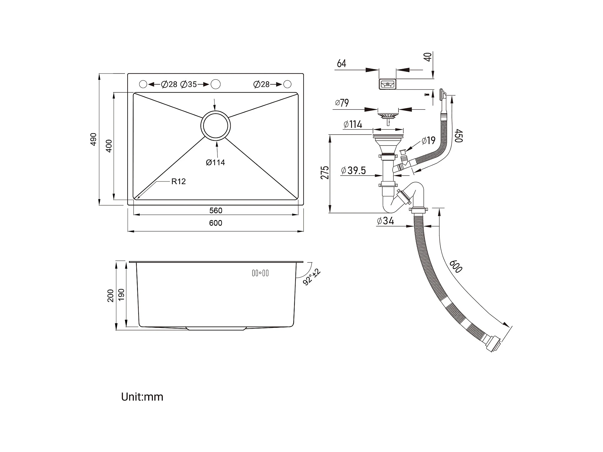 Lavello Cucina da incasso,1 Vassoio,60*49*20CM,Acciaio inossidabile 304,Nero+Rubinetto Cucina Doccia Estraibile Due Getti Girevolante 360°,Nero