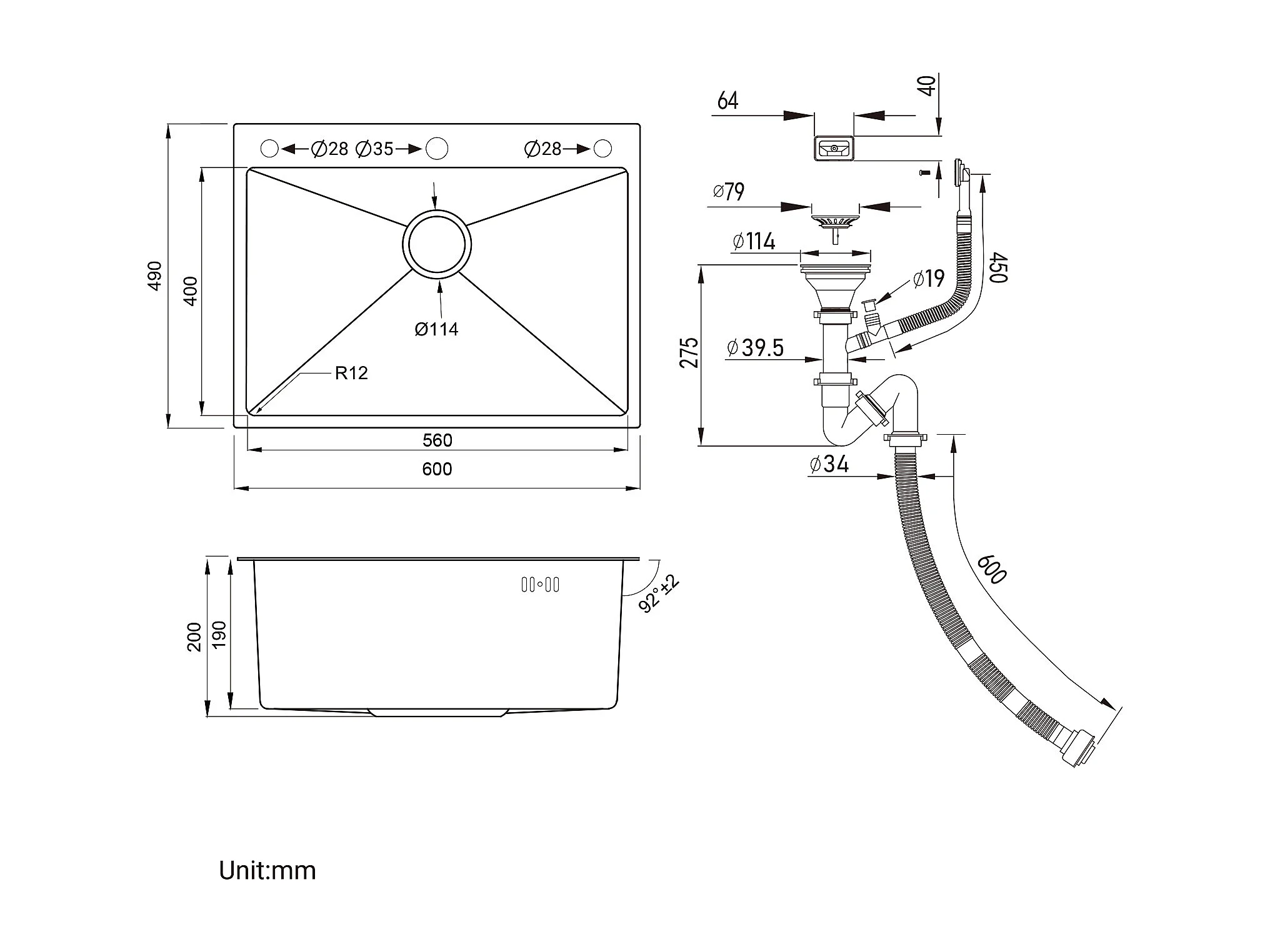 Lavello Cucina da incasso,1 Vassoio,60*49*20CM,Acciaio inossidabile 304,Nero+Rubinetto Cucina Doccia Estraibile Due Getti Girevolante 360°,Nero