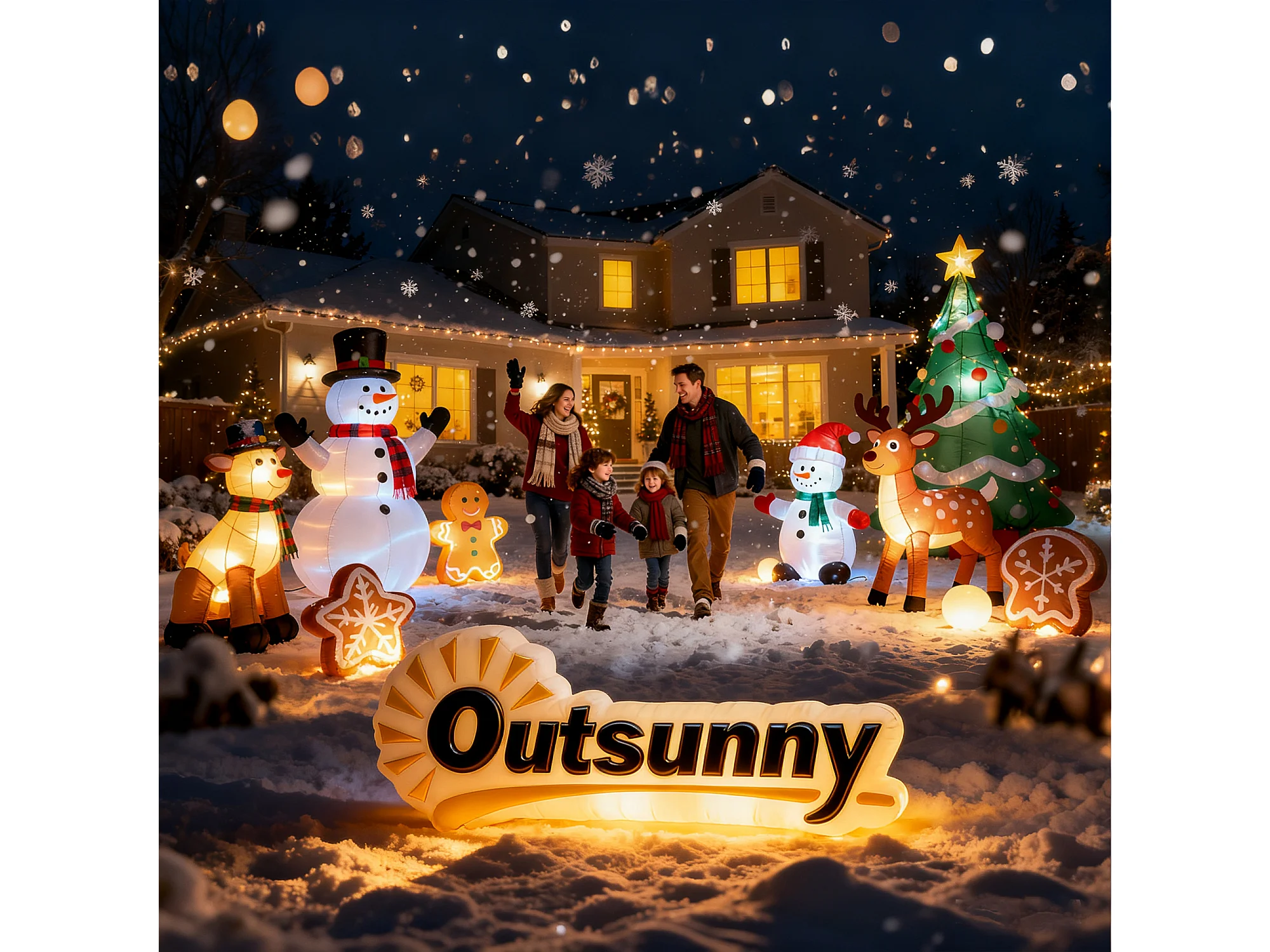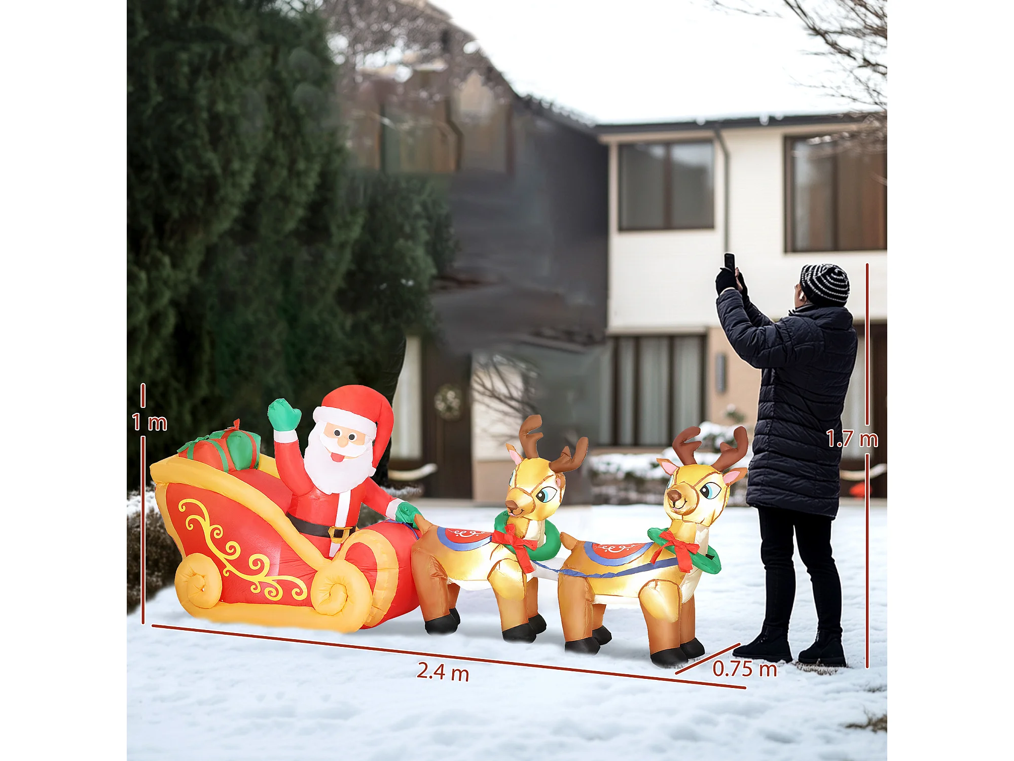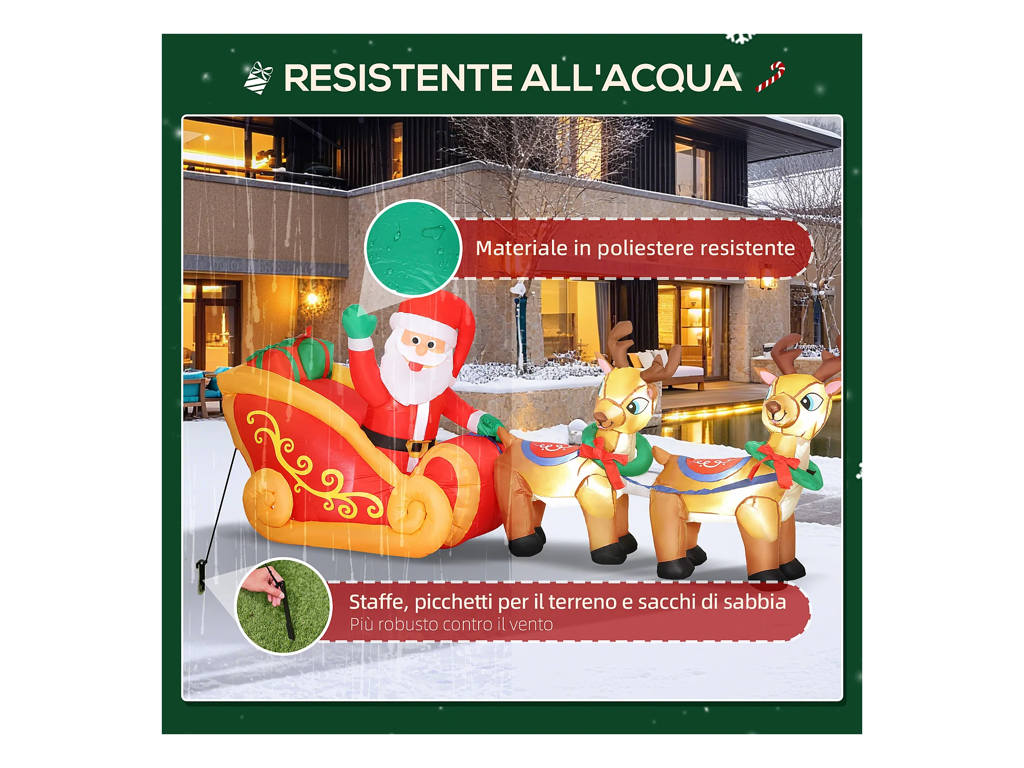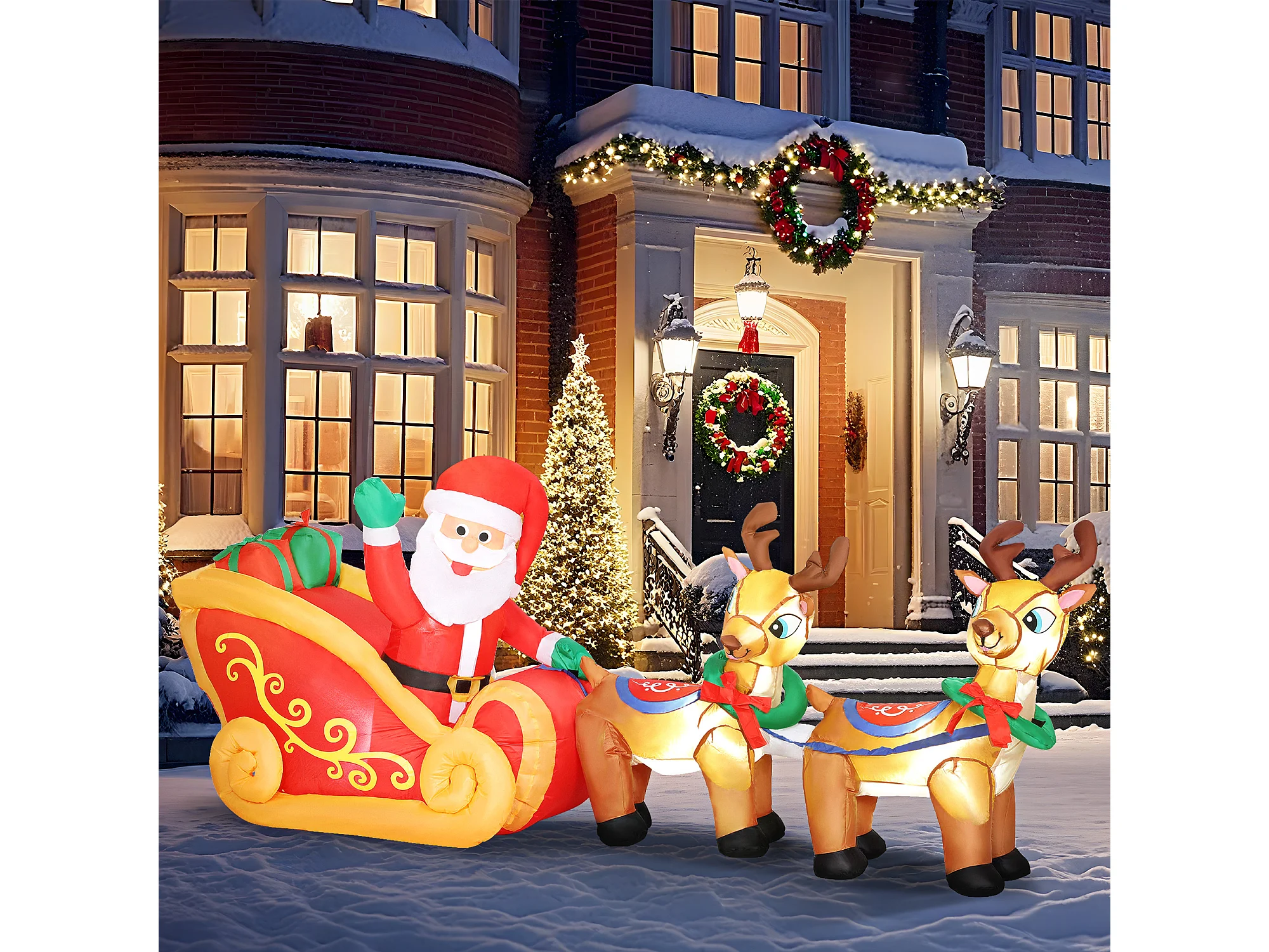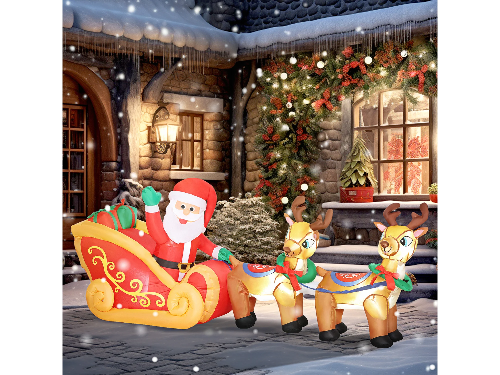 Babbo natale con slitta renna pupazzo di neve gonfiabile e luci