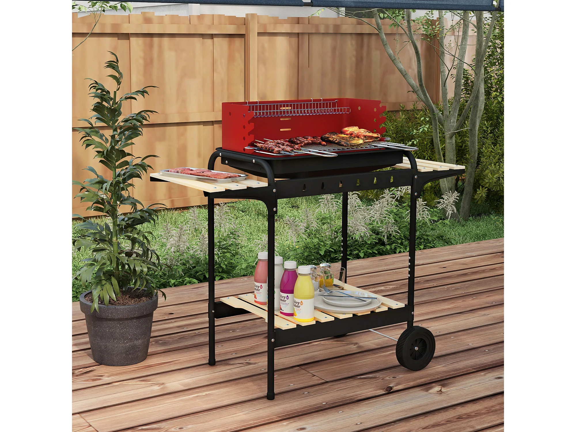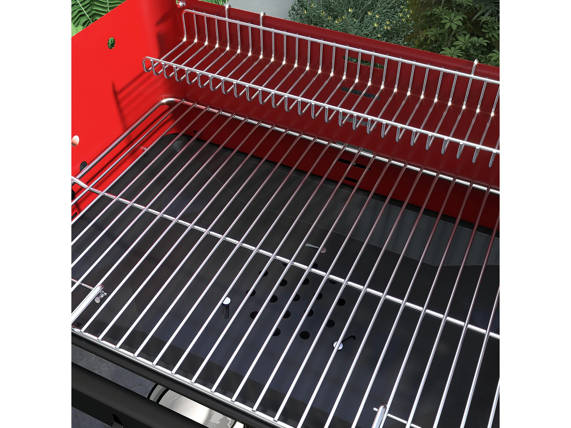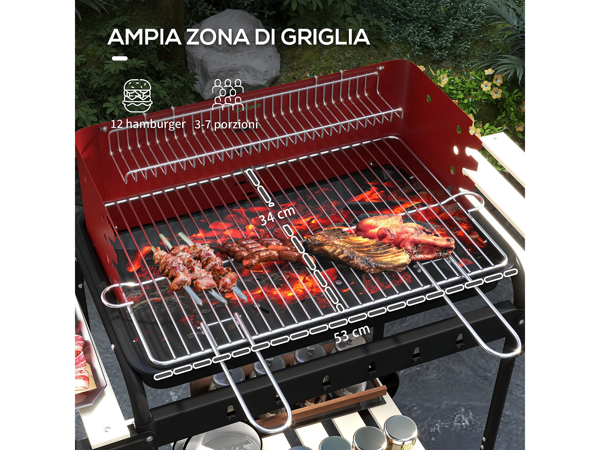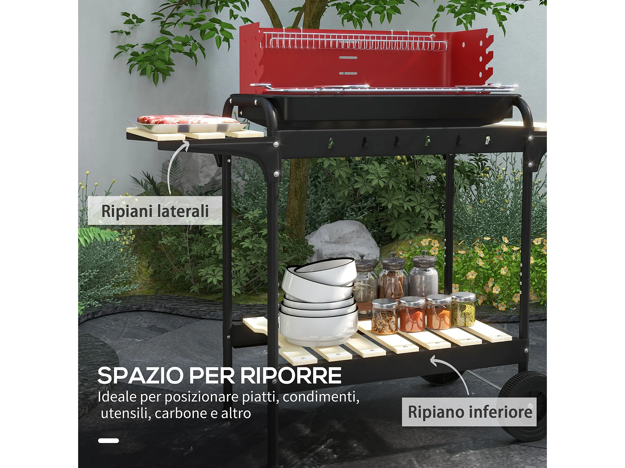 Barbecue a carbonella con griglia regolabile e ripiani rosso