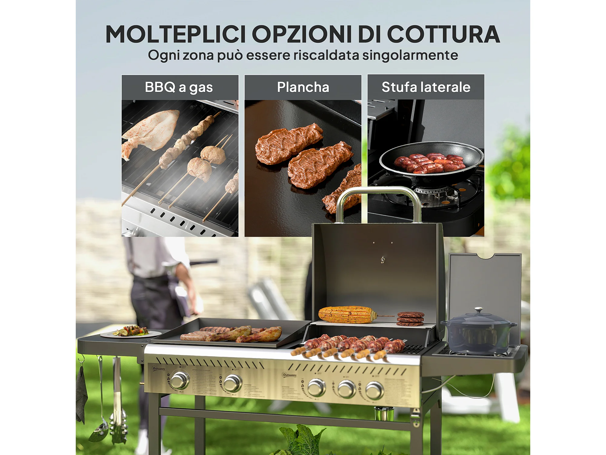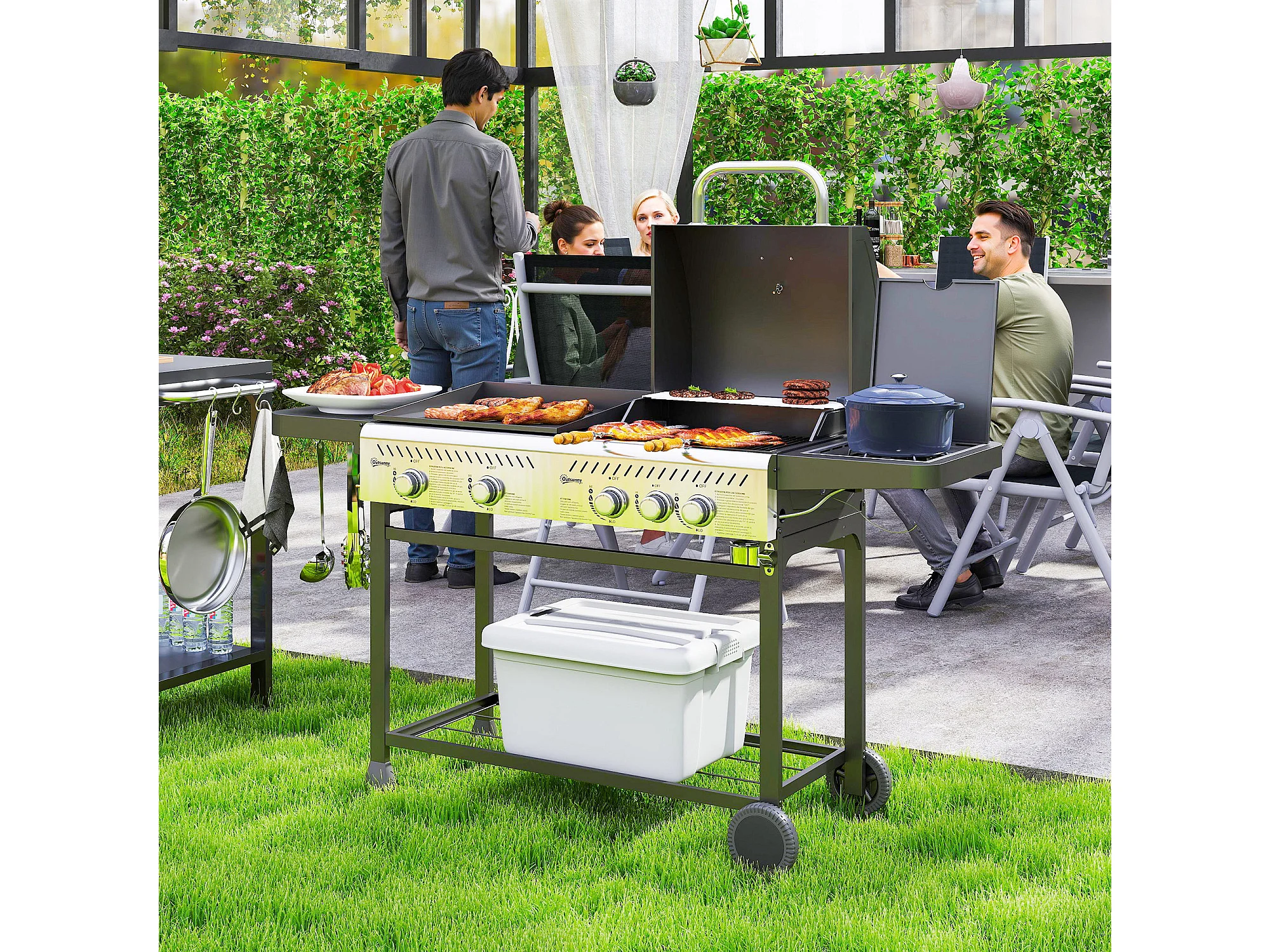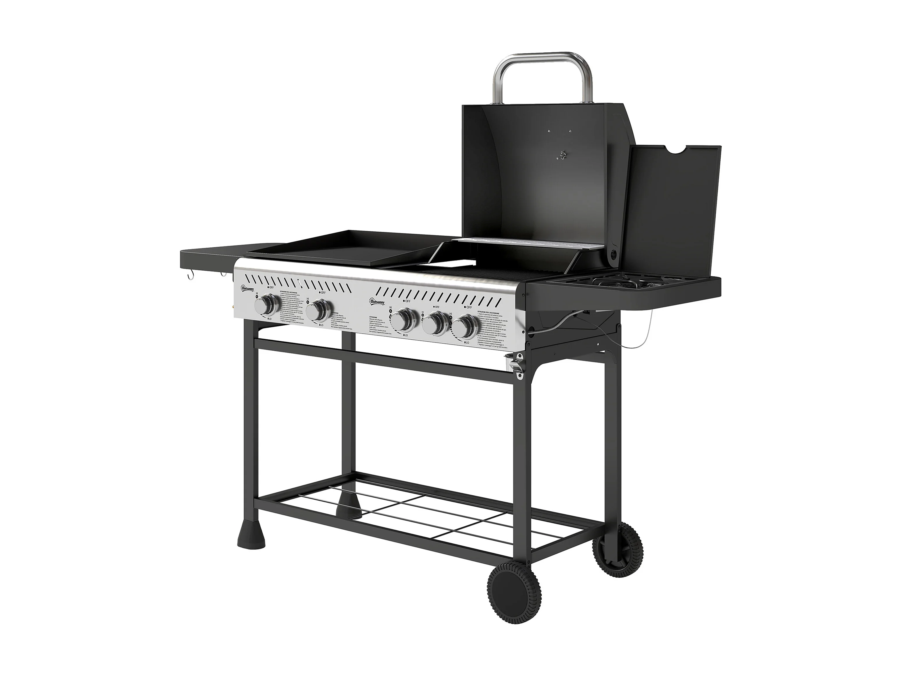Barbecue a gas con piastra e fornello coperchio con termometro nero