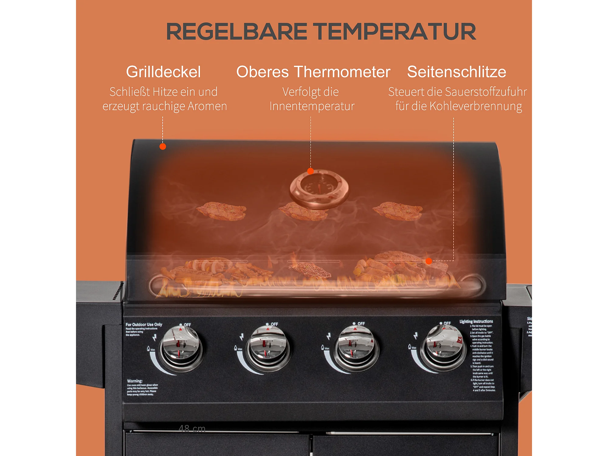 Barbecue a gas mobile con 3 bruciatori da 3 kW ciascuno, con ruote, griglie e tavolini laterali, in metallo nero (132,4x55x109 cm)
