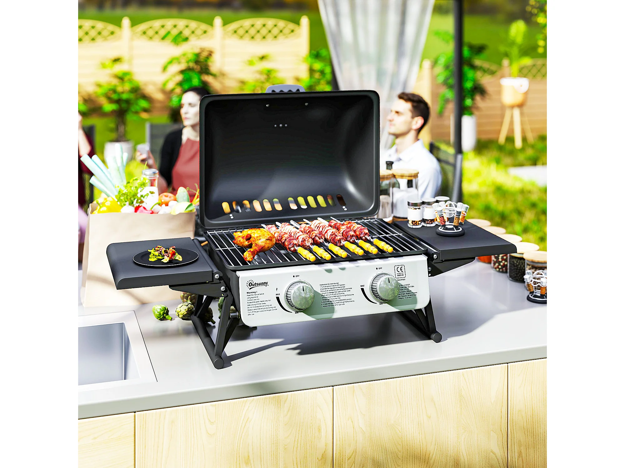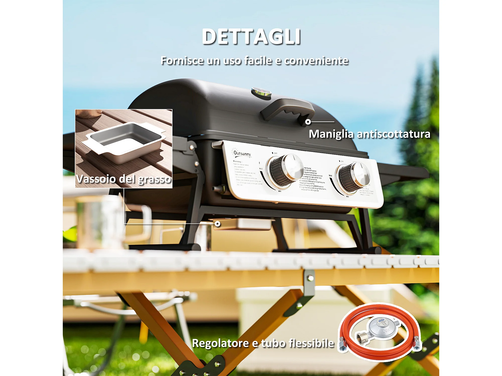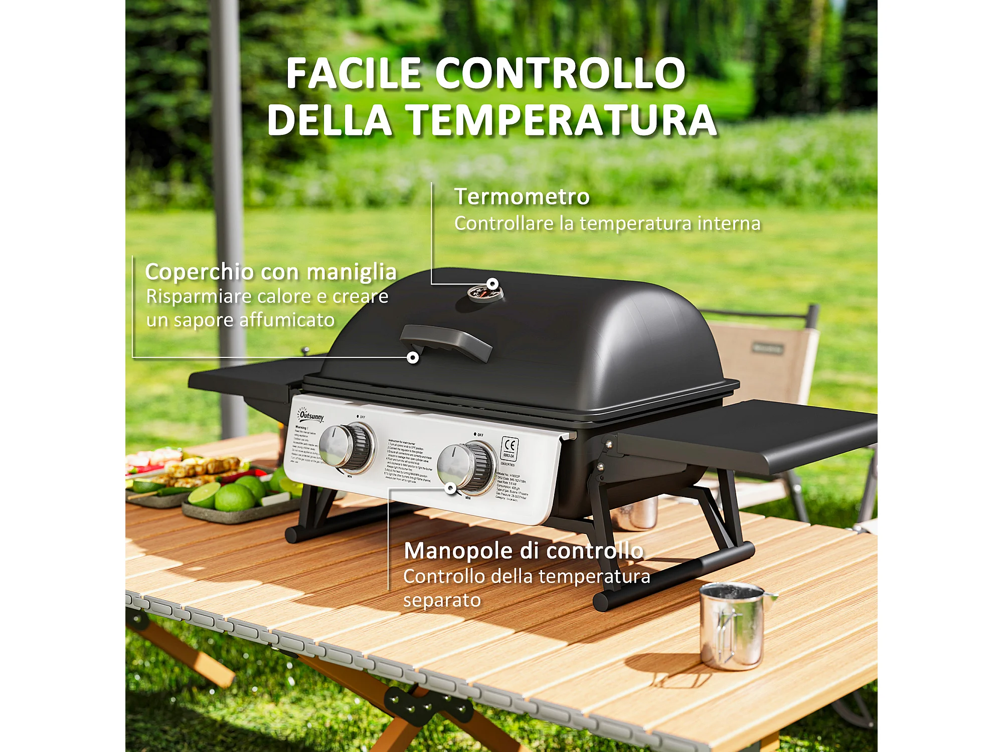 Barbecue a gas portatile con 2 bruciatori e coperchio nero