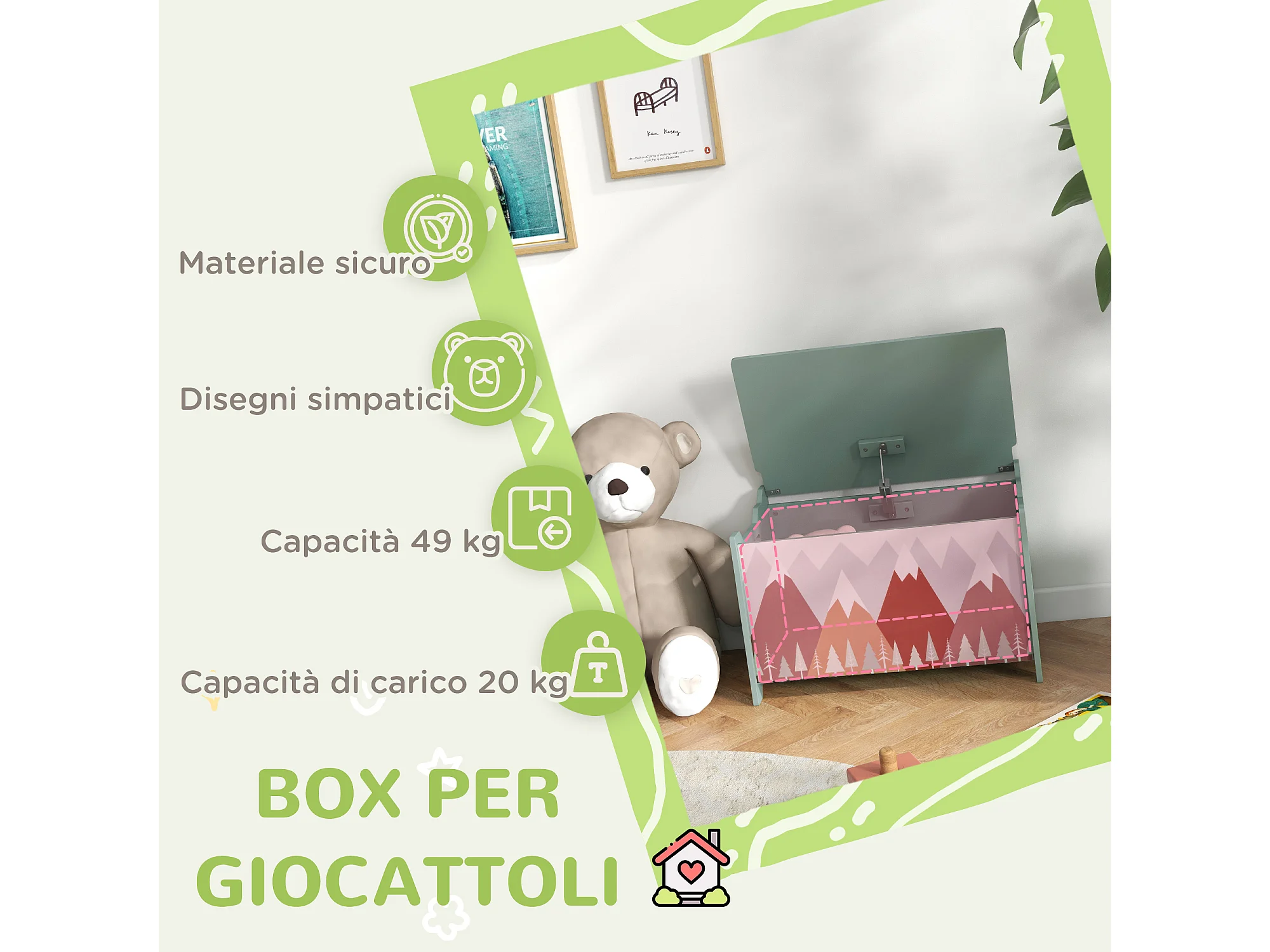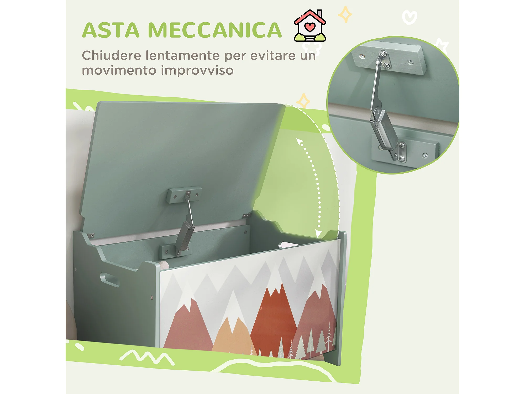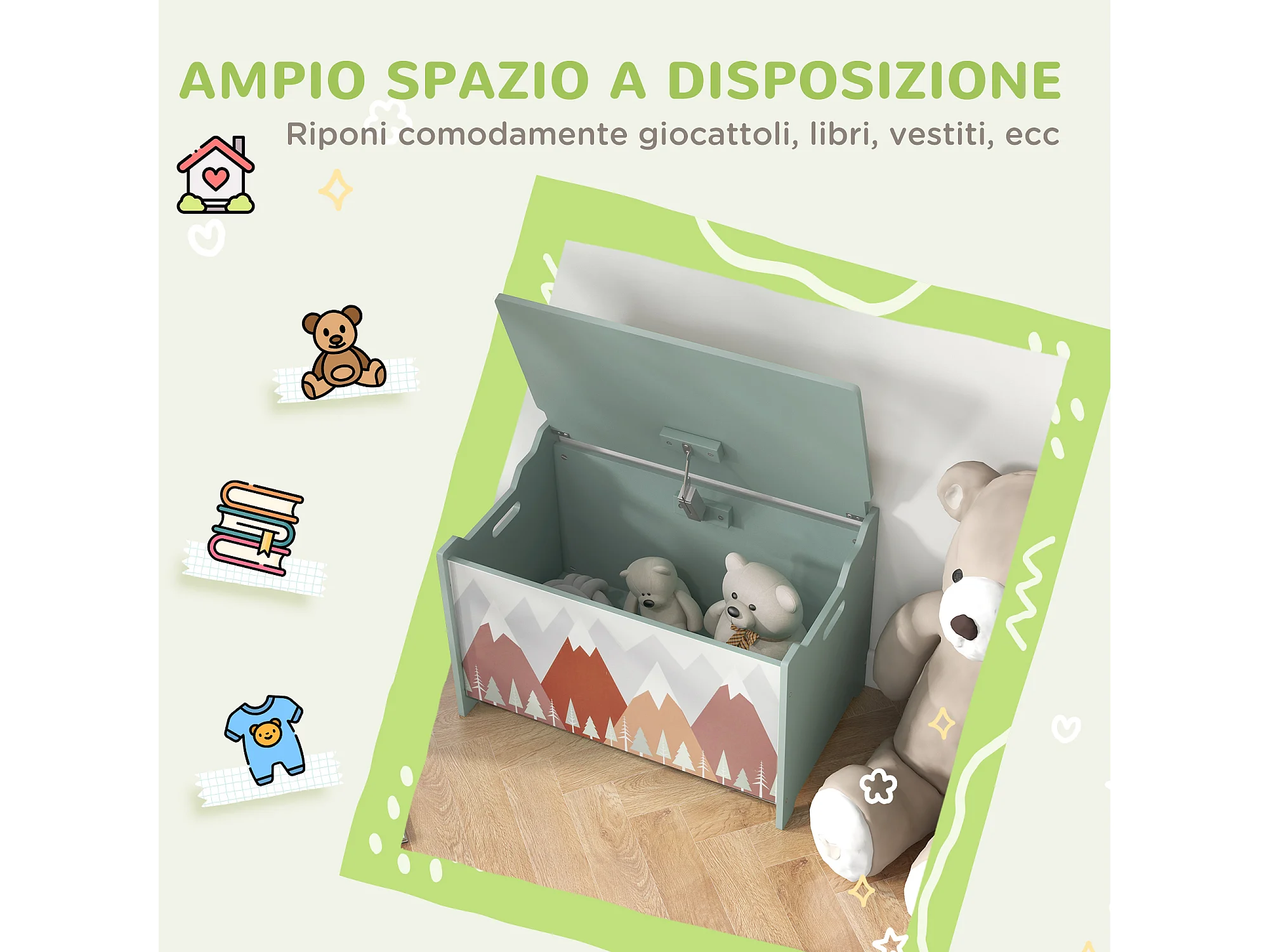Baule cassapanca portagiochi per bambini in mdf verde