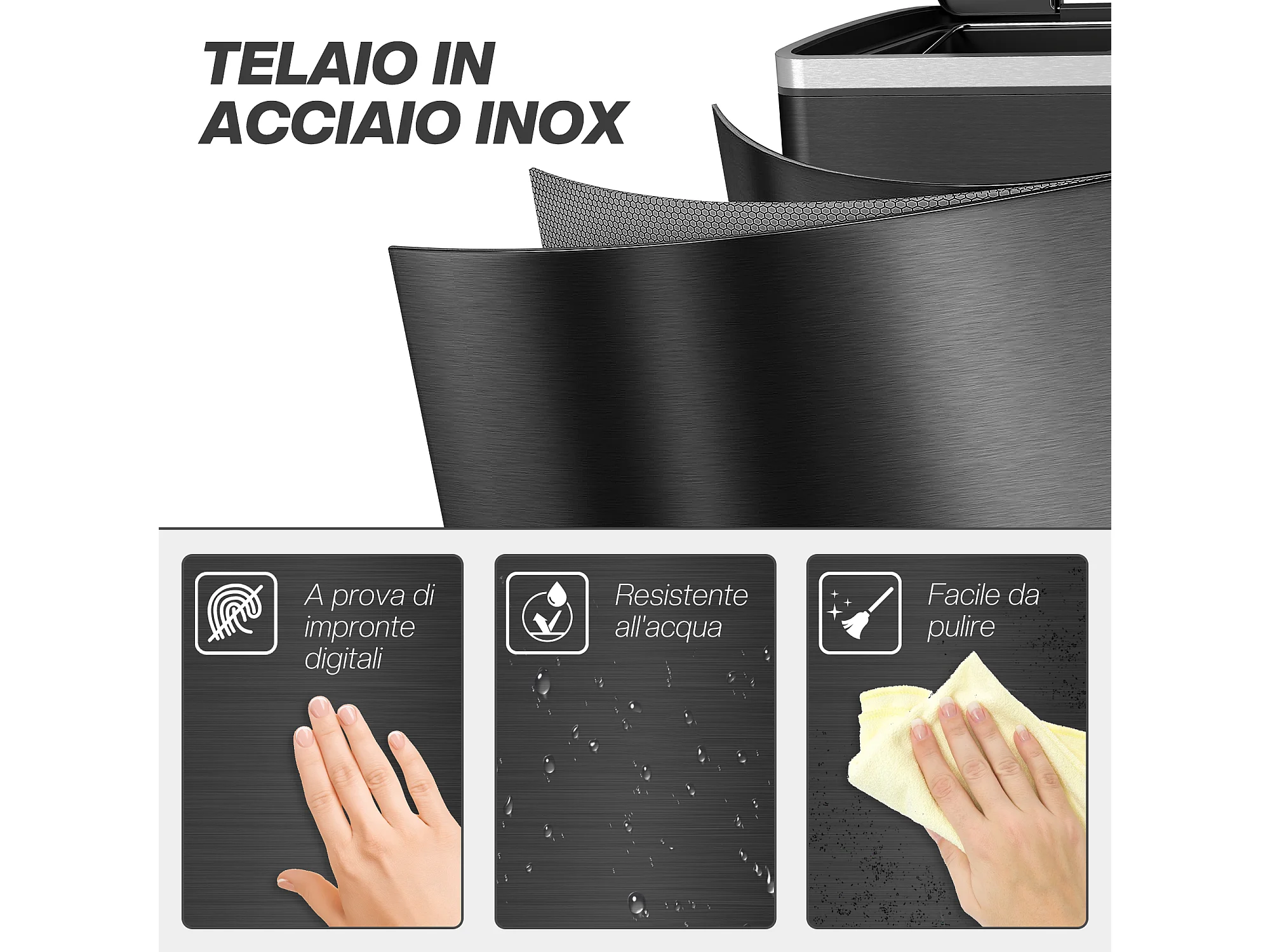 Bidone immondizia a 2 sezioni da 15l in acciaio e pp nero