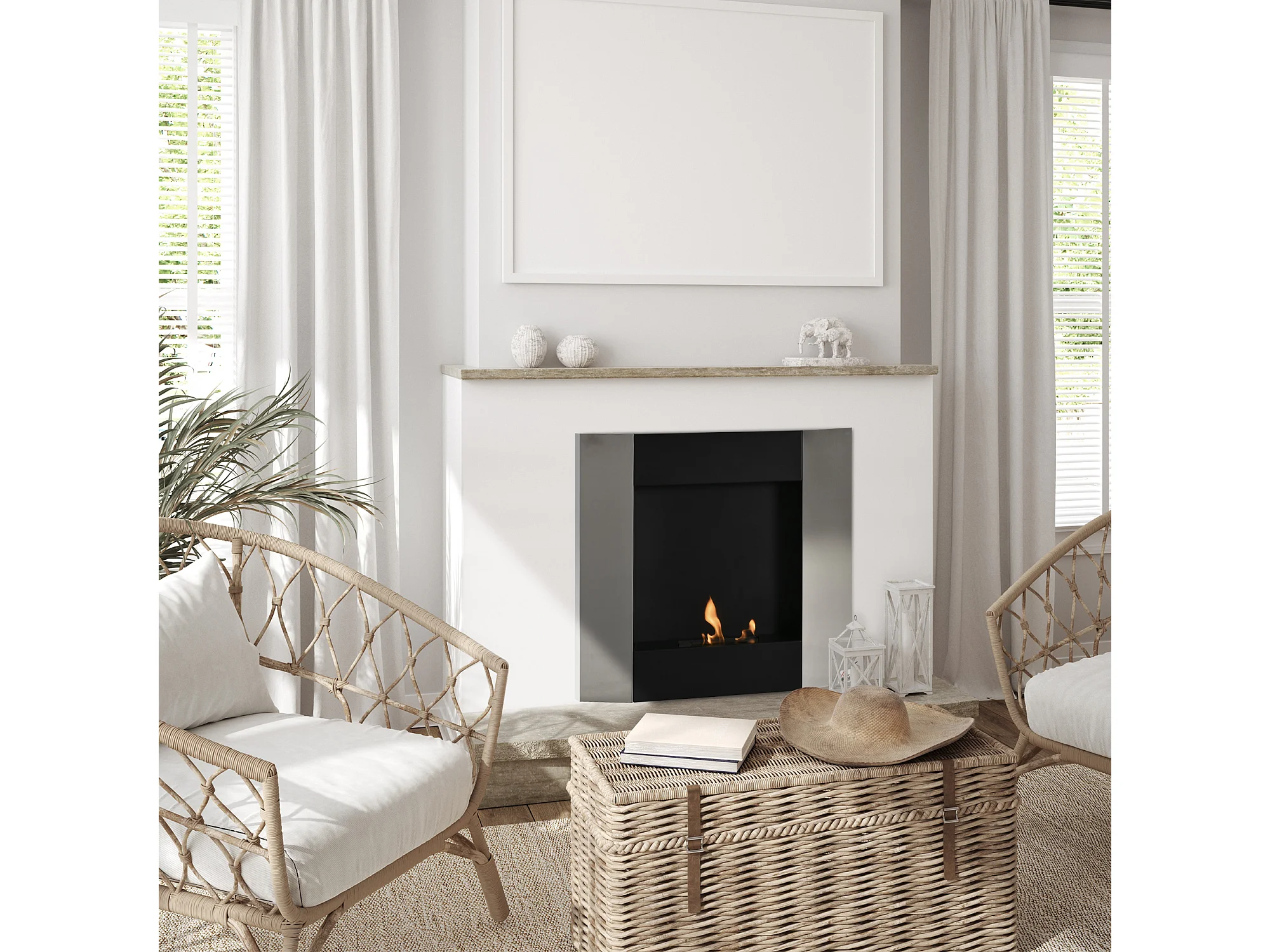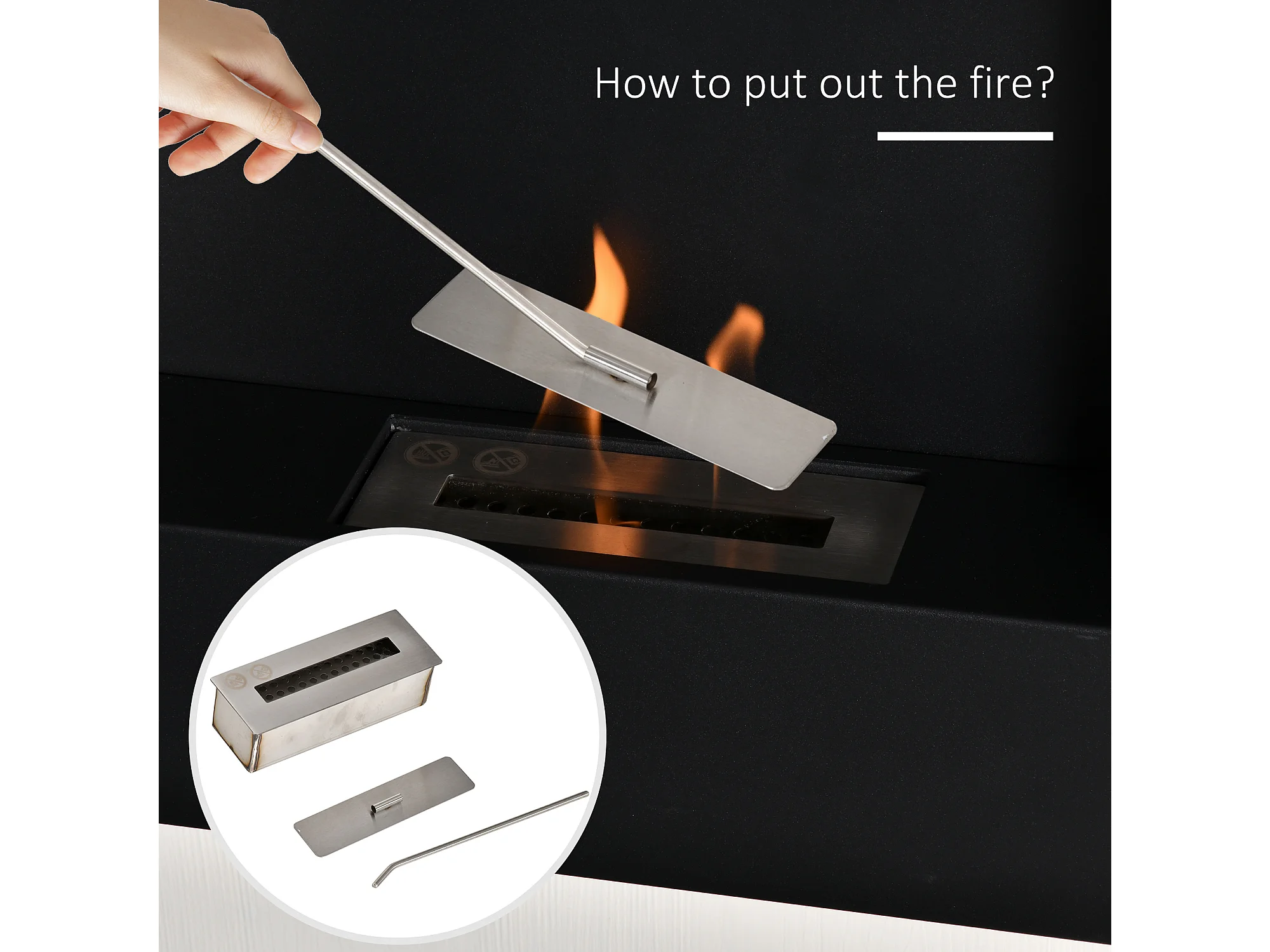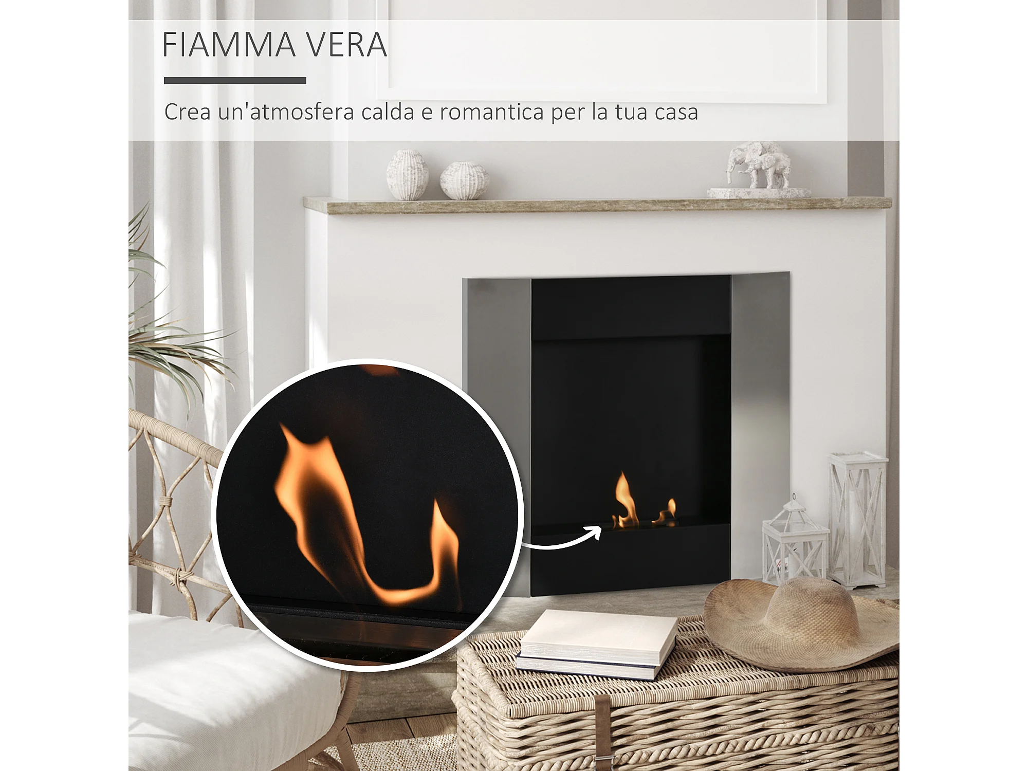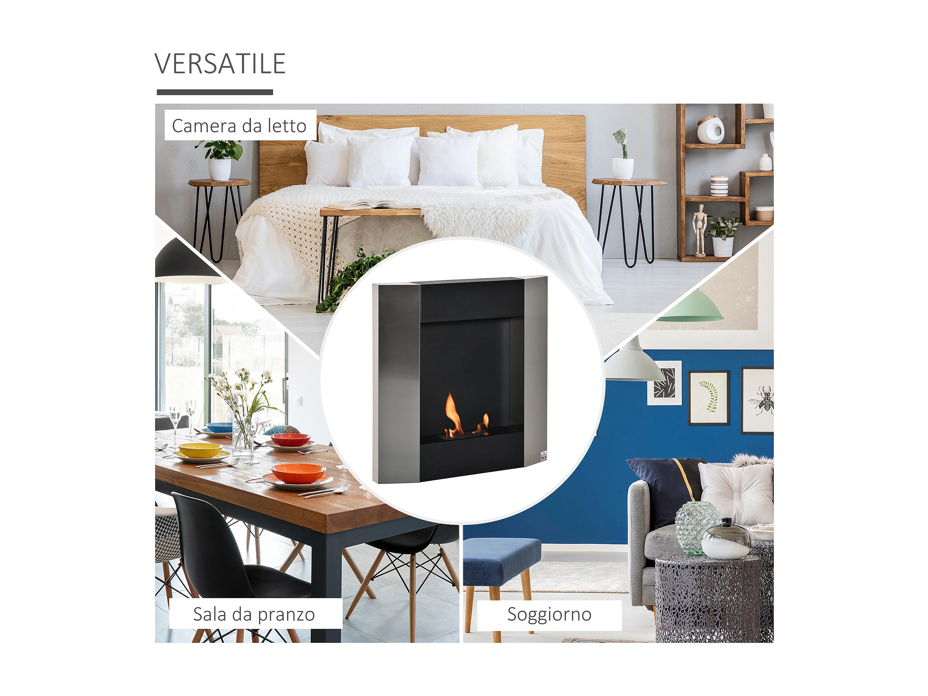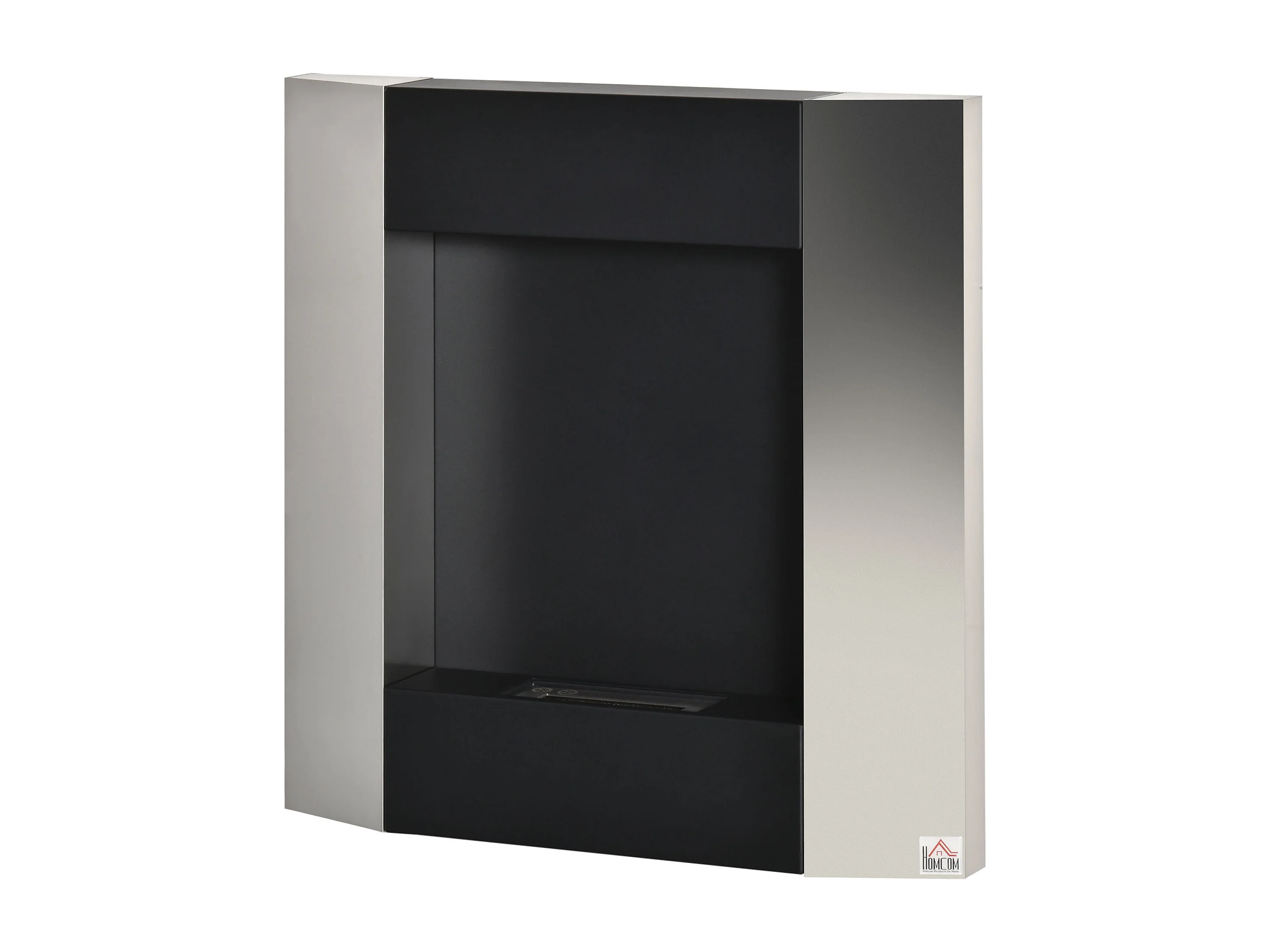 Camino a bioetanolo da interno con pannello in vetro e acciaio nero