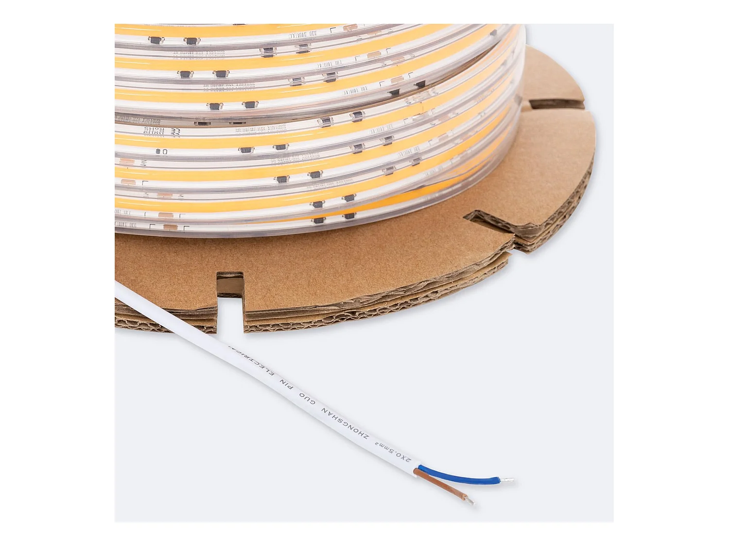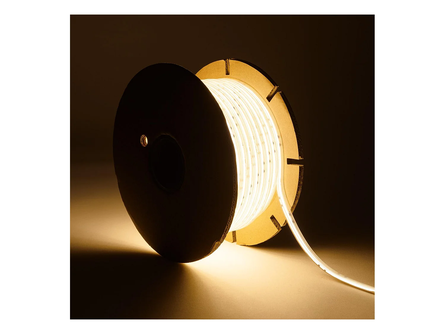 Bobina 50m Striscia LED Regolabile 220V COB Autorettificata 320 LED/m 8W/m 720 lm/m Larga 12mm IP65 CRI90 Taglio 50cm 2700K Bianco Caldo