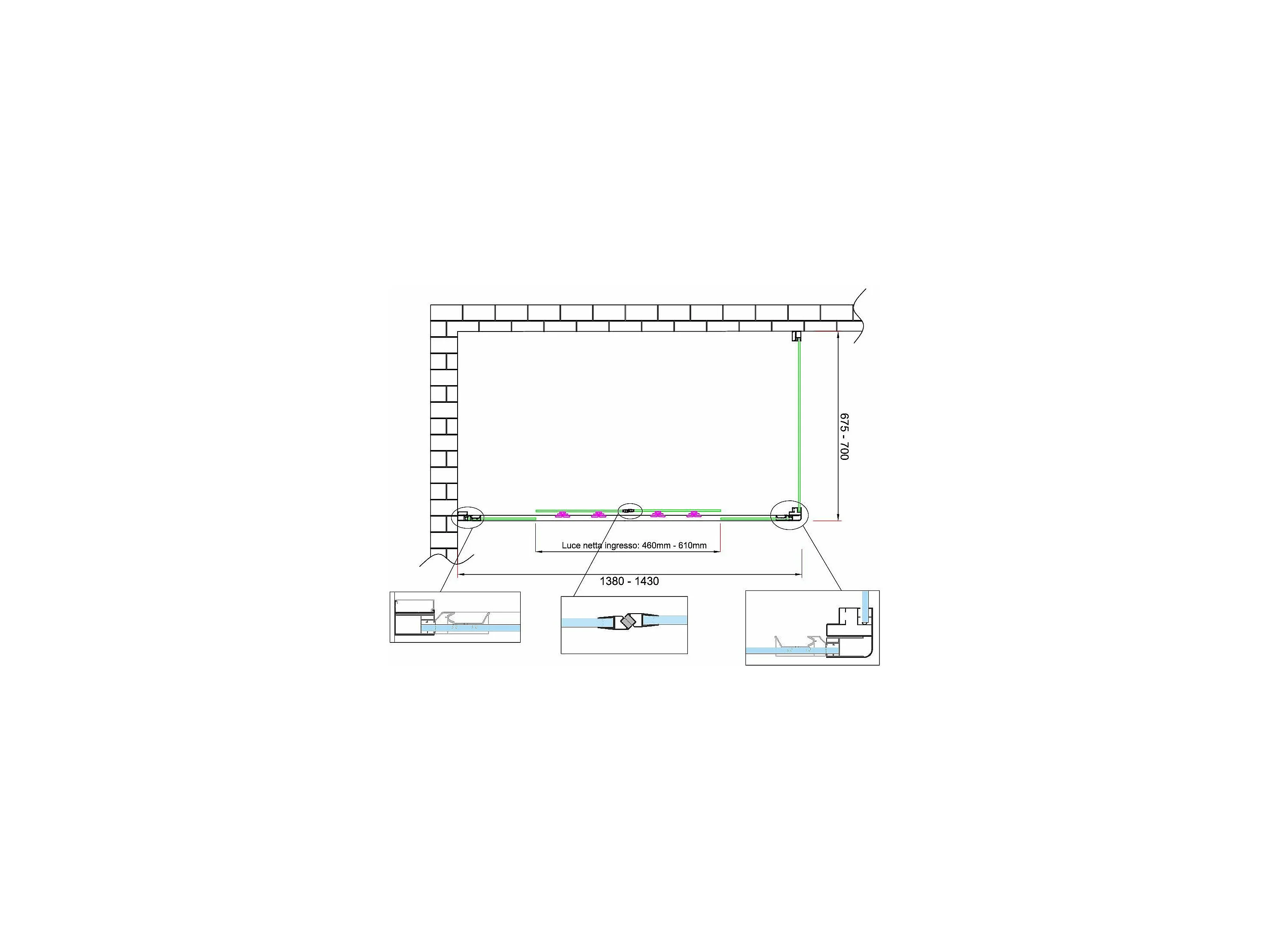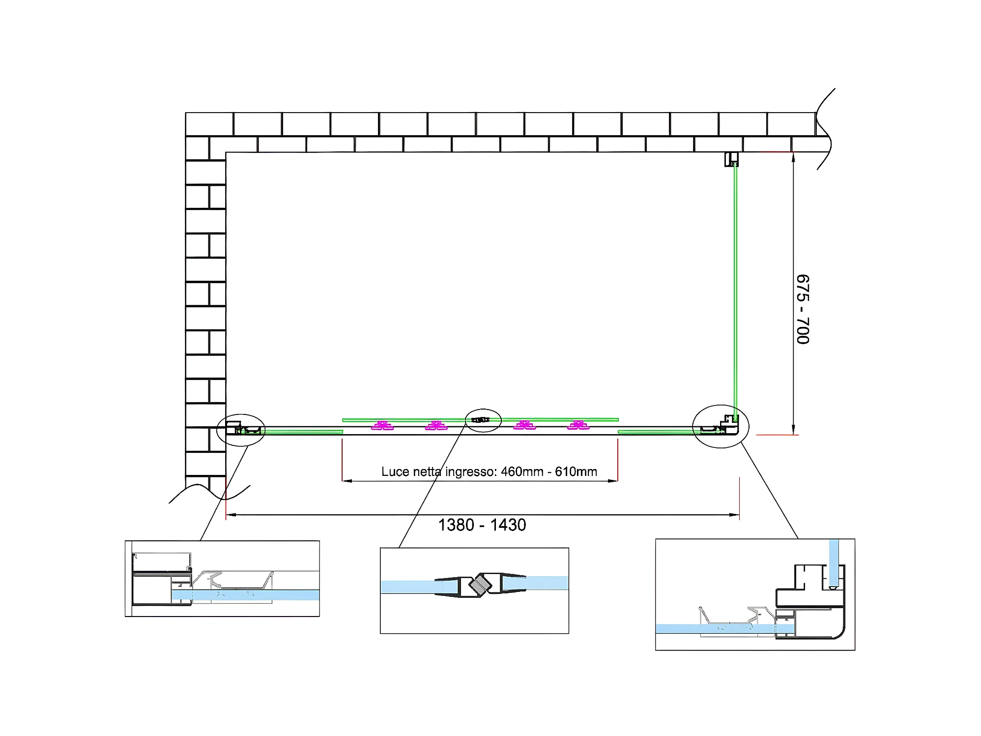 Box doccia 6 mm H 190 parete fissa e porta a 4 ante con apertura centrale MISURA 67,5-70 ANTA FISSA + PORTA 138-143