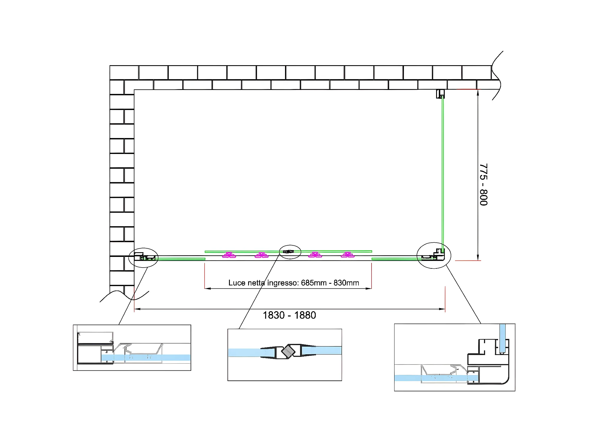 Box doccia 6 mm H 190 parete fissa e porta a 4 ante con apertura centrale MISURA 77,5-80 ANTA FISSA + PORTA 183-188