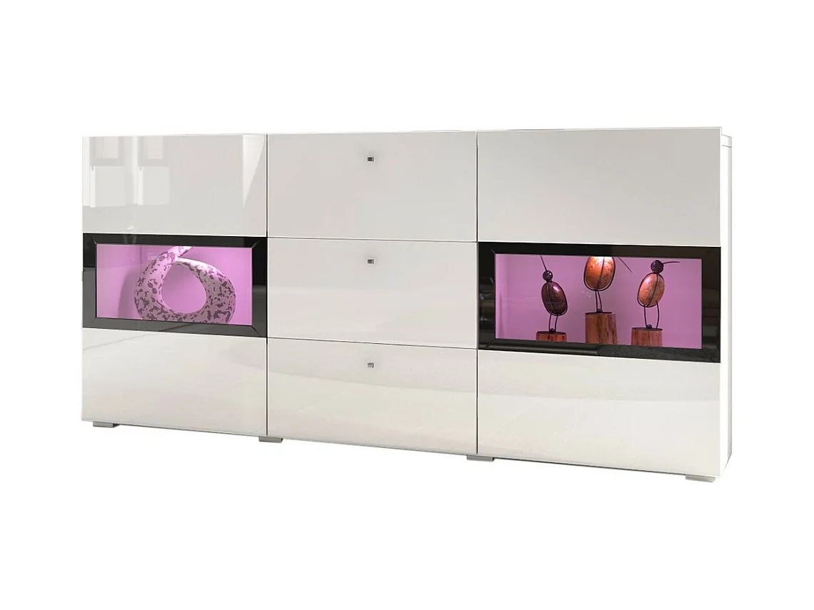 Credenza con 2 ante e 3 cassetti collezione RAMOS. Illuminazione LED integrata. Colori bianco lucido e nero.