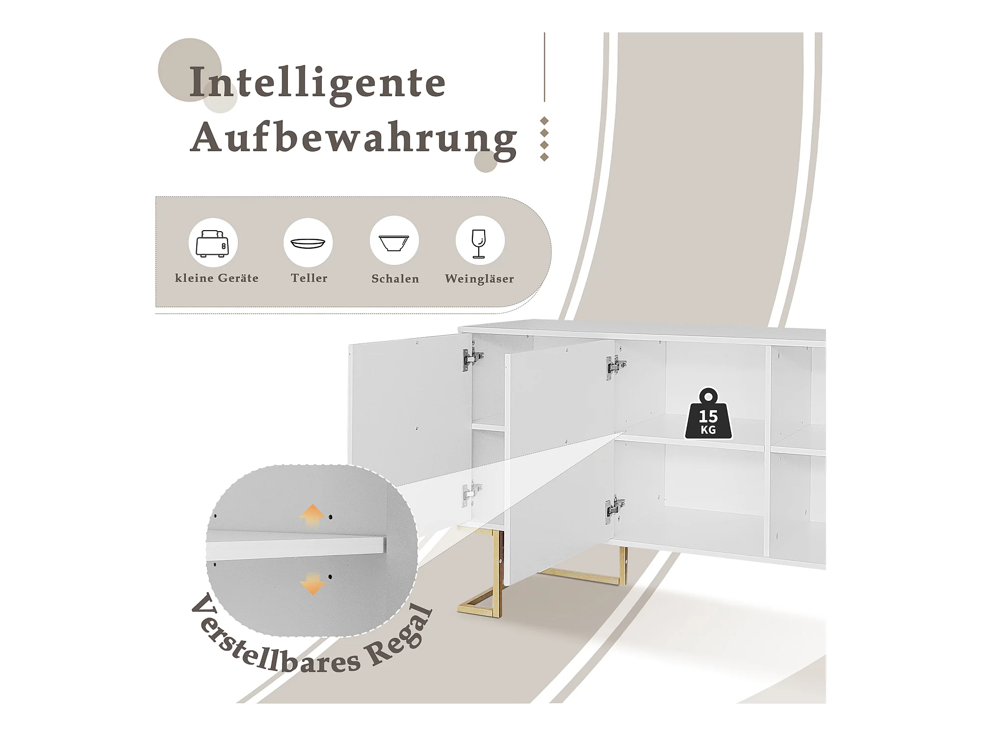 Buffet 4 porte MDF bianco rangement modulabile poignées dorées 160x40x80,5 cm moderno