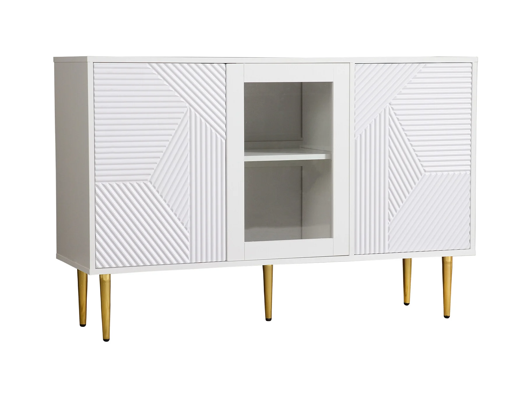 Buffet basso bianco 120 cm in pannello di legno con porte in vetro e piedi in metallo – stile moderno