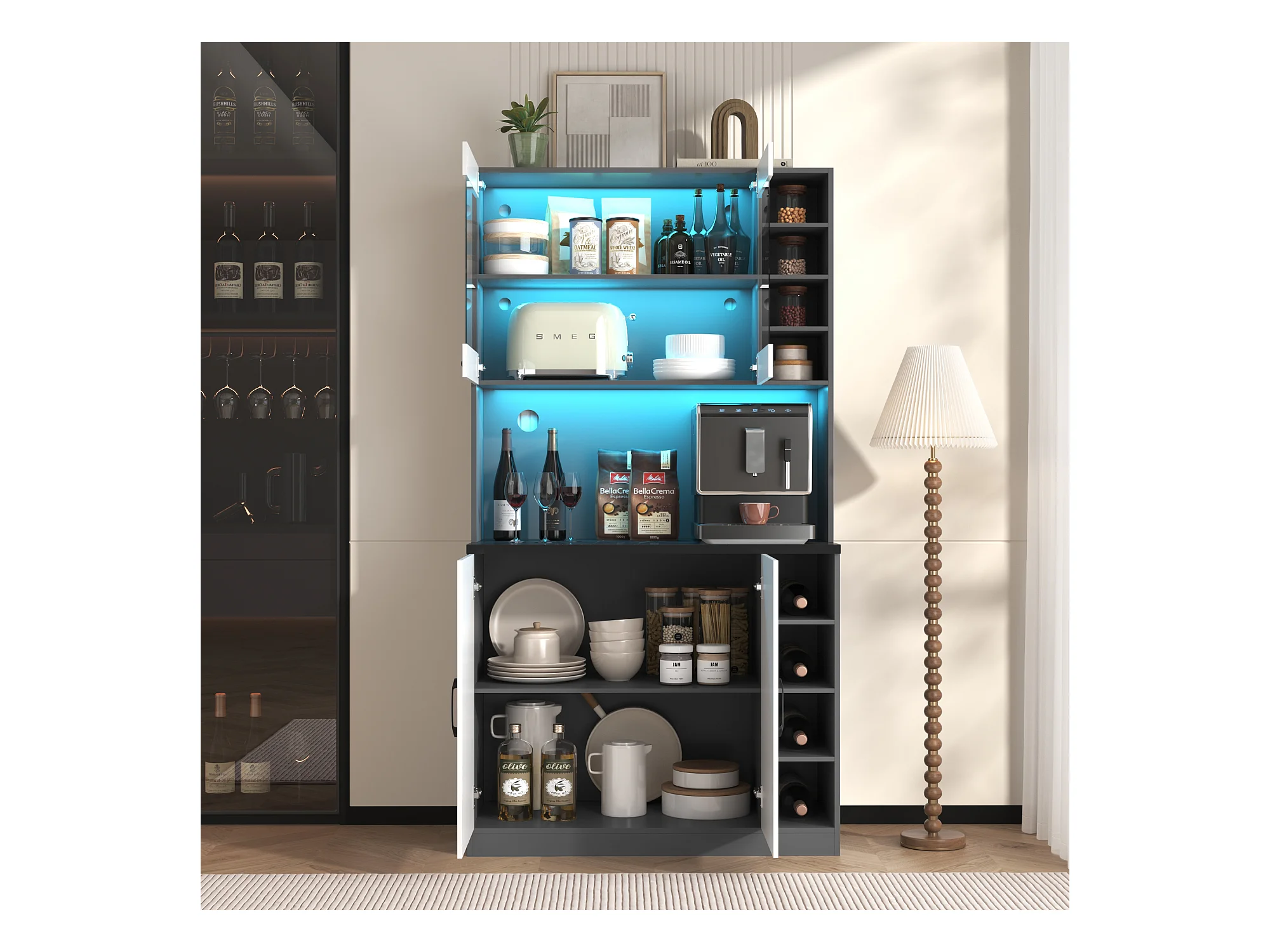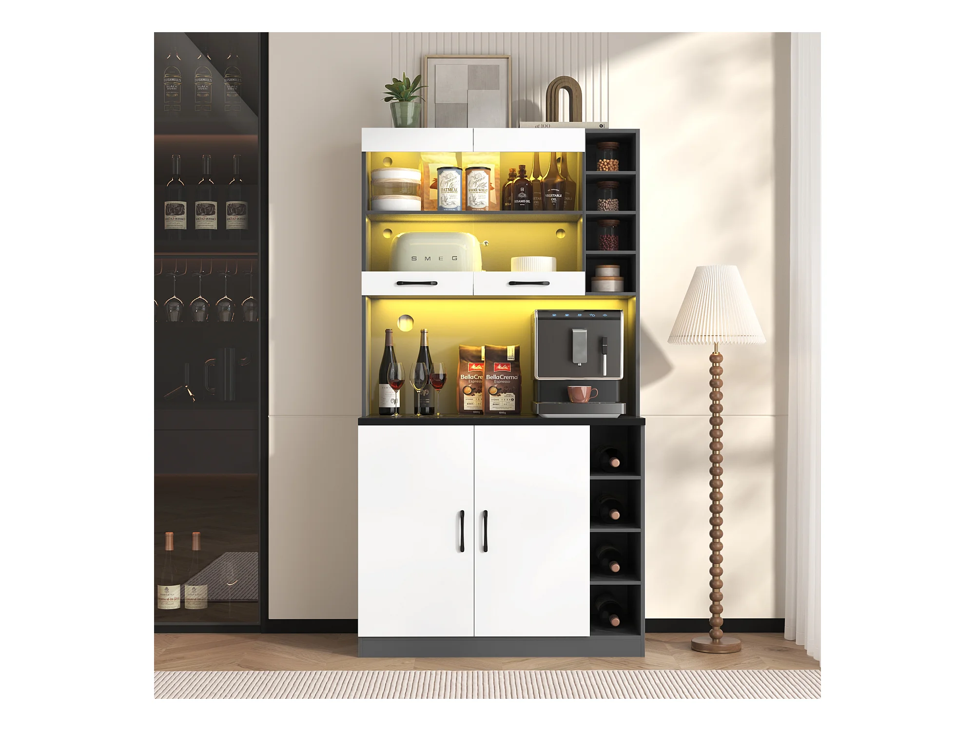 Buffet cucina 100x47x187cm MDF LED rangement micro-ondes meuble moderne gris blanc