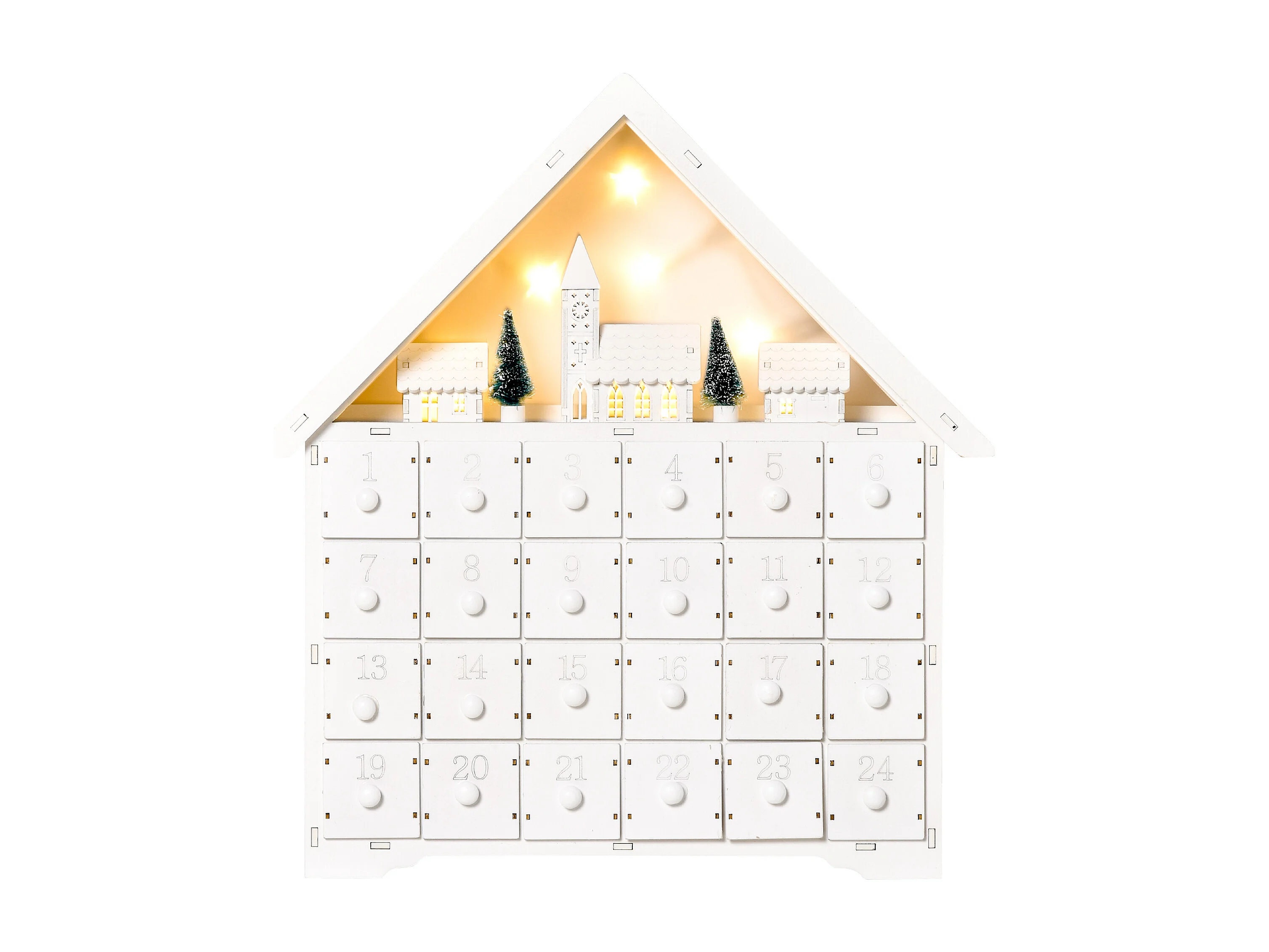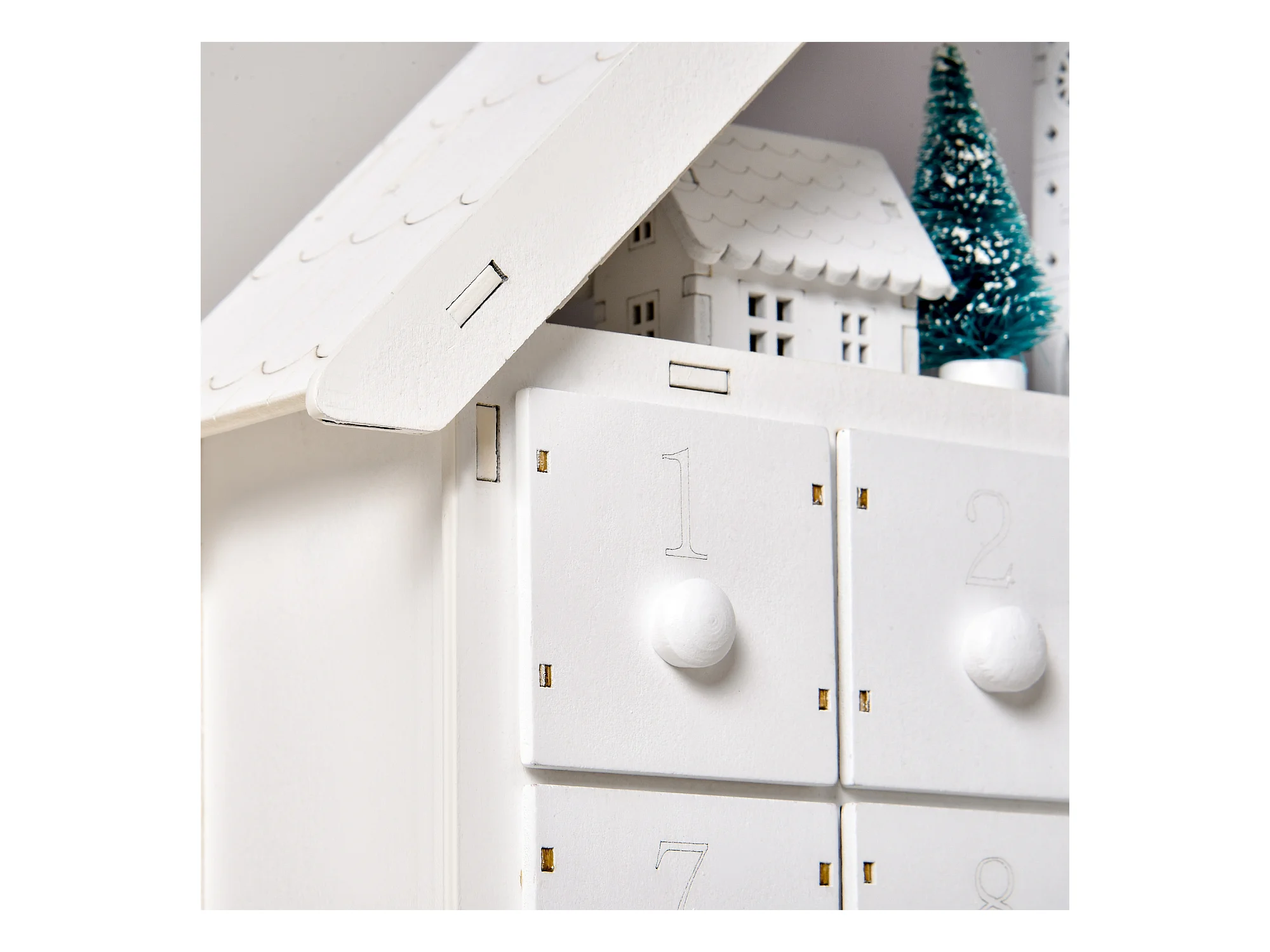 Calendario Avvento in Legno Bianco con 24 Cassetti e Luci Idee Regalo
