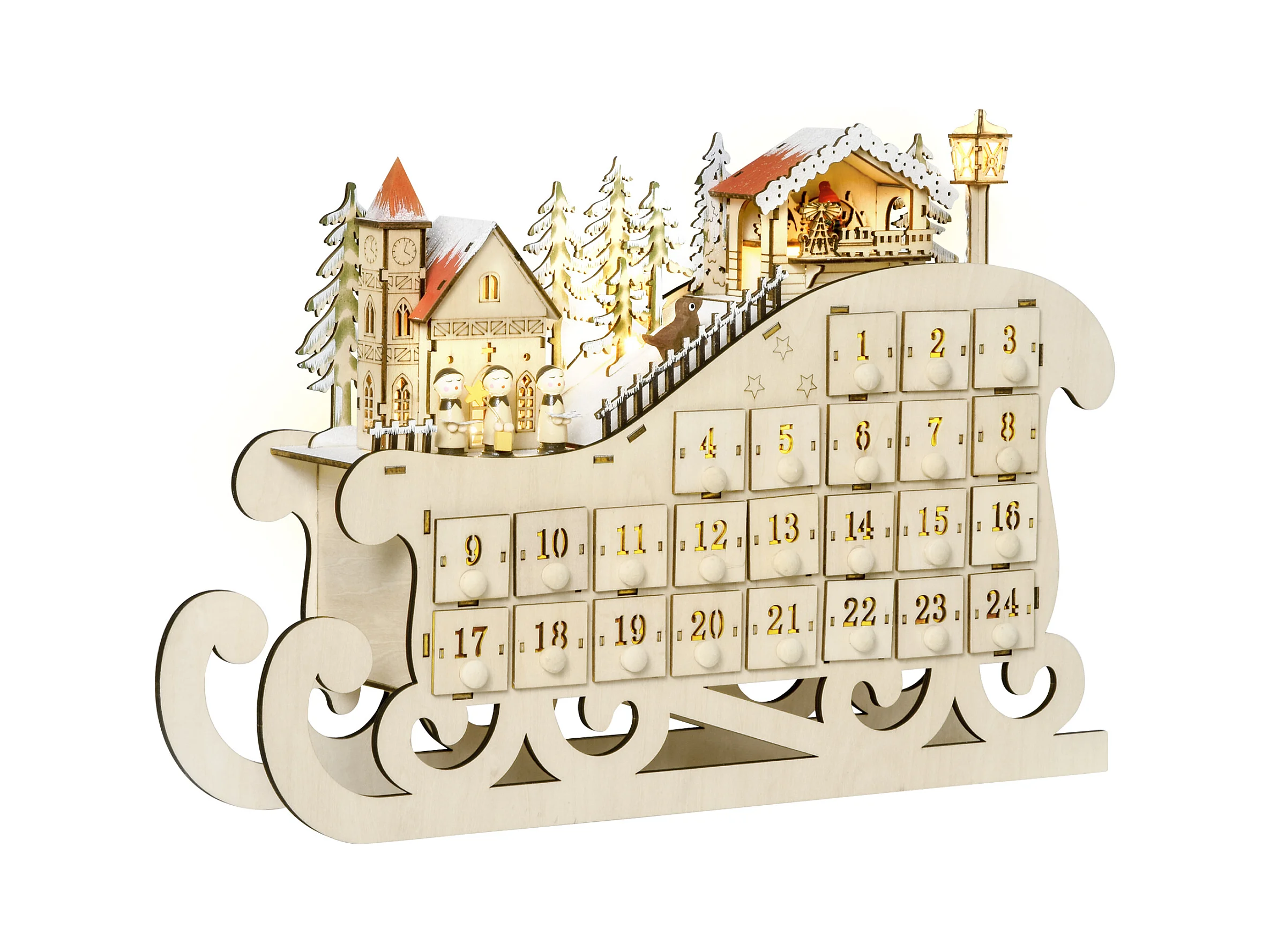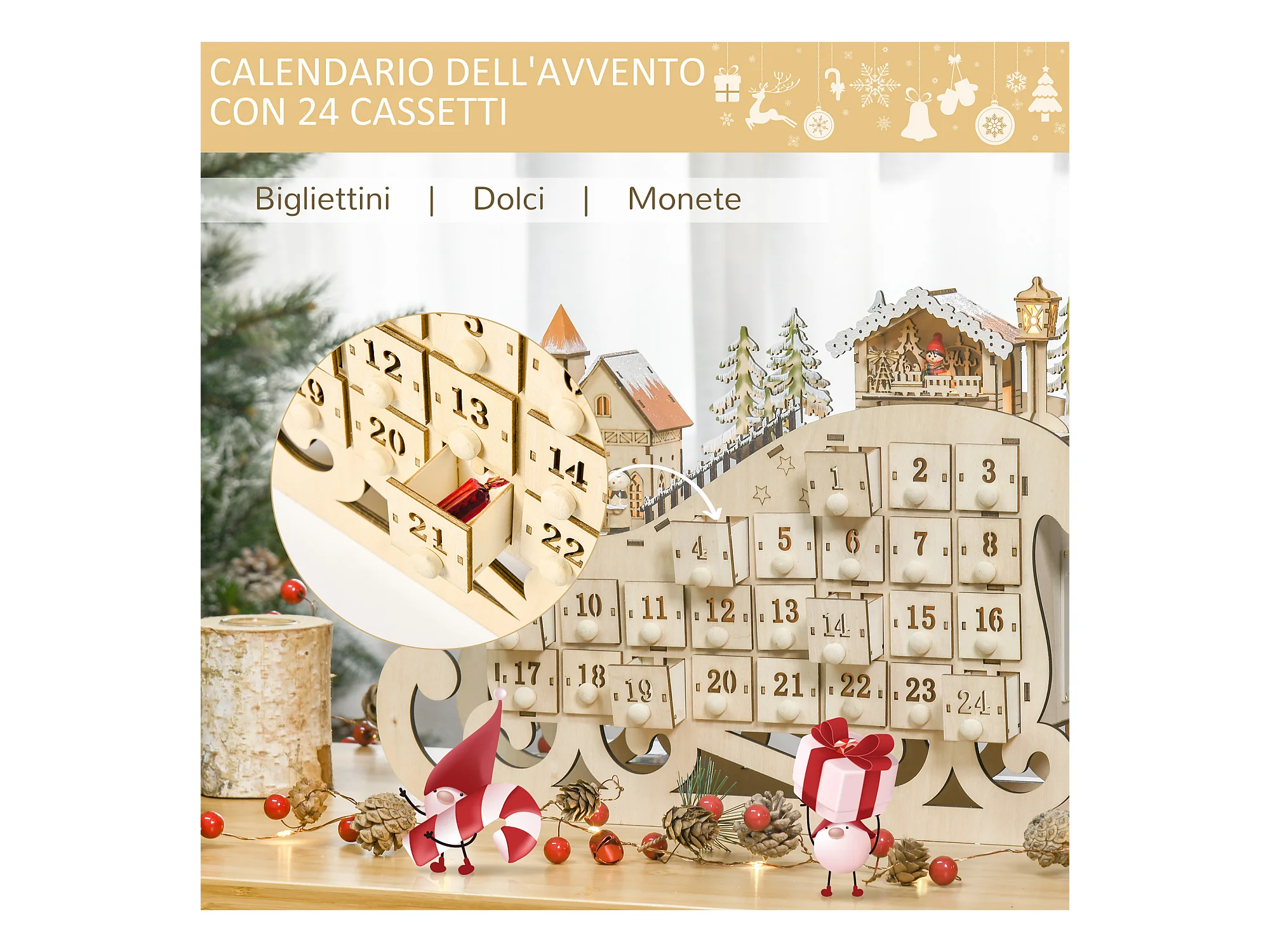 Calendario dell'avvento in legno 24 cassetti villaggio e luci