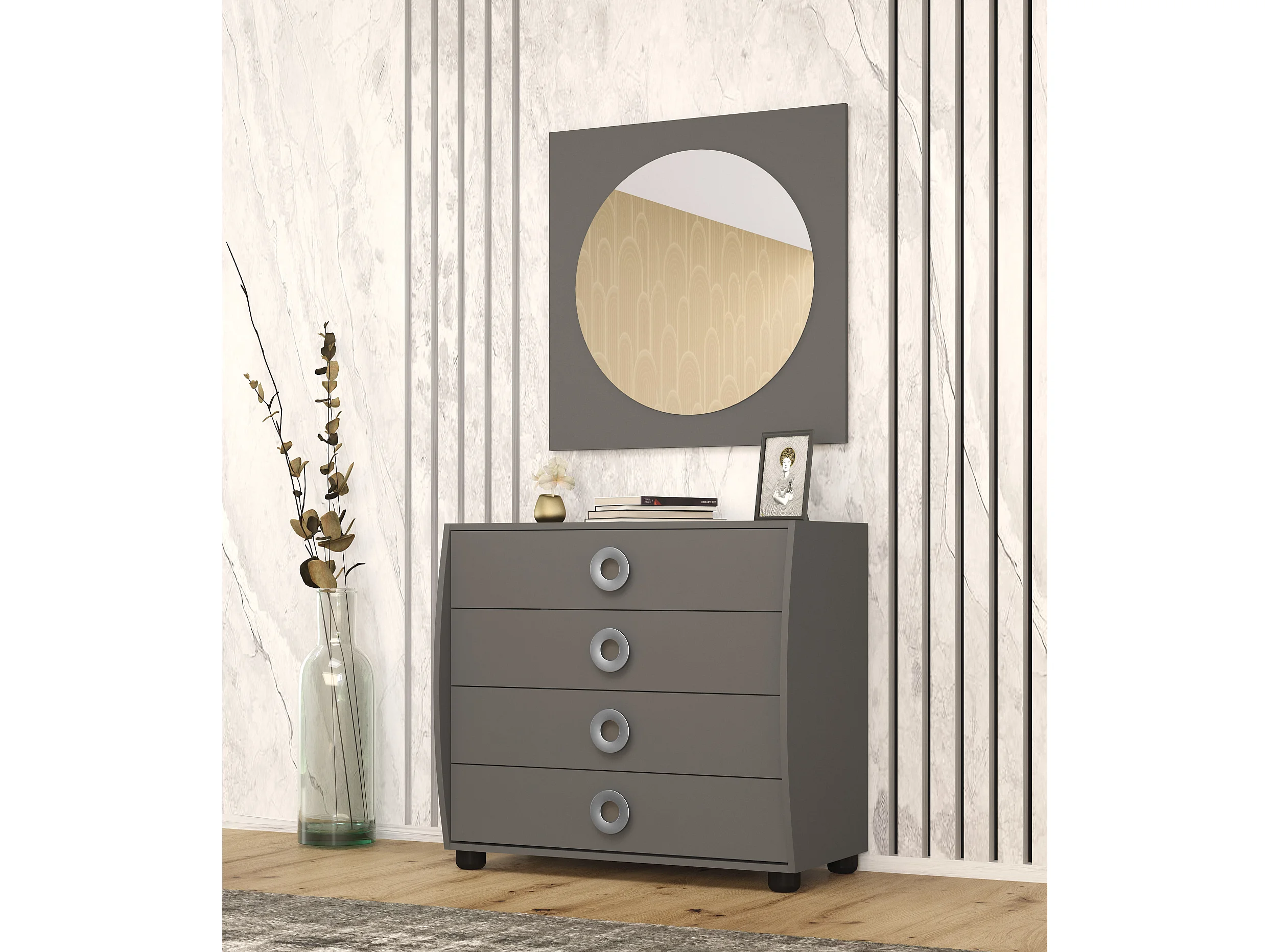 Camera da letto completa 160x200 con comò design moderno effetto legno rovere e antracite CMG45