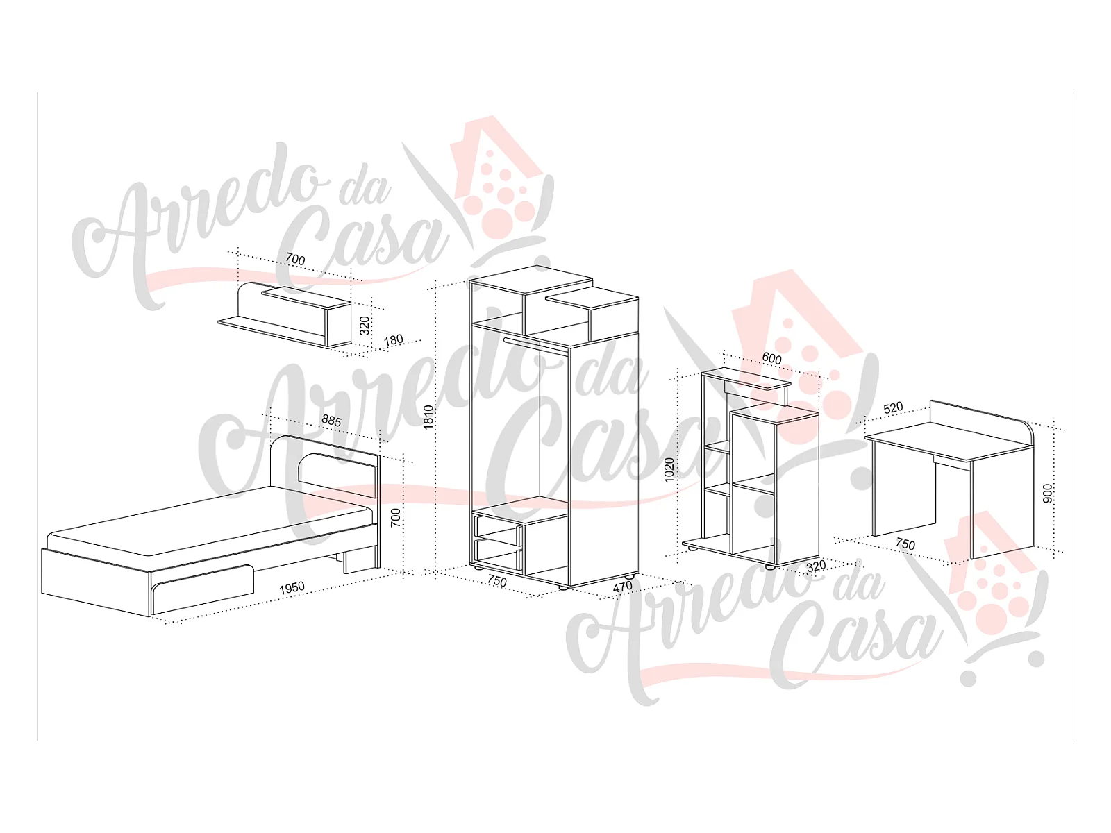 Cameretta moderna completa con letto contenitore 82x190 cm grigia/beige/arancio CBG3